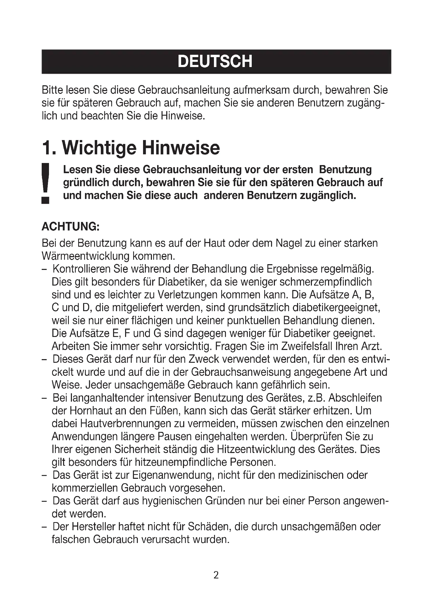 Lesen Sie diese Gebrauchsanleitung vor der ersten Benutzung gründlich durch, bewahren Sie sie für den späteren Gebrauch auf und machen Sie diese auch anderen Benutzern zugänglich. ACHTUNG: Bei der Benutzung kann es auf der Haut oder dem Nagel zu einer starken Wärmeentwicklung kommen. – Kontrollieren Sie während der Behandlung die Ergebnisse regelmäßig. Dies gilt besonders für Diabetiker, da sie weniger schmerzempfindlich sind und es leichter zu Verletzungen kommen kann. Die Aufsätze A, B, C und D, die mitgeliefert werden, sind grundsätzlich diabetikergeeignet, weil sie nur einer flächigen und keiner punktuellen Behandlung dienen. Die Aufsätze E, F und G sind dagegen weniger für Diabetiker geeignet. Arbeiten Sie immer sehr vorsichtig. Fragen Sie im Zweifelsfall Ihren Arzt. – Dieses Gerät darf nur für den Zweck verwendet werden, für den es entwi- ckelt wurde und auf die in der Gebrauchsanweisung angegebene Art und Weise. Jeder unsachgemäße Gebrauch kann gefährlich sein. – Bei langanhaltender intensiver Benutzung des Gerätes, z.B. Abschleifen der Hornhaut an den Füßen, kann sich das Gerät stärker erhitzen. Um dabei Hautverbrennungen zu vermeiden, müssen zwischen den einzelnen Anwendungen längere Pausen eingehalten werden. Überprüfen Sie zu Ihrer eigenen Sicherheit ständig die Hitzeentwicklung des Gerätes. Dies gilt besonders für hitzeunempfindliche Personen. – Das Gerät ist zur Eigenanwendung, nicht für den medizinischen oder kommerziellen Gebrauch vorgesehen. – Das Gerät darf aus hygienischen Gründen nur bei einer Person angewen- det werden. – Der Hersteller haftet nicht für Schäden, die durch unsachgemäßen oder falschen Gebrauch verursacht wurden.