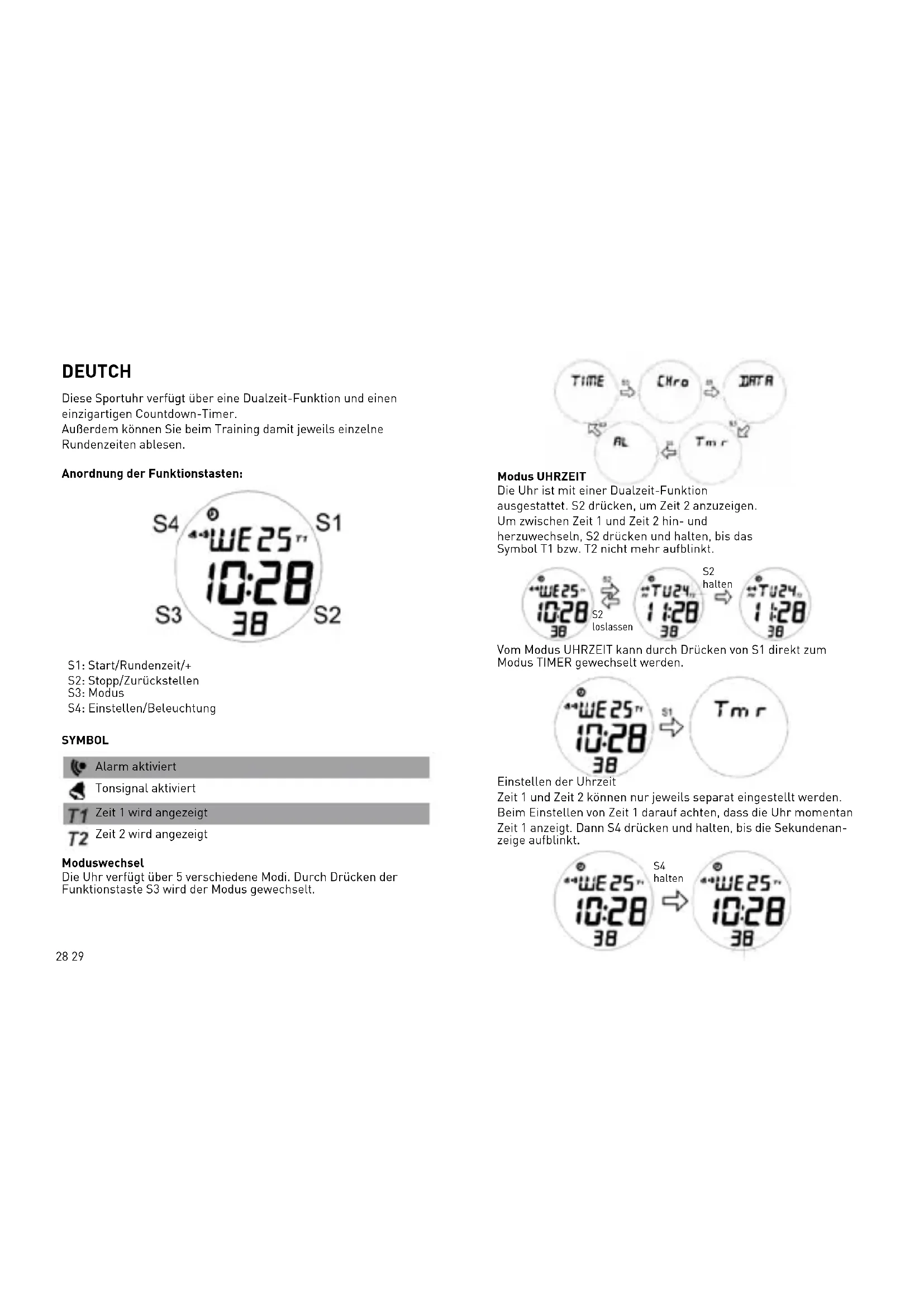 Diese Sportuhr verfügt über eine Dualzeit-Funktion und einen einzigartigen Countdown-Timer. Außerdem können Sie beim Training damit jeweils einzelne Rundenzeiten ablesen. Anordnung der Funktionstasten: S1: Start/Rundenzeit/+ S2: Stopp/Zurückstellen S3: Modus S4: Einstellen/Beleuchtung SYMBOL Moduswechsel Die Uhr verfügt über 5 verschiedene Modi. Durch Drücken der Funktionstaste S3 wird der Modus gewechselt. Modus UHRZEIT Die Uhr ist mit einer Dualzeit-Funktion ausgestattet. S2 drücken, um Zeit 2 anzuzeigen. Um zwischen Zeit 1 und Zeit 2 hin- und herzuwechseln, S2 drücken und halten, bis das Symbol T1 bzw. T2 nicht mehr aufblinkt. Vom Modus UHRZEIT kann durch Drücken von S1 direkt zum Modus TIMER gewechselt werden. Einstellen der Uhrzeit Zeit 1 und Zeit 2 können nur jeweils separat eingestellt werden. Beim Einstellen von Zeit 1 darauf achten, dass die Uhr momentan Zeit 1 anzeigt. Dann S4 drücken und halten, bis die Sekundenan- zeige aufblinkt. Alarm aktiviert Tonsignal aktiviert Zeit 1 wird angezeigt Zeit 2 wird angezeigt