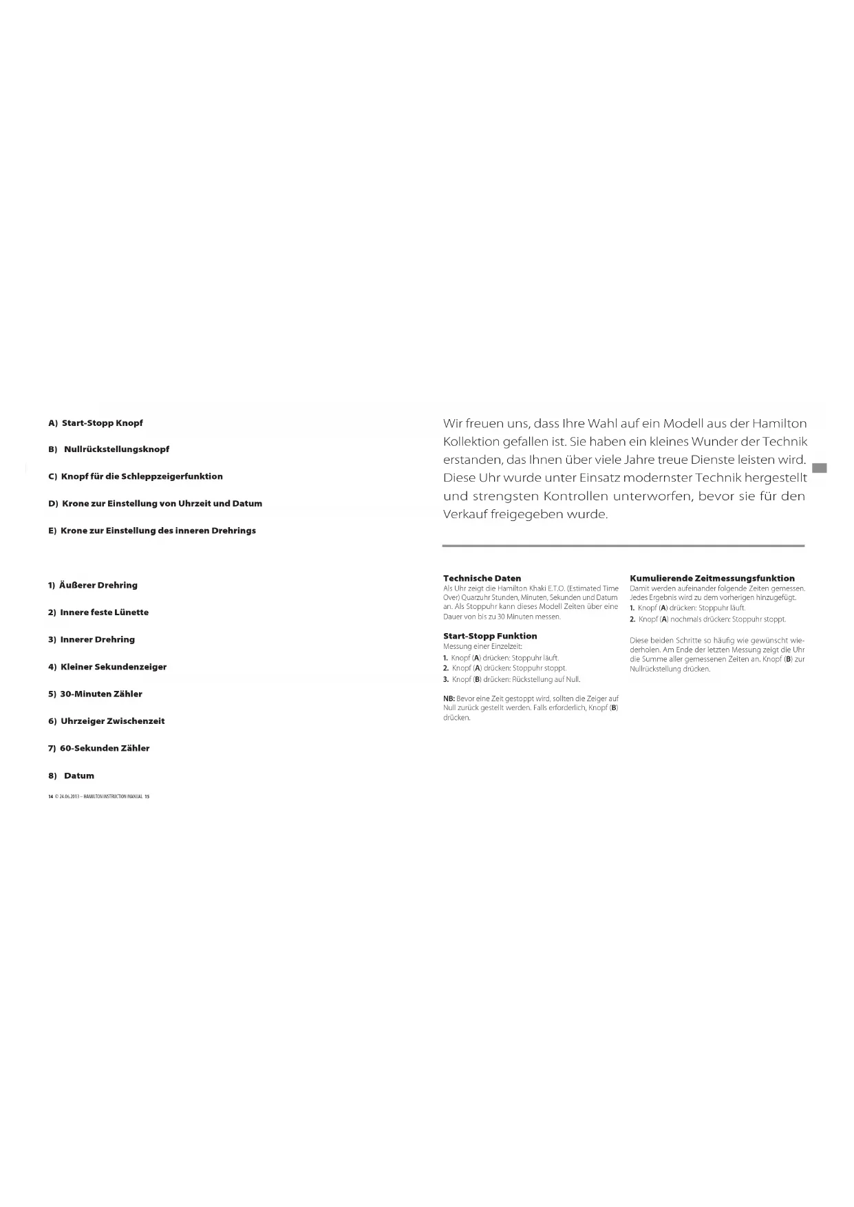 Drehring (1) gegenüber dem roten Pfeil ablesen = 17,5 mph. Einstellung von Zeitzone und Datum Wenn die Krone (D) in Zwischenstellung (1) herausge- zogen ist, kann der Stundenzeiger in beide Richtungen eingestellt werden, ohne die Einstellung des Minuten- und Sekundenzeigers zu verstellen. Die Korrektur des Datums erfolgt jeweils wenn der Stundenzeiger über 12 Uhr Mitternacht geht. NB: Die Kronen (D) und (E) sind verschraubt, um optimale Wasserdichtigkeit zu gewährleisten. Sie müssen gelöst werden, bevor ein Zugri auf ihre jeweiligen Funktionen möglich ist. Nach jeder Nutzung für eine Einstellung sicher stellen, dass sie wieder verschraubt sind. Einstellung der Uhrzeit Wenn Krone (D) sich in Position (2) bendet, stoppen alle Uhrzeiger – einschließlich des Sekundenzeigers und die Stunden- und Minutenzeiger können nach Wunsch eingestellt werden. Nachstellung der Stoppuhr (Wenn die Zeiger nicht genau auf Null zeigen.) Wenn ein Zeiger der Stoppuhr läuft, Knopf (A) drücken, die Stoppuhr anhalten und anschließend Knopf (B) drücken: die Zeiger springen in die Ausgangsstellung zurück. Springen sie nicht genau auf Null zurück, kann jeder Zeiger folgendermaßen auf Null gestellt werden: 30-Minuten Zähler Bei Krone (D) in Position 1: Knopf (A) drücken 60 Sekunden Zeiger (weißer Zeiger – Schleppzeiger) Bei Krone (D) in Position 2: Knopf (A) drücken 60 Sekunden Zeiger (roter Zeiger – großer Sekundenzeiger) Bei Krone (D) in Position 2: Knopf (B) drücken Bemerkung: Die Zeiger können schneller vorgestellt werden, wenn der Knopf länger als eine Sekunde gedrückt wird. Wichtig: Die Krone nicht länger als 20 Minuten in Position 1 belassen, da dies zu Störungen der Zeiteinhaltungsfunktion führen könnte.20 © 24.06.2013 – HAMILTON INSTRUCTION MANUAL 21 Ci congratuliamo con Lei per aver acquistato un modello della collezione Hamilton. Lei ha acquistato una piccola meraviglia tecnologica che La servirà fedelmente per molti anni. Questo pezzo è stato costruito seguendo le tecnologie più avanzate e prima di essere messo in vendita è stato sottoposto ai test più rigorosi. Caratteristiche Utilizzato come orologio, il cronografo a quarzo Hamilton Khaki E.T.O. (Estimated Time Over) visualizza le ore, i minuti, i secondi e la data. Nella sua funzione di crono- grafo, questo modello puo’ cronometrare avvenimenti di durata no a 30 minuti. Funzione di Avvio – Arresto (Start - Stop) Per cronometrare un avvenimento singolo:
