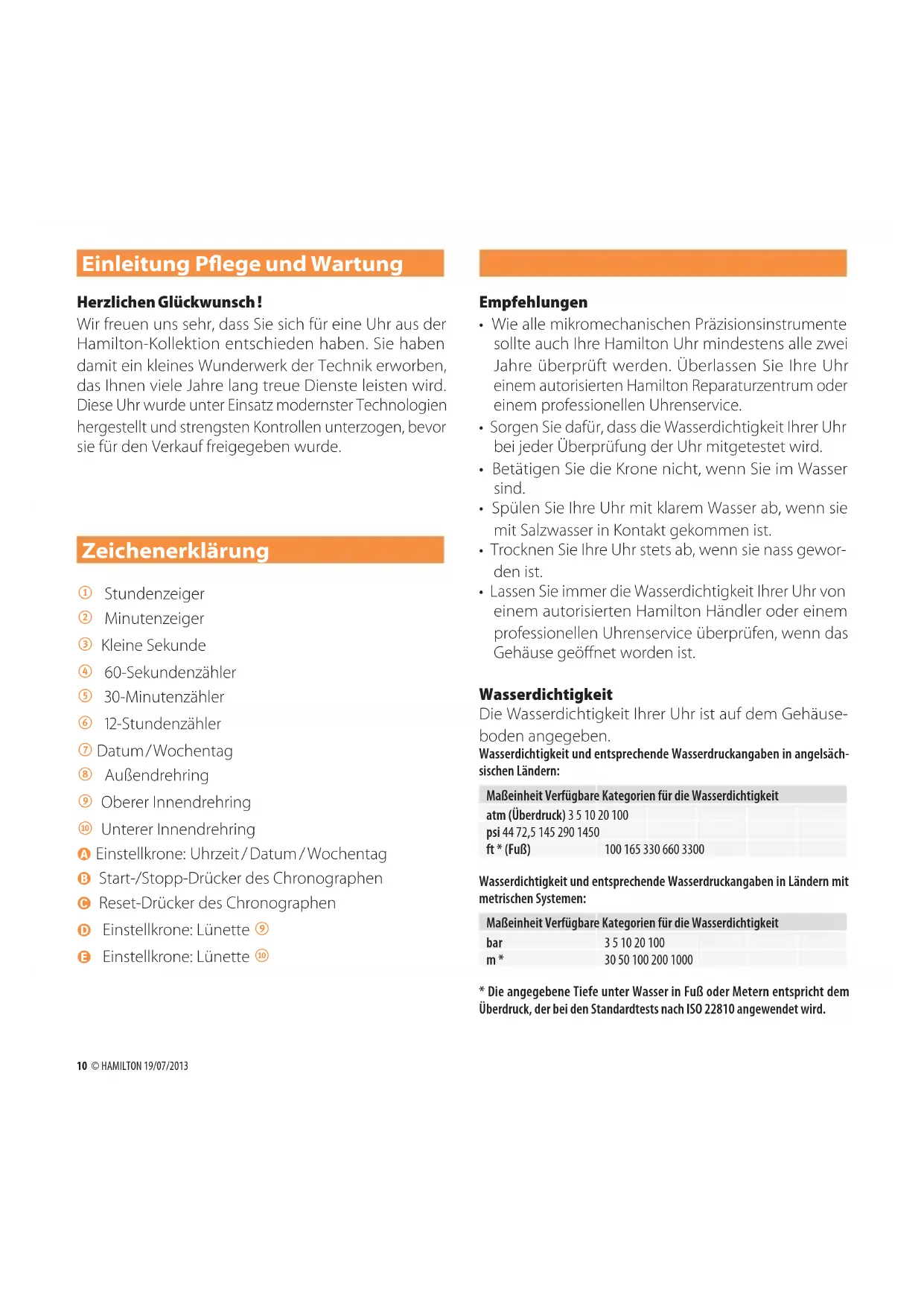 - Lassen Sie immer die Wasserdichtigkeit Ihrer Uhr von einem autorisierten Hamilton Händler oder einem professionellen Uhrenservice überprüfen, wenn das Gehäuse geönet worden ist. Wasserdichtigkeit Die Wasserdichtigkeit Ihrer Uhr ist auf dem Gehäuse- boden angegeben. Wasserdichtigkeit und entsprechende Wasserdruckangaben in angelsäch- sischen Ländern: Maßeinheit Verfügbare Kategorien für die Wasserdichtigkeit atm (Überdruck) 3 5 10 20 100 psi 44 72,5 145 290 1450 ft * (Fuß) 100 165 330 660 3300 Wasserdichtigkeit und entsprechende Wasserdruckangaben in Ländern mit metrischen Systemen: Maßeinheit Verfügbare Kategorien für die Wasserdichtigkeit bar 3 5 10 20 100 m * 30 50 100 200 1000