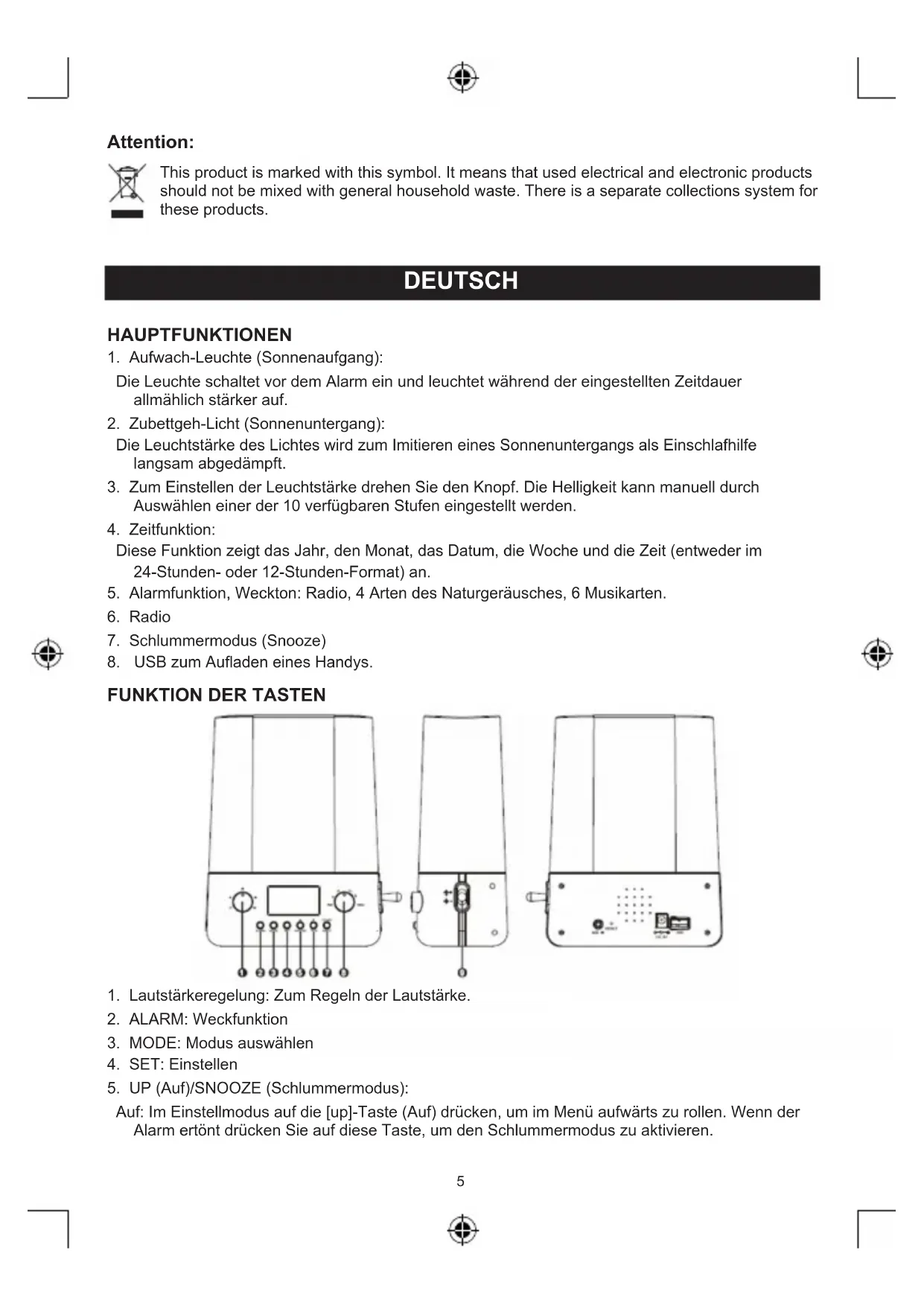 These Funktion zeigt das Jahr, den Monat, das Datum, die Woche und die Zeit (entweder im 24-Stunden- oder 12-Stunden-Format) an. - Alarmfungtion, Weckton: Radio, 4 Arten des Naturgerausches, 6 Musikarten.