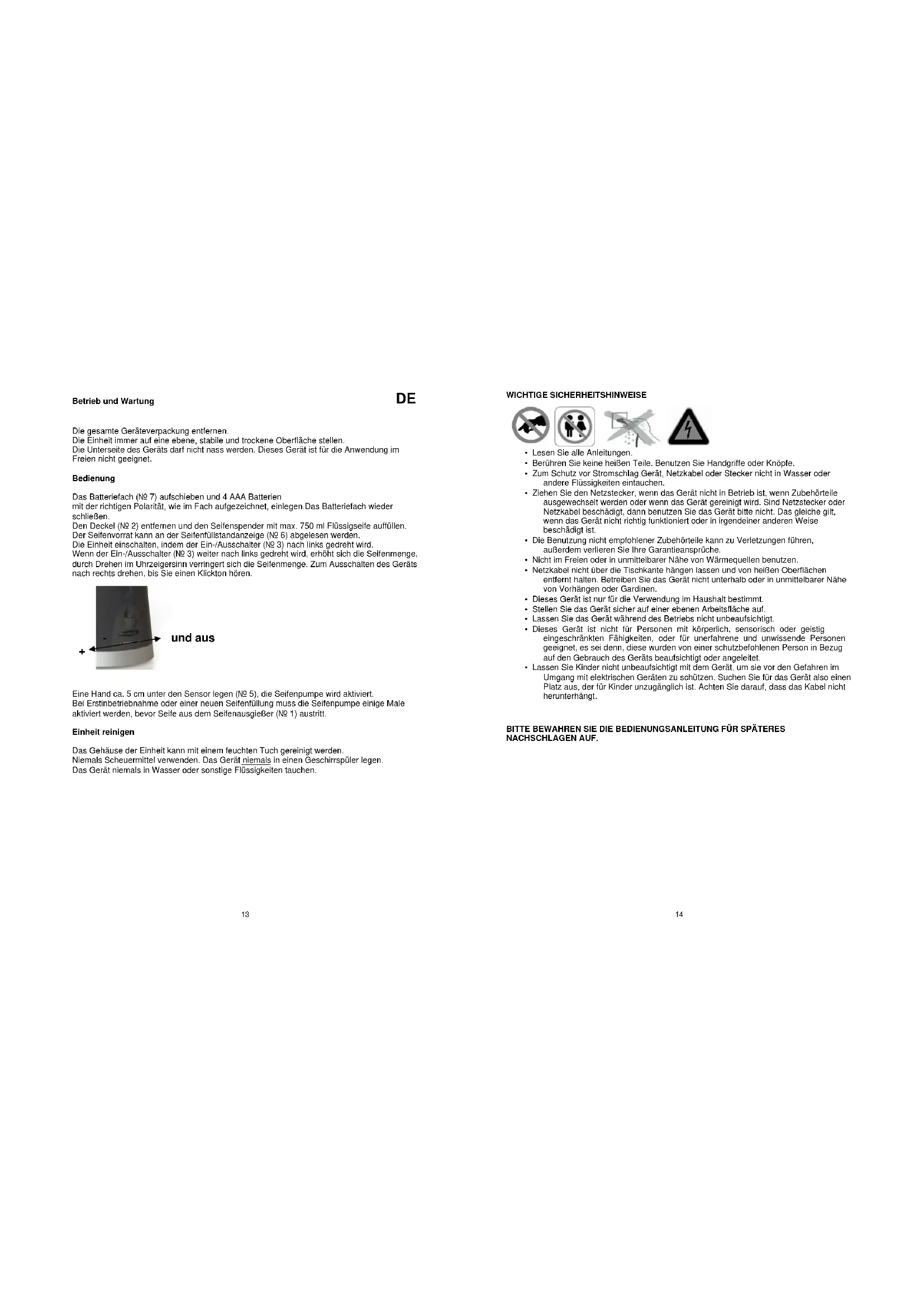Die gesamte Geräteverpackung entfernen. Die Einheit immer auf eine ebene, stabile und trockene Oberfläche stellen. Die Unterseite des Geräts darf nicht nass werden. Dieses Gerät ist für die Anwendung im Freien nicht geeignet. Bedienung Das Batteriefach (Nr. 7) aufschieben und 4 AAA Batterien mit der richtigen Polarität, wie im Fach aufgezeichnet, einlegen.Das Batteriefach wieder schließen. Den Deckel (Nr. 2) entfernen und den Seifenspender mit max. 750 ml Flüssigseife auffüllen. Der Seifenvorrat kann an der Seifenfüllstandanzeige (Nr. 6) abgelesen werden. Die Einheit einschalten, indem der Ein-/Ausschalter (Nr. 3) nach links gedreht wird. Wenn der Ein-/Ausschalter (Nr. 3) weiter nach links gedreht wird, erhöht sich die Seifenmenge, durch Drehen im Uhrzeigersinn verringert sich die Seifenmenge. Zum Ausschalten des Geräts nach rechts drehen, bis Sie einen Klickton hören.