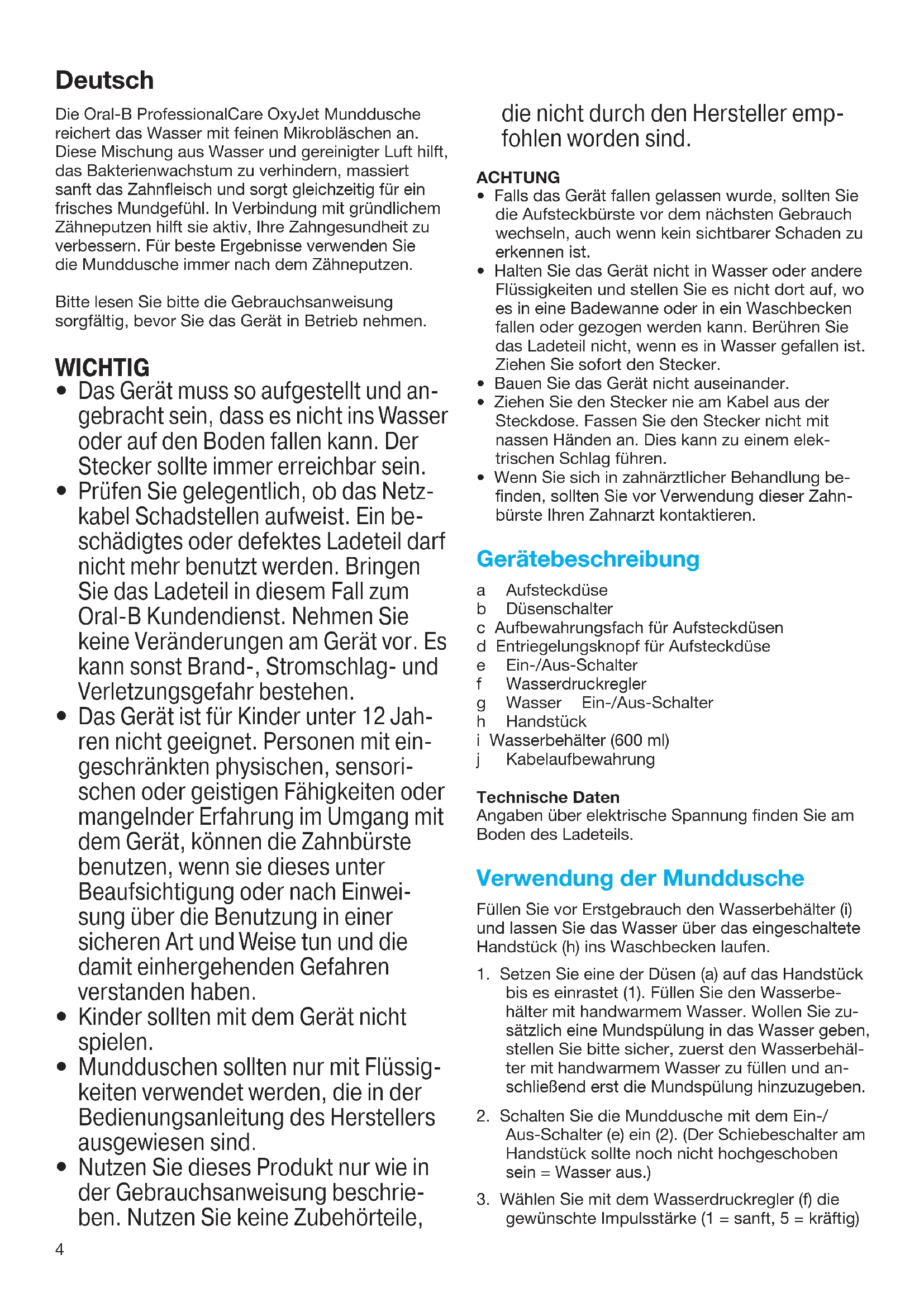- Wenn Sie sich in zahnärztlicher Behandlung be- finden, sollten Sie vor Verwendung dieser Zahn- bürste Ihren Zahnarzt kontaktieren. Gerätebeschreibung a Aufsteckdüse b Düsenschalter c Aufbewahrungsfach für Aufsteckdüsen d Entriegelungsknopf für Aufsteckdüse e Ein-/Aus-Schalter f Wasserdruckregler g Wasser Ein-/Aus-Schalter h Handstück i Wasserbehälter (600 ml) j Kabelaufbewahrung Technische Daten Angaben über elektrische Spannung finden Sie am Boden des Ladeteils. Verwendung der Munddusche Füllen Sie vor Erstgebrauch den Wasserbehälter (i) und lassen Sie das Wasser über das eingeschaltete Handstück (h) ins Waschbecken laufen.