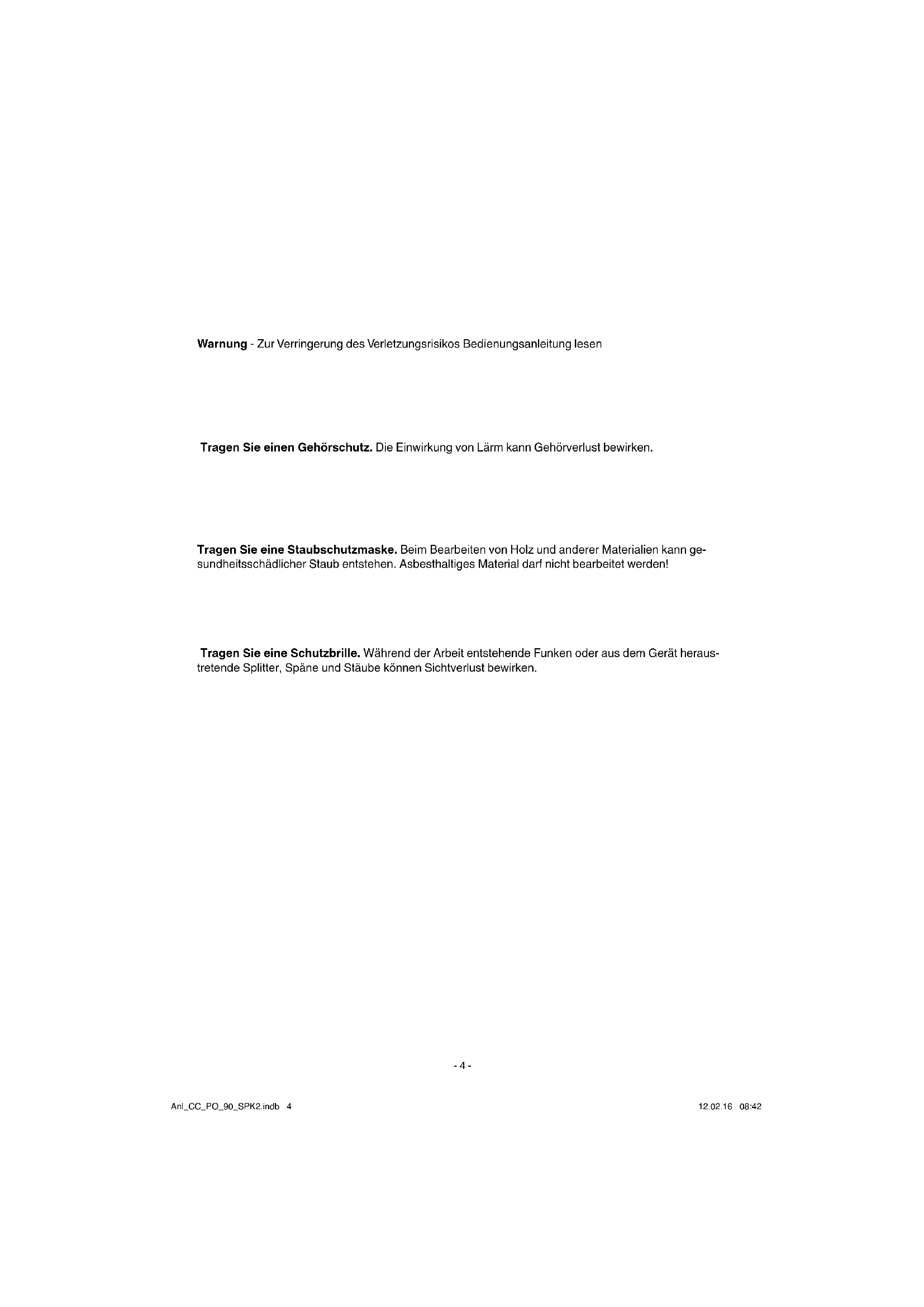 Warnung - Zur Verringerung des Verletzungsrisikos Bedienungsanleitung lesen Tragen Sie einen Gehörschutz. Die Einwirkung von Lärm kann Gehörverlust bewirken. Tragen Sie eine Schutzbrille. Während der Arbeit entstehende Funken oder aus dem Gerät heraus- tretende Splitter, Späne und Stäube können Sichtverlust bewirken. Tragen Sie eine Staubschutzmaske. Beim Bearbeiten von Holz und anderer Materialien kann ge- sundheitsschädlicher Staub entstehen. Asbesthaltiges Material darf nicht bearbeitet werden! Anl_CC_PO_90_SPK2.indb 4Anl_CC_PO_90_SPK2.indb 4 12.02.16 08:4212.02.16 08:42D