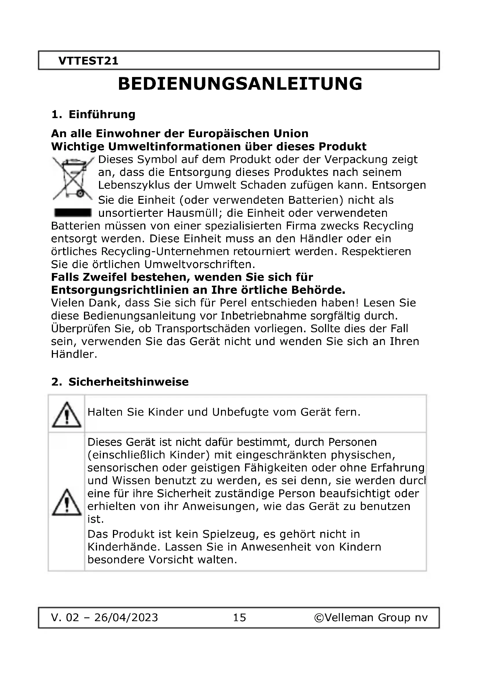 Spannungsbereich .......................................90-1000 V~ Messkategorie ....................................... CAT IV / 1000 V Betriebstemperatur ............................. -10 °C bis +50 °C Stromversorgung ....... 2 x LR03 AAA-Batterie (mitgeliefert) Abmessungen ..................................... 118 x 39 x 20 mm Gewicht .......................................... 37 g (mit Batterien) Verwenden Sie dieses Gerät nur mit originellen Zubehörteilen. Velleman Group NV übernimmt keine Haftung für Schaden oder Verletzungen bei (falscher) Anwendung dieses Gerätes. Für mehr Informationen zu diesem Produkt und die neueste Version dieser Bedienungsanleitung, siehe www.perel.eu. Alle Änderungen ohne vorherige Ankündigung vorbehalten. © URHEBERRECHT Velleman Group NV besitzt das Urheberrecht für diese Bedienungsanleitung. Alle weltweiten Rechte vorbehalten. Ohne vorherige schriftliche Genehmigung des Urhebers ist es nicht gestattet, diese Bedienungsanleitung ganz oder in Teilen zu reproduzieren, zu kopieren, zu übersetzen, zu bearbeiten oder zu speichern.VTTEST21