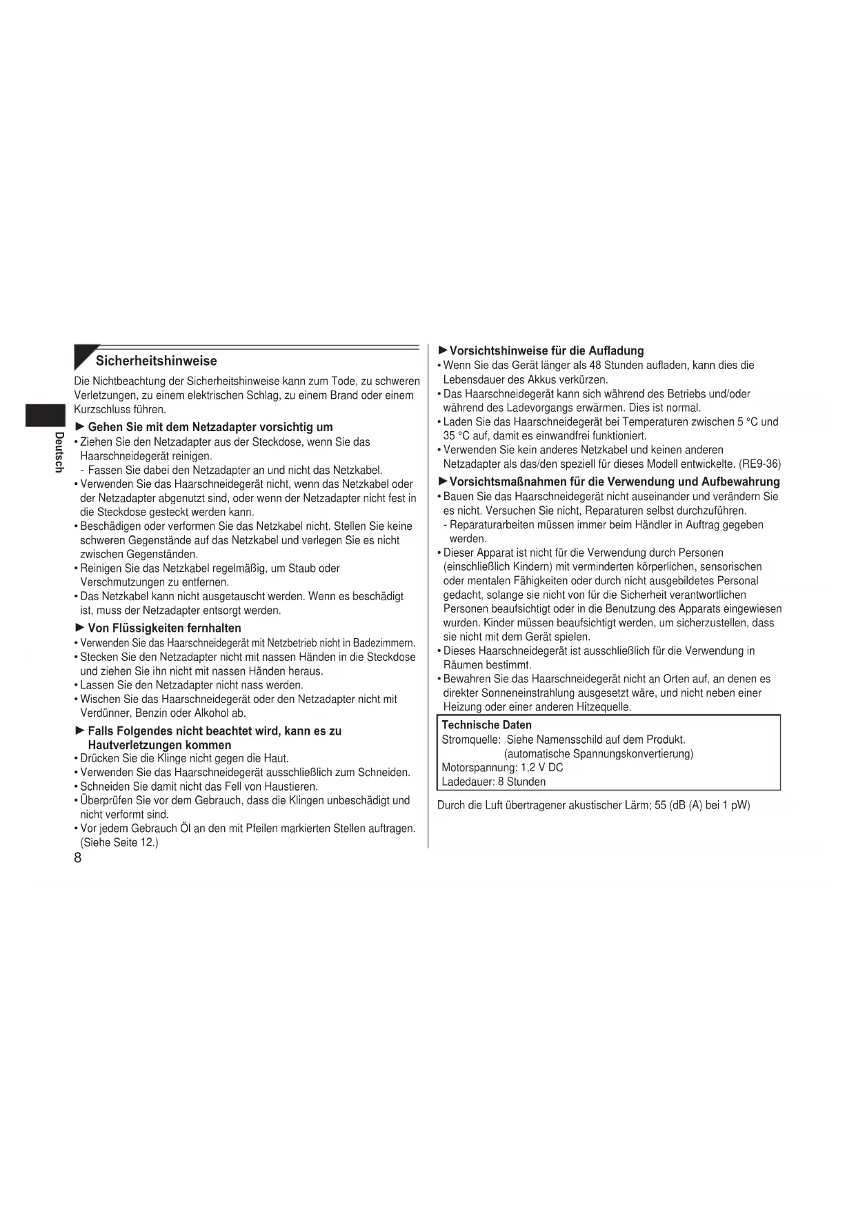 Vorsichtshinweise für die Auadung Wenn Sie das Gerät länger als 48 Stunden auaden, kann dies die Lebensdauer des Akkus verkürzen. Das Haarschneidegerät kann sich während des Betriebs und/oder während des Ladevorgangs erwärmen. Dies ist normal. Laden Sie das Haarschneidegerät bei Temperaturen zwischen 5 °C und 35 °C auf, damit es einwandfrei funktioniert. Verwenden Sie kein anderes Netzkabel und keinen anderen Netzadapter als das/den speziell für dieses Modell entwickelte. (RE9‑36) Vorsichtsmaßnahmen für die Verwendung und Aufbewahrung Bauen Sie das Haarschneidegerät nicht auseinander und verändern Sie es nicht. Versuchen Sie nicht, Reparaturen selbst durchzuführen. Reparaturarbeiten müssen immer beim Händler in Auftrag gegeben werden. Dieser Apparat ist nicht für die Verwendung durch Personen (einschließlich Kindern) mit verminderten körperlichen, sensorischen oder mentalen Fähigkeiten oder durch nicht ausgebildetes Personal gedacht, solange sie nicht von für die Sicherheit verantwortlichen Personen beaufsichtigt oder in die Benutzung des Apparats eingewiesen wurden. Kinder müssen beaufsichtigt werden, um sicherzustellen, dass sie nicht mit dem Gerät spielen. Dieses Haarschneidegerät ist ausschließlich für die Verwendung in Räumen bestimmt. Bewahren Sie das Haarschneidegerät nicht an Orten auf, an denen es direkter Sonneneinstrahlung ausgesetzt wäre, und nicht neben einer Heizung oder einer anderen Hitzequelle. Technische Daten Stromquelle: Siehe Namensschild auf dem Produkt. (automatische Spannungskonvertierung) Motorspannung: 1,2 V DC Ladedauer: 8 Stunden Durch die Luft übertragener akustischer Lärm; 55 (dB (A) bei 1 pW)