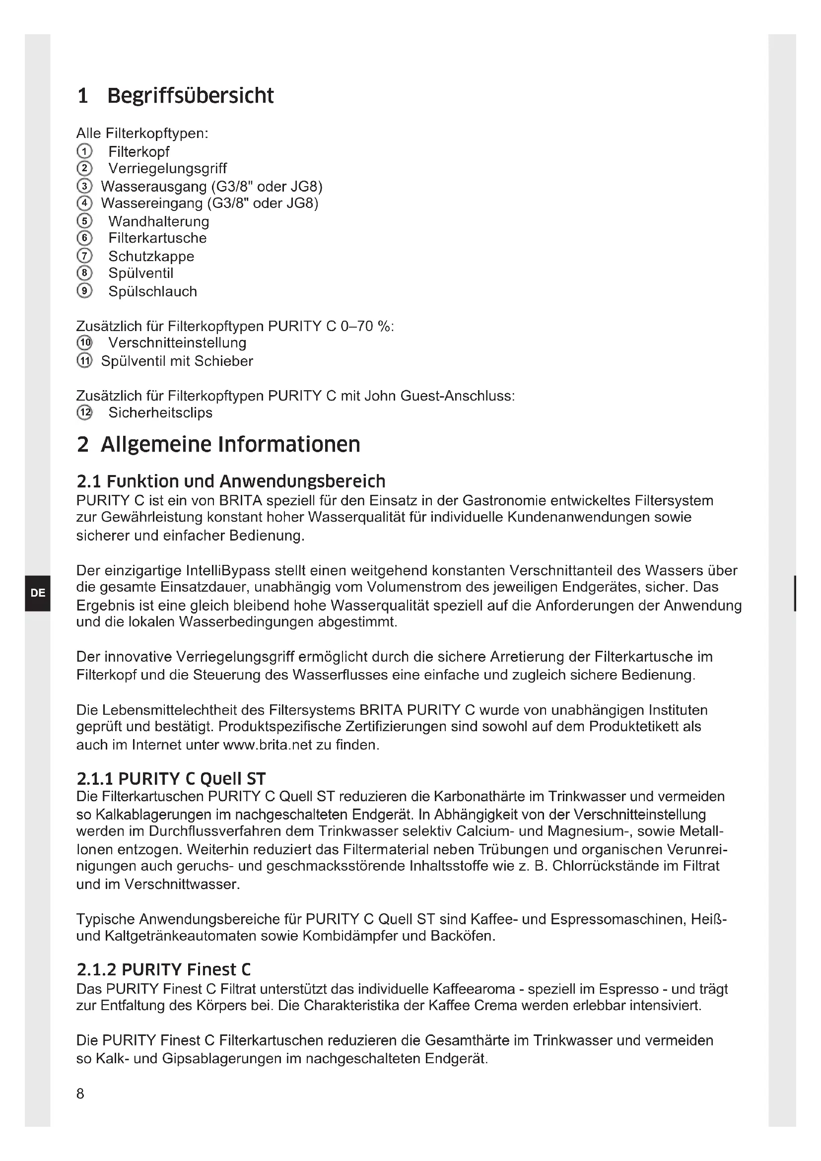 PURITY C ist ein von BRITA speziell für den Einsatz in der Gastronomie entwickeltes Filtersystem zur Gewährleistung konstant hoher Wasserqualität für individuelle Kundenanwendungen sowie sicherer und einfacher Bedienung. Der einzigartige IntelliBypass stellt einen weitgehend konstanten Verschnittanteil des Wassers über die gesamte Einsatzdauer, unabhängig vom Volumenstrom des jeweiligen Endgerätes, sicher. Das Ergebnis ist eine gleich bleibend hohe Wasserqualität speziell auf die Anforderungen der Anwendung und die lokalen Wasserbedingungen abgestimmt. Der innovative Verriegelungsgriff ermöglicht durch die sichere Arretierung der Filterkartusche im Filterkopf und die Steuerung des Wasserusses eine einfache und zugleich sichere Bedienung. Die Lebensmittelechtheit des Filtersystems BRITA PURITY C wurde von unabhängigen Instituten geprüft und bestätigt. Produktspezische Zertizierungen sind sowohl auf dem Produktetikett als auch im Internet unter www.brita.net zu nden.