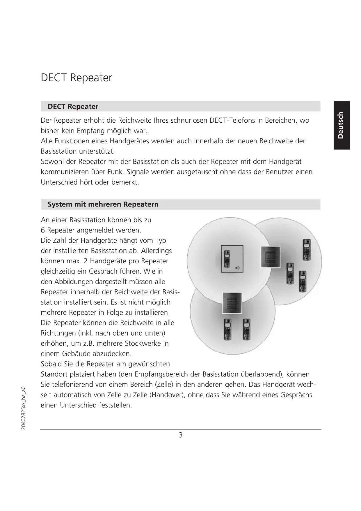 erneut aus. Der Repeater ist nun für eine neue Anmeldung betriebsbereit.6 20402825xx_ba_a0 DECT Repeater Aufstellungsort Damit der Repeater einwandfrei funktionieren kann, muss er am richtigen Standort auf- gestellt sein. Nachfolgend finden Sie einige Tipps, wie Sie Ihren Repeater am besten platzieren. ➭ Wählen Sie eine erhöhte Position mit gutem Empfang zur Basisstation. ➭ Stellen Sie den Repeater nicht in die unmittelbare Nähe von elektronischen Geräten wie z.B. Hi-Fi-Geräte, Bürogeräte oder Mikrowellengeräte auf, um eine gegenseitige Beeinträchtigung auszuschliessen. ➭ Vermeiden Sie auch einen Aufstellungsort in der Nähe von Wärmequellen, z.B. Heiz- körper, und von Hindernissen, z.B. Metalltüren, dicke Wände, Nischen und Schränken. ➭ Halten Sie einen Abstand von mind. 10 Meter zwischen zwei Repeatern in überlappen- dem Empfangsbereich ein. Wandern Sie während eines Gespräches im Raum umher, um die Deckung der Basissta- tionen zu bestimmen. Installieren Sie den Repeater am Rand des Deckungsbereichs, wo Sie noch immer eine gute Verbindung zwischen Handgerät und Basisstation haben. Stellen Sie den Repeater an verschiedenen Orten im Raum auf, um den bestmöglichen Standort zu finden. Rund um den Repeater steht Ihnen nun zusätzlicher Empfangs- bereich zur Verfügung. Hinweis Nachdem der Repeater eingeschaltet wurde, sollte die LED permanent leuchten. Blinkt die LED, wurde der Repeater zu weit weg von Basisstation aufgestellt oder der Emfpang wird durch dicke Wände oder Metalobjekte (z.B. Radiatoren) behindert.7 20402825xx_ba_a0 Deutsch DECT Repeater Prüfton Der Prüfton bestätigt, dass das Handgerät im erweiteren Empfangsbereich des Repeaters korrekt funktioniert. Dieser Ton ist auf dem aktiven Handgerät hörbar solange es mit dem Repeater verbunden ist. Um den Prüfton ein- oder auszuschalten, gehen Sie wie folgt vor: