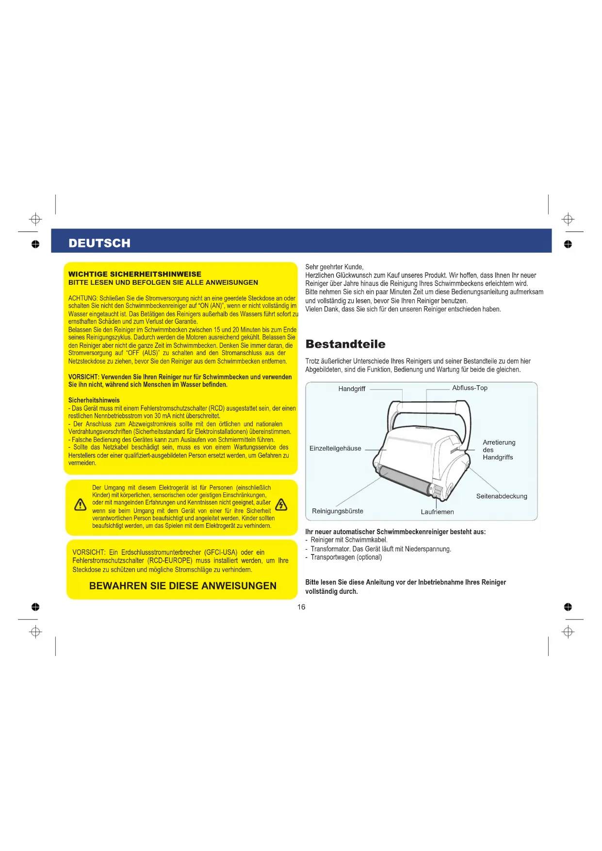Bestandteile Ihr neuer automatischer Schwimmbeckenreiniger besteht aus: - Reiniger mit Schwimmkabel. - Transformator. Das Gerät läuft mit Niederspannung. - Transportwagen (optional) Bitte lesen Sie diese Anleitung vor der Inbetriebnahme Ihres Reiniger vollständig durch. Trotz äußerlicher Unterschiede Ihres Reinigers und seiner Bestandteile zu dem hier Abgebildeten, sind die Funktion, Bedienung und Wartung für beide die gleichen. ReinigungsbürsteLaufriemenSeitenabdeckungArretierung des HandgriffsEinzelteilgehäuseHandgriffAbfluss-Top WICHTIGE SICHERHEITSHINWEISE BITTE LESEN UND BEFOLGEN SIE ALLE ANWEISUNGEN ACHTUNG: Schließen Sie die Stromversorgung nicht an eine geerdete Steckdose an oder schalten Sie nicht den Schwimmbeckenreiniger auf “ON (AN)”, wenn er nicht vollständig im Wasser eingetaucht ist. Das Betätigen des Reinigers außerhalb des Wassers führt sofort zu ernsthaften Schäden und zum Verlust der Garantie. Belassen Sie den Reiniger im Schwimmbecken zwischen 15 und 20 Minuten bis zum Ende seines Reinigungszyklus. Dadurch werden die Motoren ausreichend gekühlt. Belassen Sie den Reiniger aber nicht die ganze Zeit im Schwimmbecken. Denken Sie immer daran, die Stromversorgung auf “OFF (AUS)” zu schalten and den Stromanschluss aus der Netzsteckdose zu ziehen, bevor Sie den Reiniger aus dem Schwimmbecken entfernen. VORSICHT: Verwenden Sie Ihren Reiniger nur für Schwimmbecken und verwenden Sie ihn nicht, während sich Menschen im Wasser befinden. Sicherheitshinweis - Das Gerät muss mit einem Fehlerstromschutzschalter (RCD) ausgestattet sein, der einen restlichen Nennbetriebsstrom von 30 mA nicht überschreitet. - Der Anschluss zum Abzweigstromkreis sollte mit den örtlichen und nationalen Verdrahtungsvorschriften (Sicherheitsstandard für Elektroinstallationen) übereinstimmen. - Falsche Bedienung des Gerätes kann zum Auslaufen von Schmiermitteln führen. - Sollte das Netzkabel beschädigt sein, muss es von einem Wartungsservice des Herstellers oder einer qualifiziert-ausgebildeten Person ersetzt werden, um Gefahren zu vermeiden. VORSICHT: Ein Erdschlussstromunterbrecher (GFCI-USA) oder ein Fehlerstromschutzschalter (RCD-EUROPE) muss installiert werden, um Ihre Steckdose zu schützen und mögliche Stromschläge zu verhindern. Der Umgang mit diesem Elektrogerät ist für Personen (einschließlich Kinder) mit körperlichen, sensorischen oder geistigen Einschränkungen, oder mit mangelnden Erfahrungen und Kenntnissen nicht geeignet, außer wenn sie beim Umgang mit dem Gerät von einer für ihre Sicherheit verantwortlichen Person beaufsichtigt und angeleitet werden. Kinder sollten beaufsichtigt werden, um das Spielen mit dem Elektrogerät zu verhindern. BEWAHREN SIE DIESE ANWEISUNGEN1. Stellen Sie die Stromversorgung (Transformator) mindestens 3,6 Meter vom Schwimmbecken und mindestens 12 cm über der Oberfläche (Abb.1) auf. Die Stromversorgung versorgt den Reiniger mit Niederspannung.