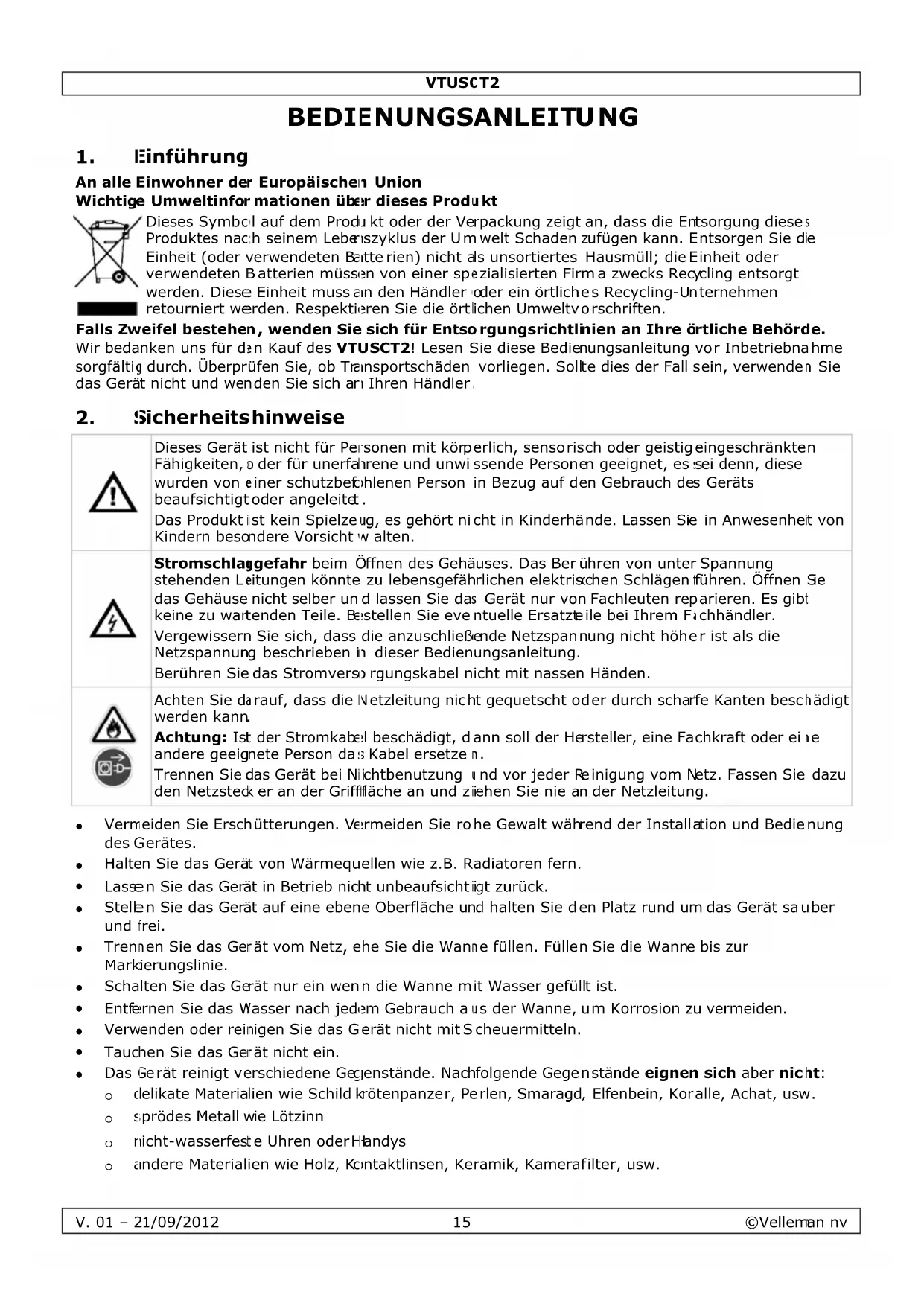 Laden Sie die Anleitung für Ihr Ultraschallreiniger kostenlos im PDF-Format! Finden Sie Ihr Handbuch VTUSCT2 - VELLEMAN und nehmen Sie Ihr elektronisches Gerät wieder in die Hand. Auf dieser Seite sind alle Dokumente veröffentlicht, die für die Verwendung Ihres Geräts notwendig sind. VTUSCT2 von der Marke VELLEMAN.