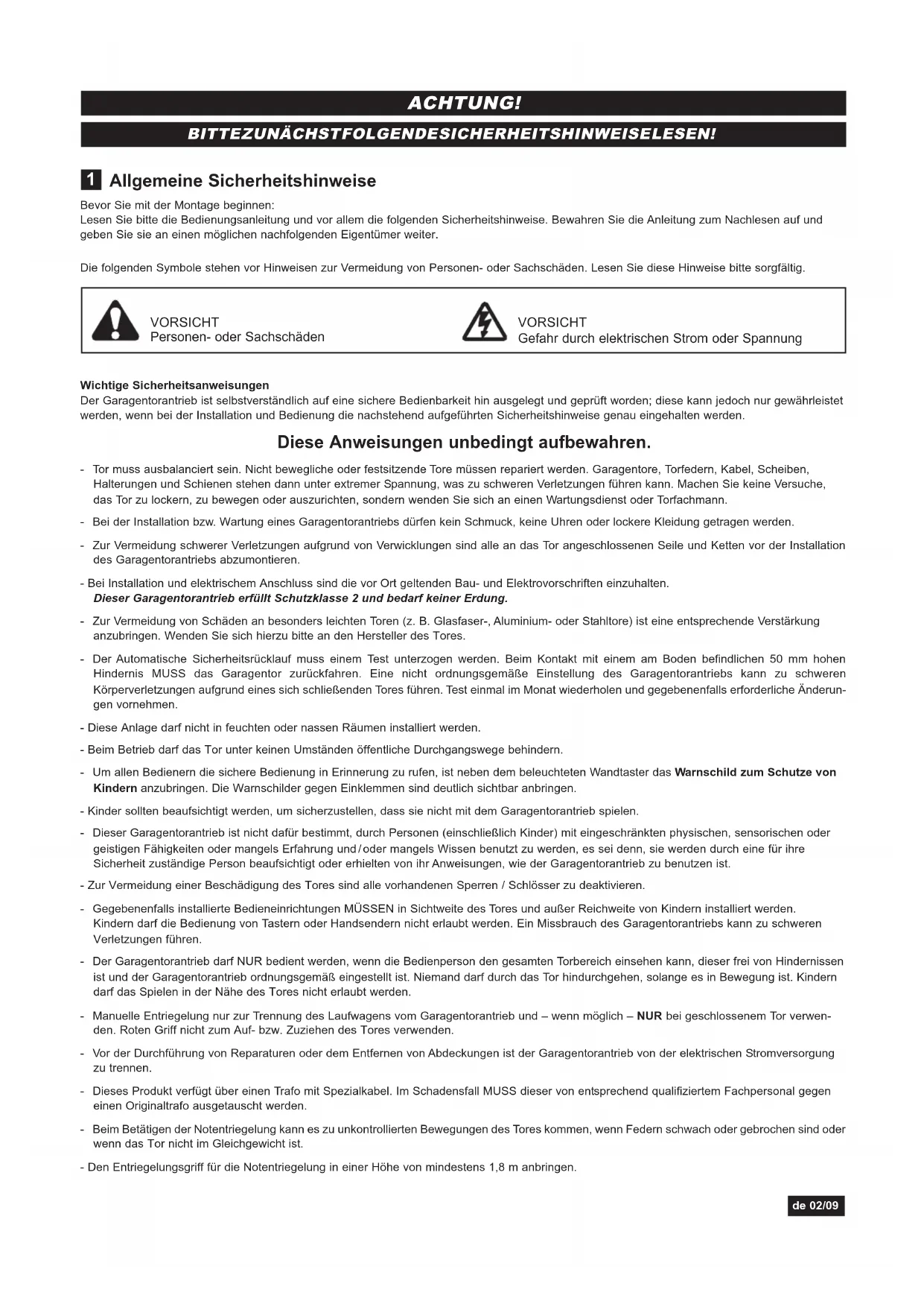 - 18 Konformitätserklärung de 01/09Allgemeine Sicherheitshinweise Bevor Sie mit der Montage beginnen: Lesen Sie bitte die Bedienungsanleitung und vor allem die folgenden Sicherheitshinweise. Bewahren Sie die Anleitung zum Nachlesen auf und geben Sie sie an einen möglichen nachfolgenden Eigentümer weiter. Die folgenden Symbole stehen vor Hinweisen zur Vermeidung von Personen- oder Sachschäden. Lesen Sie diese Hinweise bitte sorgfältig. Wichtige Sicherheitsanweisungen Der Garagentorantrieb ist selbstverständlich auf eine sichere Bedienbarkeit hin ausgelegt und geprüft worden; diese kann jedoch nur gewährleistet werden, wenn bei der Installation und Bedienung die nachstehend aufgeführten Sicherheitshinweise genau eingehalten werden. Diese Anweisungen unbedingt aufbewahren. - Tor muss ausbalanciert sein. Nicht bewegliche oder festsitzende Tore müssen repariert werden. Garagentore, Torfedern, Kabel, Scheiben, Halterungen und Schienen stehen dann unter extremer Spannung, was zu schweren Verletzungen führen kann. Machen Sie keine Versuche, das Tor zu lockern, zu bewegen oder auszurichten, sondern wenden Sie sich an einen Wartungsdienst oder Torfachmann. - Bei der Installation bzw. Wartung eines Garagentorantriebs dürfen kein Schmuck, keine Uhren oder lockere Kleidung getragen werden. - Zur Vermeidung schwerer Verletzungen aufgrund von Verwicklungen sind alle an das Tor angeschlossenen Seile und Ketten vor der Installation des Garagentorantriebs abzumontieren. - Bei Installation und elektrischem Anschluss sind die vor Ort geltenden Bau- und Elektrovorschriften einzuhalten. Dieser Garagentorantrieb erfüllt Schutzklasse 2 und bedarf keiner Erdung. - Zur Vermeidung von Schäden an besonders leichten Toren (z. B. Glasfaser-, Aluminium- oder Stahltore) ist eine entsprechende Verstärkung anzubringen. Wenden Sie sich hierzu bitte an den Hersteller des Tores. - Der Automatische Sicherheitsrücklauf muss einem Test unterzogen werden. Beim Kontakt mit einem am Boden befindlichen 50 mm hohen Hindernis MUSS das Garagentor zurückfahren. Eine nicht ordnungsgemäße Einstellung des Garagentorantriebs kann zu schweren Körperverletzungen aufgrund eines sich schließenden Tores führen. Test einmal im Monat wiederholen und gegebenenfalls erforderliche Änderun- gen vornehmen. - Diese Anlage darf nicht in feuchten oder nassen Räumen installiert werden. - Beim Betrieb darf das Tor unter keinen Umständen öffentliche Durchgangswege behindern. - Um allen Bedienern die sichere Bedienung in Erinnerung zu rufen, ist neben dem beleuchteten Wandtaster das Warnschild zum Schutze von Kindern anzubringen. Die Warnschilder gegen Einklemmen sind deutlich sichtbar anbringen. - Kinder sollten beaufsichtigt werden, um sicherzustellen, dass sie nicht mit dem Garagentorantrieb spielen. - Dieser Garagentorantrieb ist nicht dafür bestimmt, durch Personen (einschließlich Kinder) mit eingeschränkten physischen, sensorischen oder geistigen Fähigkeiten oder mangels Erfahrung und/oder mangels Wissen benutzt zu werden, es sei denn, sie werden durch eine für ihre Sicherheit zuständige Person beaufsichtigt oder erhielten von ihr Anweisungen, wie der Garagentorantrieb zu benutzen ist. - Zur Vermeidung einer Beschädigung des Tores sind alle vorhandenen Sperren / Schlösser zu deaktivieren. - Gegebenenfalls installierte Bedieneinrichtungen MÜSSEN in Sichtweite des Tores und außer Reichweite von Kindern installiert werden. Kindern darf die Bedienung von Tastern oder Handsendern nicht erlaubt werden. Ein Missbrauch des Garagentorantriebs kann zu schweren Verletzungen führen. - Der Garagentorantrieb darf NUR bedient werden, wenn die Bedienperson den gesamten Torbereich einsehen kann, dieser frei von Hindernissen ist und der Garagentorantrieb ordnungsgemäß eingestellt ist. Niemand darf durch das Tor hindurchgehen, solange es in Bewegung ist. Kindern darf das Spielen in der Nähe des Tores nicht erlaubt werden. - Manuelle Entriegelung nur zur Trennung des Laufwagens vom Garagentorantrieb und – wenn möglich – NUR bei geschlossenem Tor verwen- den. Roten Griff nicht zum Auf- bzw. Zuziehen des Tores verwenden. - Vor der Durchführung von Reparaturen oder dem Entfernen von Abdeckungen ist der Garagentorantrieb von der elektrischen Stromversorgung zu trennen. - Dieses Produkt verfügt über einen Trafo mit Spezialkabel. Im Schadensfall MUSS dieser von entsprechend qualifiziertem Fachpersonal gegen einen Originaltrafo ausgetauscht werden. - Beim Betätigen der Notentriegelung kann es zu unkontrollierten Bewegungen des Tores kommen, wenn Federn schwach oder gebrochen sind oder wenn das Tor nicht im Gleichgewicht ist. - Den Entriegelungsgriff für die Notentriegelung in einer Höhe von mindestens 1,8 m anbringen. VORSICHT Personen- oder Sachschäden VORSICHT Gefahr durch elektrischen Strom oder Spannung p. 9