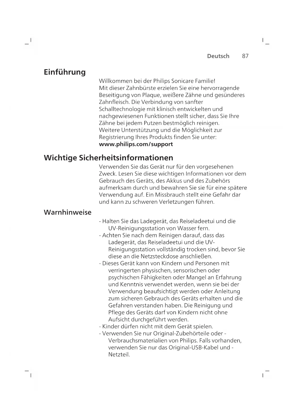 Deutsch Einführung Willkommen bei der Philips Sonicare Familie! Mit dieser Zahnbürste erzielen Sie eine hervorragende Beseitigung von Plaque, weißere Zähne und gesünderes Zahnfleisch. Die Verbindung von sanfter Schalltechnologie mit klinisch entwickelten und nachgewiesenen Funktionen stellt sicher, dass Sie Ihre Zähne bei jedem Putzen bestmöglich reinigen. Weitere Unterstützung und die Möglichkeit zur Registrierung Ihres Produkts finden Sie unter: www.philips.com/support Wichtige Sicherheitsinformationen Verwenden Sie das Gerät nur für den vorgesehenen Zweck. Lesen Sie diese wichtigen Informationen vor dem Gebrauch des Geräts, des Akkus und des Zubehörs aufmerksam durch und bewahren Sie sie für eine spätere Verwendung auf. Ein Missbrauch stellt eine Gefahr dar und kann zu schweren Verletzungen führen. Warnhinweise - Halten Sie das Ladegerät, das Reiseladeetui und die UV-Reinigungsstation von Wasser fern. - Achten Sie nach dem Reinigen darauf, dass das Ladegerät, das Reiseladeetui und die UV- Reinigungsstation vollständig trocken sind, bevor Sie diese an die Netzsteckdose anschließen. - Dieses Gerät kann von Kindern und Personen mit verringerten physischen, sensorischen oder psychischen Fähigkeiten oder Mangel an Erfahrung und Kenntnis verwendet werden, wenn sie bei der Verwendung beaufsichtigt werden oder Anleitung zum sicheren Gebrauch des Geräts erhalten und die Gefahren verstanden haben. Die Reinigung und Pflege des Geräts darf von Kindern nicht ohne Aufsicht durchgeführt werden. - Kinder dürfen nicht mit dem Gerät spielen. - Verwenden Sie nur Original-Zubehörteile oder - Verbrauchsmaterialien von Philips. Falls vorhanden, verwenden Sie nur das Original-USB-Kabel und - Netzteil.88 Deutsch - Dieses Gerät enthält keine Teile, die vom Benutzer repariert werden können. Wenn das Gerät beschädigt ist, verwenden Sie es nicht mehr, und wenden Sie sich bitte an das Service‑Center in Ihrem Land (siehe „Garantie und Support”). - Verwenden Sie das USB-Kabel und das USB-Netzteil nicht, wenn sie beschädigt sind. - Verwenden Sie das Ladegerät, das Reiseladeetui und/oder die UV-Reinigungsstation nie im Freien oder in der Nähe von heißen Oberflächen. - Die Produktteile dürfen nicht in der Spülmaschine gereinigt werden. - Dieses Gerät ist ausschließlich zum Reinigen von Zähnen, Zahnfleisch und Zunge gedacht. - Bewahren Sie die UV-Reinigungsstation immer außerhalb der Reichweite von Kindern auf. - Verwenden Sie die UV-Reinigungsstation nicht mehr, wenn die UV-Lampe bei geöffneter Klappe weiterhin leuchtet. UV-Licht kann für das menschliche Auge und die Haut schädlich sein. - Bedienen Sie die Reinigungsstation nur mit Schutzscheibe. - Berühren Sie die UV-Lampe der UV-Reinigungsstation nicht, wenn sie heiß ist. - Unterlassen Sie es, einen Bürstenkopf mit abgeknickten oder zerdrückten Borsten zu verwenden. Ersetzen Sie den Bürstenkopf alle 3Monate oder früher, falls Anzeichen von Abnutzung auftreten. - Vermeiden Sie direkten Kontakt mit Produkten, die ätherische Öle oder Kokosnussöl enthalten. Der Kontakt kann zum Lösen von Borsten führen. - Die maximale Höhe der Nutzung beträgt 4500Meter. MEDIZINISCHE HINWEISE - Verwenden Sie das Gerät nicht mehr, und konsultieren Sie Ihren Zahnarzt/Arzt, wenn übermäßiges Zahnfleischbluten auftritt oder Zahnfleischbluten länger als eine Woche anhält oder wenn Sie beim Gebrauch Unbehagen oder Schmerzen verspüren.89 Deutsch - Wenn in den vergangenen 2Monaten ein chirurgischer Eingriff an Ihren Zähnen oder am Zahnfleisch vorgenommen wurde, sollten Sie vor Benutzung des Geräts Ihren Zahnarzt konsultieren. - Wenden Sie sich als Träger eines Herzschrittmachers oder eines anderen Implantats vor der Verwendung dieses Geräts an Ihren Arzt oder den Hersteller des implantierten Gerätes. - Sollten Sie Bedenken wegen Ihrer Gesundheit haben, konsultieren Sie vor Benutzung dieses Geräts Ihren Arzt. - Dieses Gerät ist ein Gerät zur individuellen Mundpflege und nicht für die Verwendung durch mehrere Patienten in einer Zahnarztpraxis oder Zahnklinik geeignet. Batterie-Sicherheitsanweisungen - Dieses Gerät verwendet Batterien, die nur von fachkundigen Personen entfernt werden dürfen. - Verwenden Sie das Gerät nur für den vorgesehenen Zweck. Lesen Sie diese Informationen vor dem Gebrauch des Geräts, des Akkus und des Zubehörs aufmerksam durch und bewahren Sie sie für eine spätere Verwendung auf. Ein Missbrauch stellt eine Gefahr dar und kann zu schweren Verletzungen führen. Das mitgelieferte Zubehör kann für verschiedene Produkte variieren. - Verwenden Sie nur Original-Zubehörteile und - Verbrauchsmaterialien von Philips. Verwenden Sie nur das abnehmbare Netzteil TCBxxxx (Eingangsleistung: 100–240 V~; 50/60 Hz; 1,5 W), HX6100 (Eingangsleistung: 100–240 V~; 50/60 Hz; 1,4 W), HX6110 (Eingangsleistung: 100–240 V~; 50/60 Hz; 1,5 W), HX6160 (Eingangsleistung: 100–240 V~; 50/60 Hz; 6 W), WAAxxxx (Eingangsleistung: 100–240 V~; 50/60 Hz; 3,5 W). - Halten Sie das Produkt und die Akkus von Feuer fern und setzen Sie sie keinem direkten Sonnenlicht oder hohen Temperaturen aus.90 Deutsch - Wenn das Produkt ungewöhnlich heiß wird, einen ungewöhnlichen Geruch entwickelt, die Farbe ändert oder wenn das Laden viel länger dauert als üblich, beenden Sie die Verwendung und das Laden des Produkts und wenden Sie sich an Philips. - Legen Sie die Produkte und die Batterien nicht in Mikrowellen oder auf Induktionsherde. - Um die Aufheizung oder die Freisetzung giftiger oder gefährlicher Substanzen aus den Akkus zu verhindern, sollten Sie das Produkt oder die Akkus nicht öffnen, modifizieren, durchbohren, beschädigen oder zerlegen. Überladen Sie die Akkus nicht, verursachen Sie keinen Kurzschluss und laden Sie sie nicht umgekehrt auf. - Dieses Gerät verwendet Akkus, die nicht austauschbar sind. Wenn der Akku das Ende seiner Lebenszeit erreicht hat, muss das Gerät ordnungsgemäß entsorgt werden (siehe A