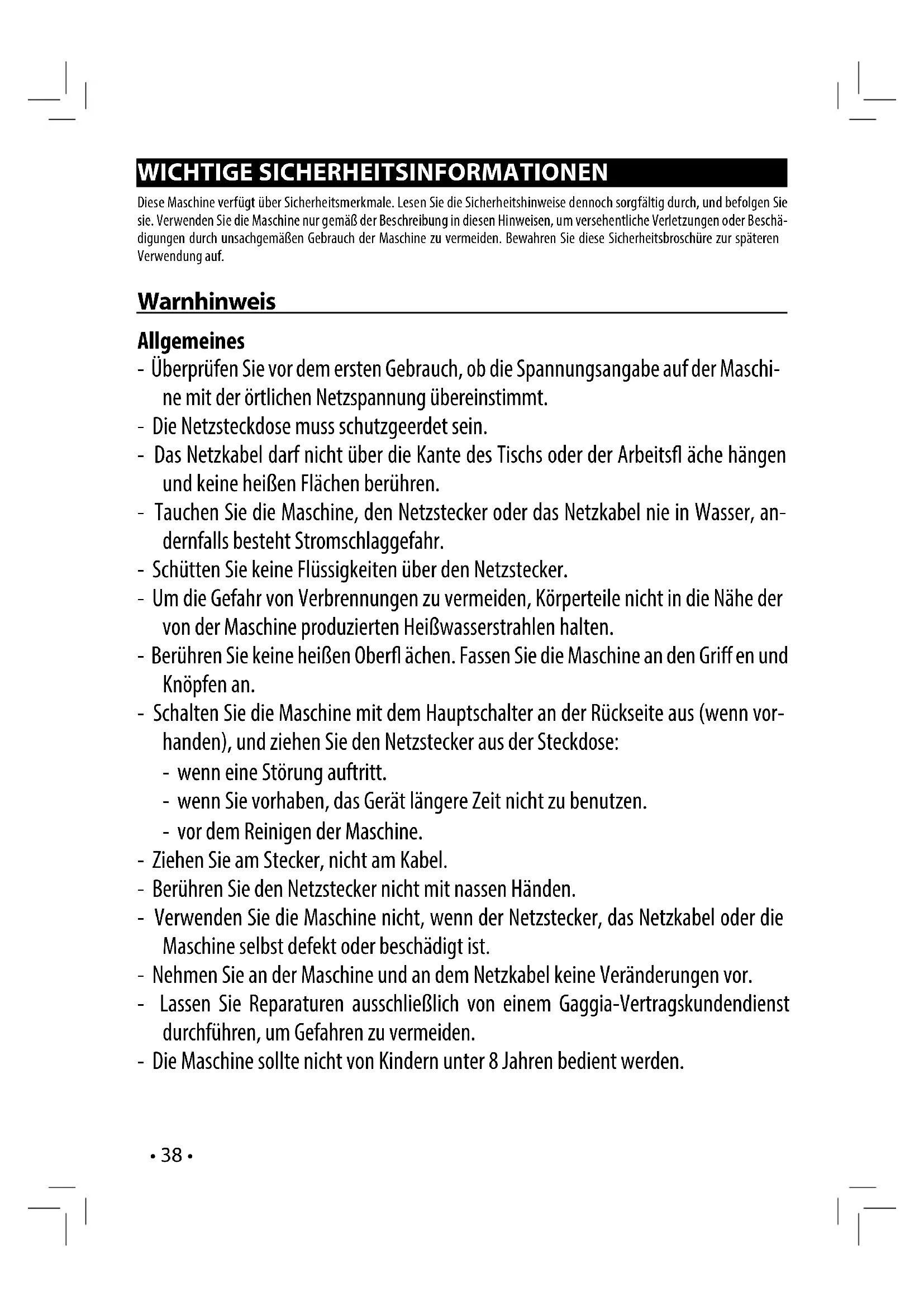 Co ee is too cold. The lter holder is not inserted for pre- heating (chapter 7). Preheat the lter holder. The cups are cold. Preheat the cups with hot water. The milk does not froth. It is not possible to prepare a cappuccino. The milk is not suitable: powdered milk, low-fat milk. Use whole milk. Dirty Pannarello. Clean the Pannarello as described in chapter 11. No water in the tank. Fill the tank up with water and prime the circuit (section 4.6). Co ee is brewed too fast, crema does not form. There is too little co ee in the lter holder. Add co ee (chapter 7). The grind is too coarse. Use a di erent blend (chapter 8). Co ee is old or not suitable. Use a di erent blend (chapter 8). The pod is old or not suitable. Change the pod. Missing component in the lter holder. Make sure that all the components are present and properly installed. Co ee does not come out or drips only. No water. Fill the tank up with water and prime the circuit (section 4.6). The grind is too ne. Use a di erent blend (chapter 8). Co ee tamped in the lter holder. Shake the ground co ee. There is too much co ee in the lter holder. Reduce the quantity of co ee in the lter holder. The machine has limescale build-up. Descale the machine (chapter 12). The lter in the lter holder is clogged. Turn the machine o and let it cool down (approx. 1 hour), then remove and wash the lter holder thoroughly. If the problem persists, contact the service centre. Not suitable pod. Change type of pod.• 37 • Problem Possible Causes Solution Co ee ows out of the edges. The lter holder is not correctly inserted in the brew unit. Insert the lter holder correctly (chapter 7). The upper rim of the lter holder is dirty. Clean the rim of the lter holder. Pod inserted incorrectly. Insert the pod correctly. Make sure it does not come out of the lter holder. There is too much co ee in the lter holder. Reduce the quantity of co ee using the measur- ing scoop. The " " light (20) is on. The water knob (3) is open. Close the knob (3). The " " light (19) is on. Descale the machine. Please refer to chapter (12). The pump turns o during water or steam dispensing and the " " light (20) turns on. Safety time-out. Close the water knob. Please contact an authorised service centre for any problems not covered in the above table or when the suggested solutions do not solve the problem.• 38 • WICHTIGE SICHERHEITSINFORMATIONEN Diese Maschine verfügt über Sicherheitsmerkmale. Lesen Sie die Sicherheitshinweise dennoch sorgfältig durch, und befolgen Sie sie. Verwenden Sie die Maschine nur gemäß der Beschreibung in diesen Hinweisen, um versehentliche Verletzungen oder Beschä- digungen durch unsachgemäßen Gebrauch der Maschine zu vermeiden. Bewahren Sie diese Sicherheitsbroschüre zur späteren Verwendung auf. Warnhinweis Allgemeines - Überprüfen Sie vor dem ersten Gebrauch, ob die Spannungsangabe auf der Maschi- ne mit der örtlichen Netzspannung übereinstimmt. - Die Netzsteckdose muss schutzgeerdet sein. - Das Netzkabel darf nicht über die Kante des Tischs oder der Arbeits äche hängen und keine heißen Flächen berühren. - Tauchen Sie die Maschine, den Netzstecker oder das Netzkabel nie in Wasser, an- dernfalls besteht Stromschlaggefahr. - Schütten Sie keine Flüssigkeiten über den Netzstecker. - Um die Gefahr von Verbrennungen zu vermeiden, Körperteile nicht in die Nähe der von der Maschine produzierten Heißwasserstrahlen halten. - Berühren Sie keine heißen Ober ächen. Fassen Sie die Maschine an den Gri en und Knöpfen an. - Schalten Sie die Maschine mit dem Hauptschalter an der Rückseite aus (wenn vor- handen), und ziehen Sie den Netzstecker aus der Steckdose: - wenn eine Störung auftritt. - wenn Sie vorhaben, das Gerät längere Zeit nicht zu benutzen. - vor dem Reinigen der Maschine. - Ziehen Sie am Stecker, nicht am Kabel. - Berühren Sie den Netzstecker nicht mit nassen Händen. - Verwenden Sie die Maschine nicht, wenn der Netzstecker, das Netzkabel oder die Maschine selbst defekt oder beschädigt ist. - Nehmen Sie an der Maschine und an dem Netzkabel keine Veränderungen vor. - Lassen Sie Reparaturen ausschließlich von einem Gaggia-Vertragskundendienst durchführen, um Gefahren zu vermeiden. - Die Maschine sollte nicht von Kindern unter 8 Jahren bedient werden.• 39 • - Dieses Gerät kann von Kindern ab 8 Jahren und Personen mit eingeschränkten phy- sischen, sensorischen oder geistigen Fähigkeiten oder ohne Erfahrung und beson- dere Kenntnisse verwendet werden, wenn sie beim Gebrauch des Geräts beaufsich- tigt werden oder in den sicheren Gebrauch des Geräts unterwiesen wurden und die verbundenen Gefahren verstanden haben. - Reinigung und P ege dürfen nicht von Kindern durchgeführt werden, außer sie sind älter als 8 Jahre und werden beaufsichtigt. - Sorgen Sie dafür, dass Kinder unter 8 Jahren keinen Zugang zu der Maschine und zum Kabel der Maschine haben. - Achten Sie darauf, dass Kinder nicht mit der Maschine spielen. - Seien Sie vorsichtig, wenn Sie heißes Wasser ausgeben. Vor der Ausgabe können Heißwasserspritzer austreten. Warten Sie, bis der Ausgabezyklus beendet ist, bevor Sie den Heißwasserauslauf abnehmen. Achtung Allgemeines - Diese Maschine ist nur für den normalen Hausgebrauch bestimmt. Sie ist nicht für den Gebrauch in Personalküchen, Büros, landwirtschaftlichen Betrieben oder an- deren gewerblichen Umgebungen vorgesehen. - Stellen Sie die Maschine auf eine ebene und stabile Fläche. Halten Sie die Maschine aufrecht, auch beim Transport. - Stellen Sie die Maschine nicht auf eine Warmhalteplatte, direkt neben einen heißen Ofen, eine Heizung oder eine ähnliche Wärmequelle. - Befüllen Sie den Druck lterhalter nur mit gemahlenem Ka ee. Das Befüllen mit Ka eebohnen, Instantka ee, rohen Ka eebohnen oder anderen Sto en kann zu Schäden an der Maschine führen. In diesem Fall ist eine eventuelle Reparatur nicht durch die Garantie gedeckt. - Lassen Sie die Maschine abkühlen, bevor Sie Teile einsetze