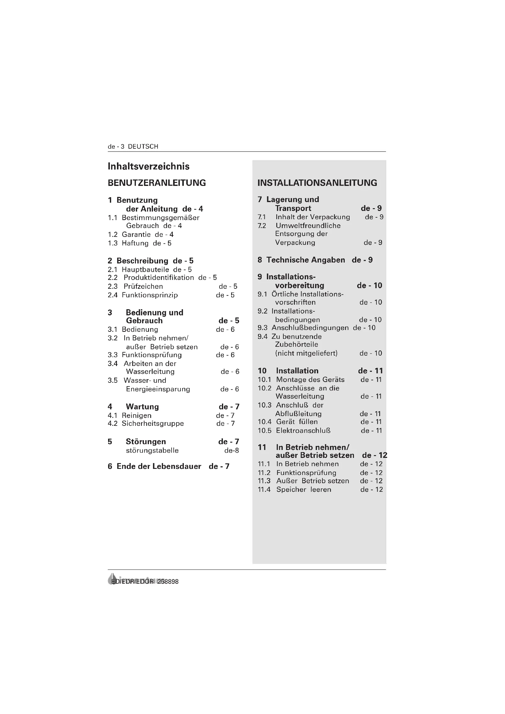 5 Störungen de - 7 störungstabelle de-8 6 Ende der Lebensdauer de - 7 INSTALLATIONSANLEITUNG 7 Lagerung und Transport de - 9