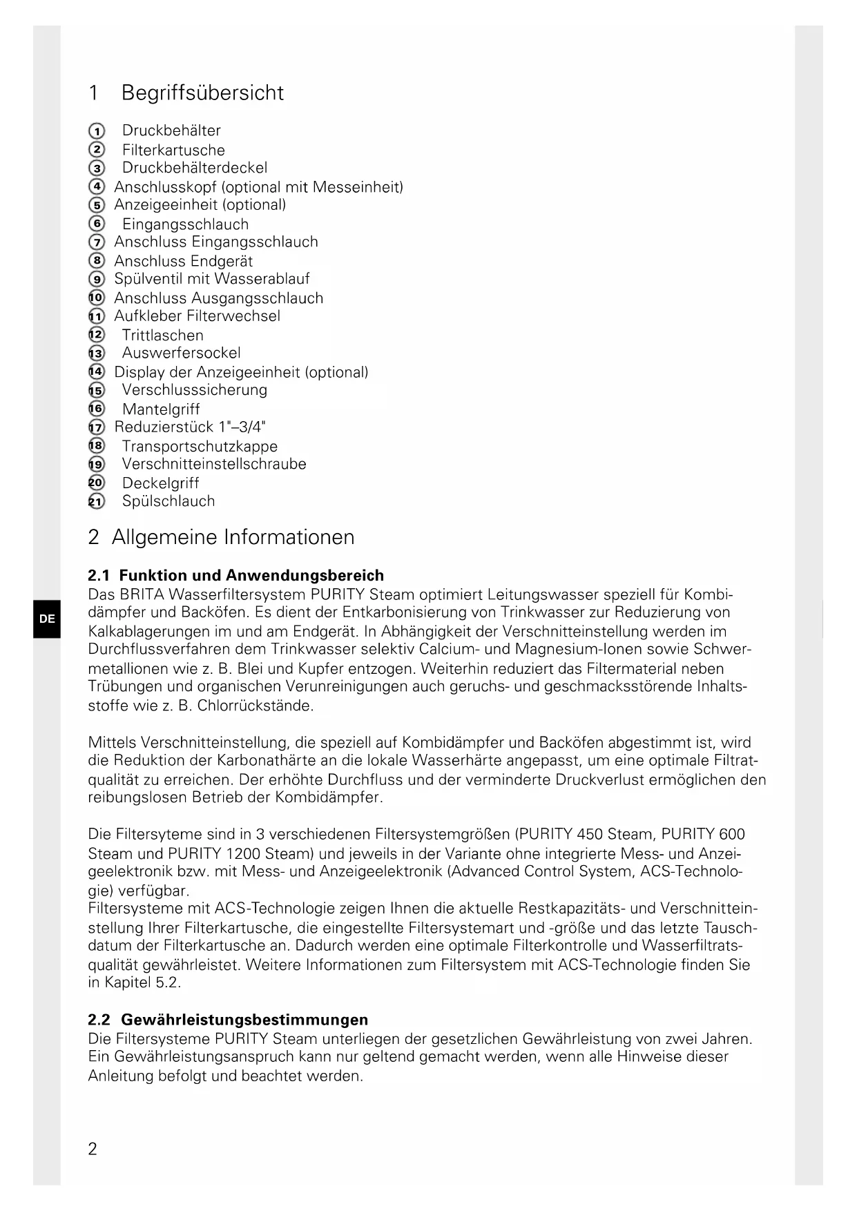 Die Filtersysteme PURITY Steam unterliegen der gesetzlichen Gewährleistung von zwei Jahren. Ein Gewährleistungsanspruch kann nur geltend gemacht werden, wenn alle Hinweise dieser Anleitung befolgt und beachtet werden.