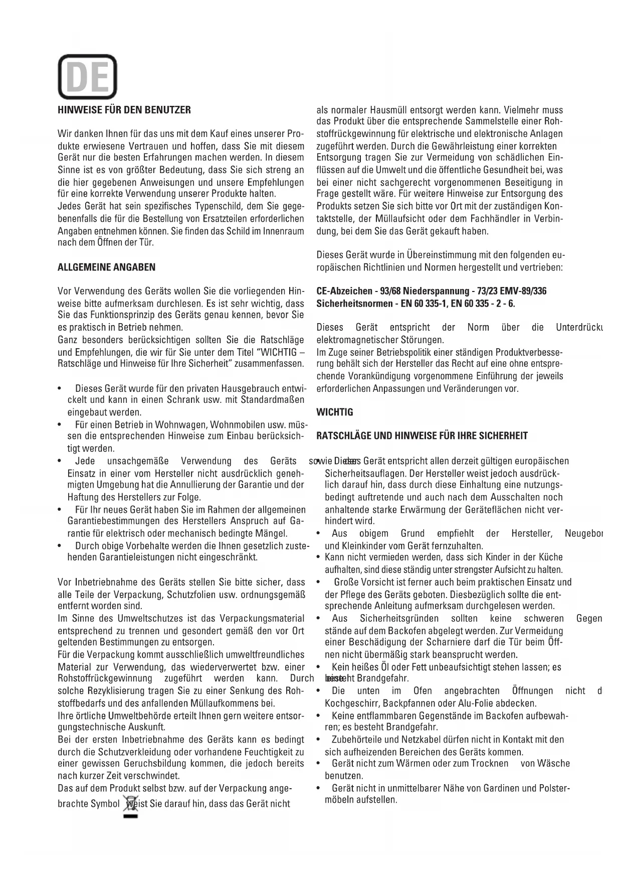- DurchobigeVorbehaltewerdendieIhnengesetzlichzuste- henden Garantieleistungen nicht eingeschränkt. Vor Inbetriebnahme des Geräts stellen Sie bitte sicher, dass alle Teile der Verpackung, Schutzfolien usw. ordnungsgemäß entfernt worden sind. Im Sinne des Umweltschutzes ist das Verpackungsmaterial entsprechend zu trennen und gesondert gemäß den vor Ort geltenden Bestimmungen zu entsorgen. Für die Verpackung kommt ausschließlich umweltfreundliches Material zur Verwendung, das wiederverwertet bzw. einer Rohstoffrückgewinnung zugeführt werden kann. Durch eine solche Rezyklisierung tragen Sie zu einer Senkung des Roh- stoffbedarfs und des anfallenden Müllaufkommens bei. Ihre örtliche Umweltbehörde erteilt Ihnen gern weitere entsor- gungstechnische Auskunft. Bei der ersten Inbetriebnahme des Geräts kann es bedingt durch die Schutzverkleidung oder vorhandene Feuchtigkeit zu einer gewissen Geruchsbildung kommen, die jedoch bereits nach kurzer Zeit verschwindet. DasaufdemProduktselbstbzw.aufderVerpackungange- brachte Symbol weist Sie darauf hin, dass das Gerät nicht als normaler Hausmüll entsorgt werden kann. Vielmehr muss das Produkt über die entsprechende Sammelstelle einer Roh- stoffrückgewinnung für elektrische und elektronische Anlagen zugeführtwerden.DurchdieGewährleistungeinerkorrekten Entsorgung tragen Sie zur Vermeidung von schädlichen Ein- flüssen auf die Umwelt und die öffentliche Gesundheit bei, was bei einer nicht sachgerecht vorgenommenen Beseitigung in Frage gestellt wäre. Für weitere Hinweise zur Entsorgung des Produkts setzen Sie sich bitte vor Ort mit der zuständigen Kon- taktstelle, der Müllaufsicht oder dem Fachhändler in Verbin- dung, bei dem Sie das Gerät gekauft haben. DiesesGerätwurdeinÜbereinstimmungmitdenfolgendeneu- ropäischen Richtlinien und Normen hergestellt und vertrieben: CE-Abzeichen - 93/68 Niederspannung - 73/23 EMV-89/336 Sicherheitsnormen - EN 60 335-1, EN 60 335 - 2 - 6. Dieses Gerät entspricht der Norm über die Unterdrückung elektromagnetischer Störungen. Im Zuge seiner Betriebspolitik einer ständigen Produktverbesse- rung behält sich der Hersteller das Recht auf eine ohne entspre- chende Vorankündigung vorgenommene Einführung der jeweils erforderlichen Anpassungen und Veränderungen vor. WICHTIG RATSCHLÄGE UND HINWEISE FÜR IHRE SICHERHEIT