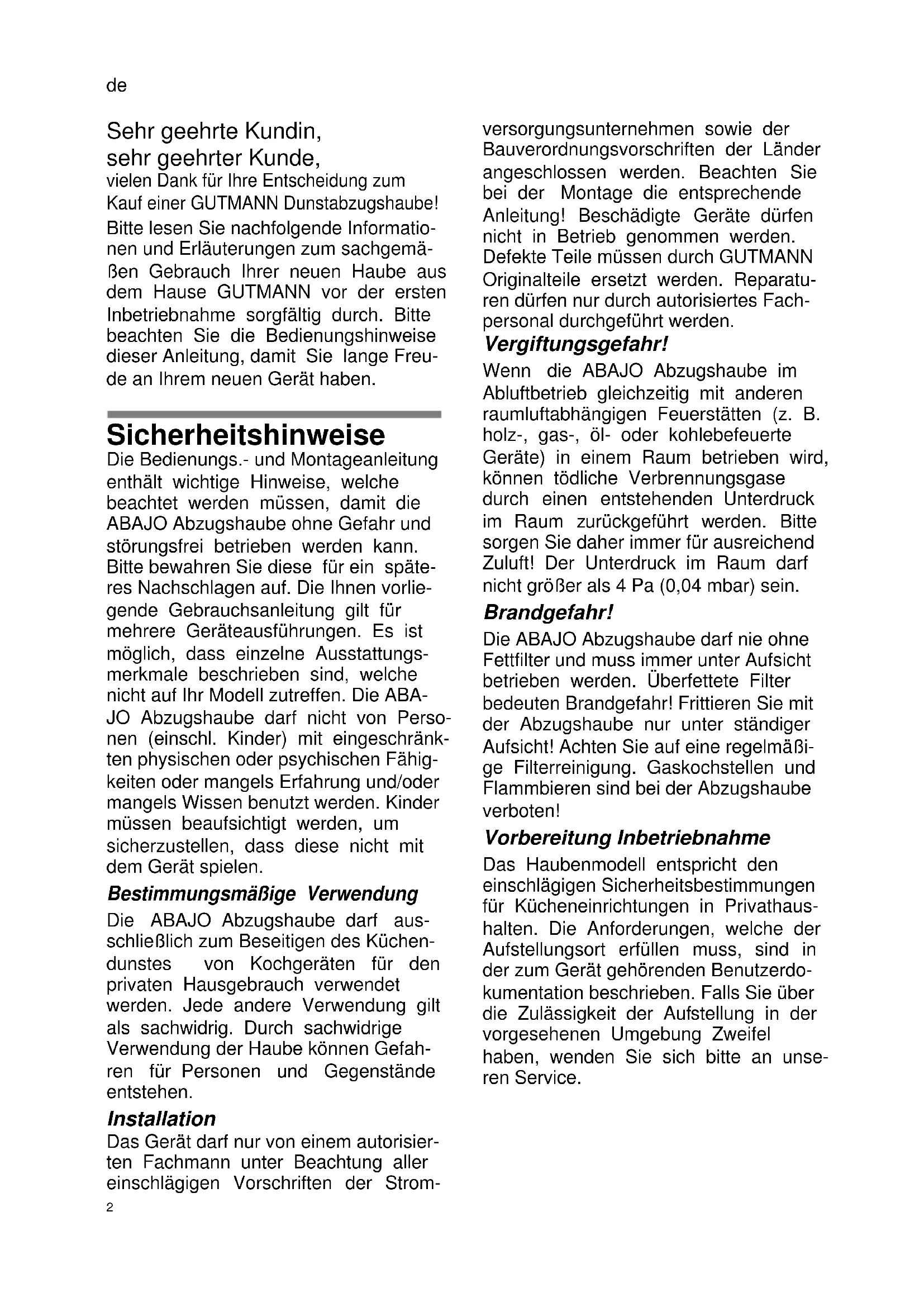 Sehr geehrte Kundin, sehr geehrter Kunde, vielen Dank für Ihre Entscheidung zum Kauf einer GUTMANN Dunstabzugshaube! Bitte lesen Sie nachfolgende Informatio- nen und Erläuterungen zum sachgemä- ßen Gebrauch Ihrer neuen Haube aus dem Hause GUTMANN vor der ersten Inbetriebnahme sorgfältig durch. Bitte beachten Sie die Bedienungshinweise dieser Anleitung, damit Sie lange Freu- de an Ihrem neuen Gerät haben. Sicherheitshinweise Die Bedienungs.- und Montageanleitung enthält wichtige Hinweise, welche beachtet werden müssen, damit die ABAJO Abzugshaube ohne Gefahr und störungsfrei betrieben werden kann. Bitte bewahren Sie diese für ein späte- res Nachschlagen auf. Die Ihnen vorlie- gende Gebrauchsanleitung gilt für mehrere Geräteausführungen. Es ist möglich, dass einzelne Ausstattungs- merkmale beschrieben sind, welche nicht auf Ihr Modell zutreffen. Die ABA- JO Abzugshaube darf nicht von Perso- nen (einschl. Kinder) mit eingeschränk- ten physischen oder psychischen Fähig- keiten oder mangels Erfahrung und/oder mangels Wissen benutzt werden. Kinder müssen beaufsichtigt werden, um sicherzustellen, dass diese nicht mit dem Gerät spielen. Bestimmungsmäßige Verwendung Die ABAJO Abzugshaube darf aus- schließlich zum Beseitigen des Küchen- dunstes von Kochgeräten für den privaten Hausgebrauch verwendet werden. Jede andere Verwendung gilt als sachwidrig. Durch sachwidrige Verwendung der Haube können Gefah- ren für Personen und Gegenstände entstehen. Installation Das Gerät darf nur von einem autorisier- ten Fachmann unter Beachtung aller einschlägigen Vorschriften der Strom- versorgungsunternehmen sowie der Bauverordnungsvorschriften der Länder angeschlossen werden. Beachten Sie bei der Montage die entsprechende Anleitung! Beschädigte Geräte dürfen nicht in Betrieb genommen werden. Defekte Teile müssen durch GUTMANN Originalteile ersetzt werden. Reparatu- ren dürfen nur durch autorisiertes Fach- personal durchgeführt werden. Vergiftungsgefahr! Wenn die ABAJO Abzugshaube im Abluftbetrieb gleichzeitig mit anderen raumluftabhängigen Feuerstätten (z. B. holz-, gas-, öl- oder kohlebefeuerte Geräte) in einem Raum betrieben wird, können tödliche Verbrennungsgase durch einen entstehenden Unterdruck im Raum zurückgeführt werden. Bitte sorgen Sie daher immer für ausreichend Zuluft! Der Unterdruck im Raum darf nicht größer als 4 Pa (0,04 mbar) sein. Brandgefahr! Die ABAJO Abzugshaube darf nie ohne Fettfilter und muss immer unter Aufsicht betrieben werden. Überfettete Filter bedeuten Brandgefahr! Frittieren Sie mit der Abzugshaube nur unter ständiger Aufsicht! Achten Sie auf eine regelmäßi- ge Filterreinigung. Gaskochstellen und Flammbieren sind bei der Abzugshaube verboten! Vorbereitung Inbetriebnahme Das Haubenmodell entspricht den einschlägigen Sicherheitsbestimmungen für Kücheneinrichtungen in Privathaus- halten. Die Anforderungen, welche der Aufstellungsort erfüllen muss, sind in der zum Gerät gehörenden Benutzerdo- kumentation beschrieben. Falls Sie über die Zulässigkeit der Aufstellung in der vorgesehenen Umgebung Zweifel haben, wenden Sie sich bitte an unse- ren Service.de