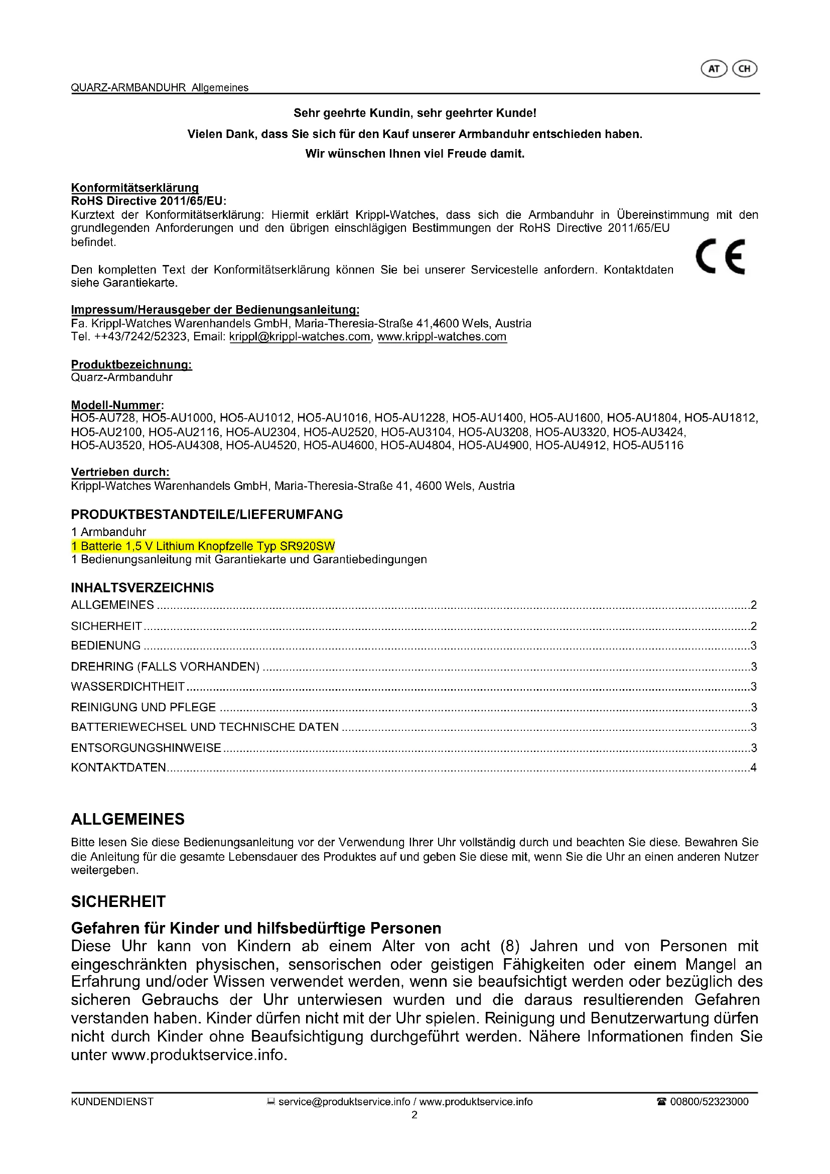 Kurztext der Konformitätserklärung: Hiermit erklart Krippl-Watches, dass sich die Armbanduhr in Übereinstimmung mit den grundlegenden Anforderungen und den übrigen einschlögigen Bestimmungen der RoHS Directive 2011/65/EU befindet.