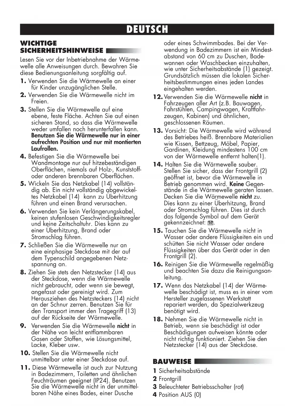 AND PROPERTY. Technical modifications reservedDEUTSCH WICHTIGE SICHERHEITSHINWEISE Lesen Sie vor der Inbetriebnahme der Wärme- welle alle Anweisungen durch. Bewahren Sie diese Bedienungsanleitung sorgfältig auf.