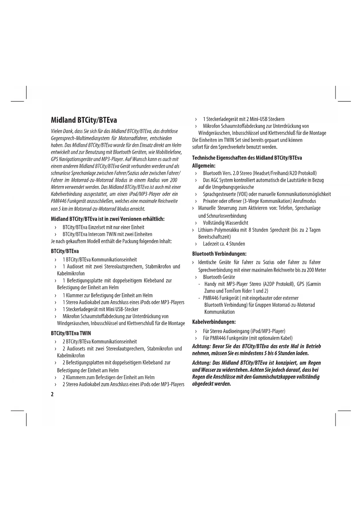 - GERÄTEFUNKTIONEN Midland BTCity/BTEva Vielen Dank, dass Sie sich für das Midland BTCity/BTEva, das drahtlose Gegensprech-Multimediasystem für Motorradfahrer, entschieden haben. Das Midland BTCity/BTEva wurde für den Einsatz direkt am Helm entwickelt und zur Benutzung mit Bluetooth Geräten, wie Mobiltelefone, GPS Navigationsgeräte und MP3-Player. Auf Wunsch kann es auch mit einem anderen Midland BTCity/BTEva Gerät verbunden werden und als schnurlose Sprechanlage zwischen Fahrer/Sozius oder zwischen Fahrer/ Fahrer im Motorrad-zu-Motorrad Modus in einem Radius von 200 Metern verwendet werden. Das Midland BTCity/BTEva ist auch mit einer Kabelverbindung ausgestattet, um einen iPod/MP3-Player oder ein PMR446 Funkgerät anzuschließen, welches eine maximale Reichweite von 5 km im Motorrad-zu-Motorrad Modus erreicht. Midland BTCity/BTEva ist in zwei Versionen erhältlich: › BTCity/BTEva Einzelset mit nur einer Einheit › BTCity/BTEva Intercom TWIN mit zwei Einheiten Je nach gekauftem Modell enthält die Packung folgenden Inhalt: BTCity/BTEva › 1 BTCity/BTEva Kommunikationseinheit › 1 Audioset mit zwei Stereolautsprechern, Stabmikrofon und Kabelmikrofon › 1 Befestigungsplatte mit doppelseitigem Klebeband zur Befestigung der Einheit am Helm › 1 Klammer zur Befestigung der Einheit am Helm › 1 Stereo Audiokabel zum Anschluss eines iPods oder MP3-Players › 1 Steckerladegerät mit Mini USB-Stecker › Mikrofon Schaumstoabdeckung zur Unterdrückung von Windgeräuschen, Inbusschlüssel und Klettverschluß für die Montage BTCity/BTEva TWIN › 2 BTCity/BTEva Kommunikationseinheit › 2 Audiosets mit zwei Stereolautsprechern, Stabmikrofon und Kabelmikrofon › 2 Befestigungsplatten mit doppelseitigem Klebeband zur Befestigung der Einheit am Helm › 2 Klammern zum Befestigen der Einheit am Helm › 2 Stereo Audiokabel zum Anschluss eines iPods oder MP3-Players › 1 Steckerladegerät mit 2 Mini-USB Steckern › Mikrofon Schaumstoabdeckung zur Unterdrückung von Windgeräuschen, Inbusschlüssel und Klettverschluß für die Montage Die Einheiten im TWIN Set sind bereits gepaart und können sofort für den Sprechverkehr benutzt werden. Technische Eigenschaften des Midland BTCity/BTEva Allgemein: › Bluetooth Vers. 2.0 Stereo (Headset/Freihand/A2D Protokoll) › Das AGC System kontrolliert automatisch die Lautstärke in Bezug auf die Umgebungsgeräusche › Sprachgesteuerte (VOX) oder manuelle Kommunikationsmöglichkeit › Privater oder oener (3-Wege Kommunikation) Anrufmodus › Manuelle Steuerung zum Aktivieren von: Telefon, Sprechanlage und Schnurlosverbindung › Vollständig Wasserdicht › Lithium-Polymerakku mit 8 Stunden Sprechzeit (bis zu 2 Tagen Bereitschaftszeit) › Ladezeit ca. 4 Stunden Bluetooth Verbindungen: › Identische Geräte für Fahrer zu Sozius oder Fahrer zu Fahrer Sprechverbindung mit einer maximalen Reichweite bis zu 200 Meter › Bluetooth Geräte - Handy mit MP3-Player Stereo (A2DP Protokoll), GPS (Garmin Zumo und TomTom Rider 1 und 2) - PMR446 Funkgerät ( mit eingebauter oder externer Bluetooth Verbindung) für Gruppen Motorrad-zu-Motorrad Kommunikation Kabelverbindungen: › Für Stereo Audioeingang (iPod/MP3-Player) › Für PMR446 Funkgeräte (mit optionalem Kabel) Achtung: Bevor Sie das BTCity/BTEva das erste Mal in Betrieb nehmen, müssen Sie es mindestens 5 bis 6 Stunden laden. Achtung: Das Midland BTCity/BTEva ist konzipiert, um Regen und Wasser zu widerstehen. Achten Sie jedoch darauf, dass bei Regen die Anschlüsse mit den Gummischutzkappen vollständig abgedeckt werden.D p. 152