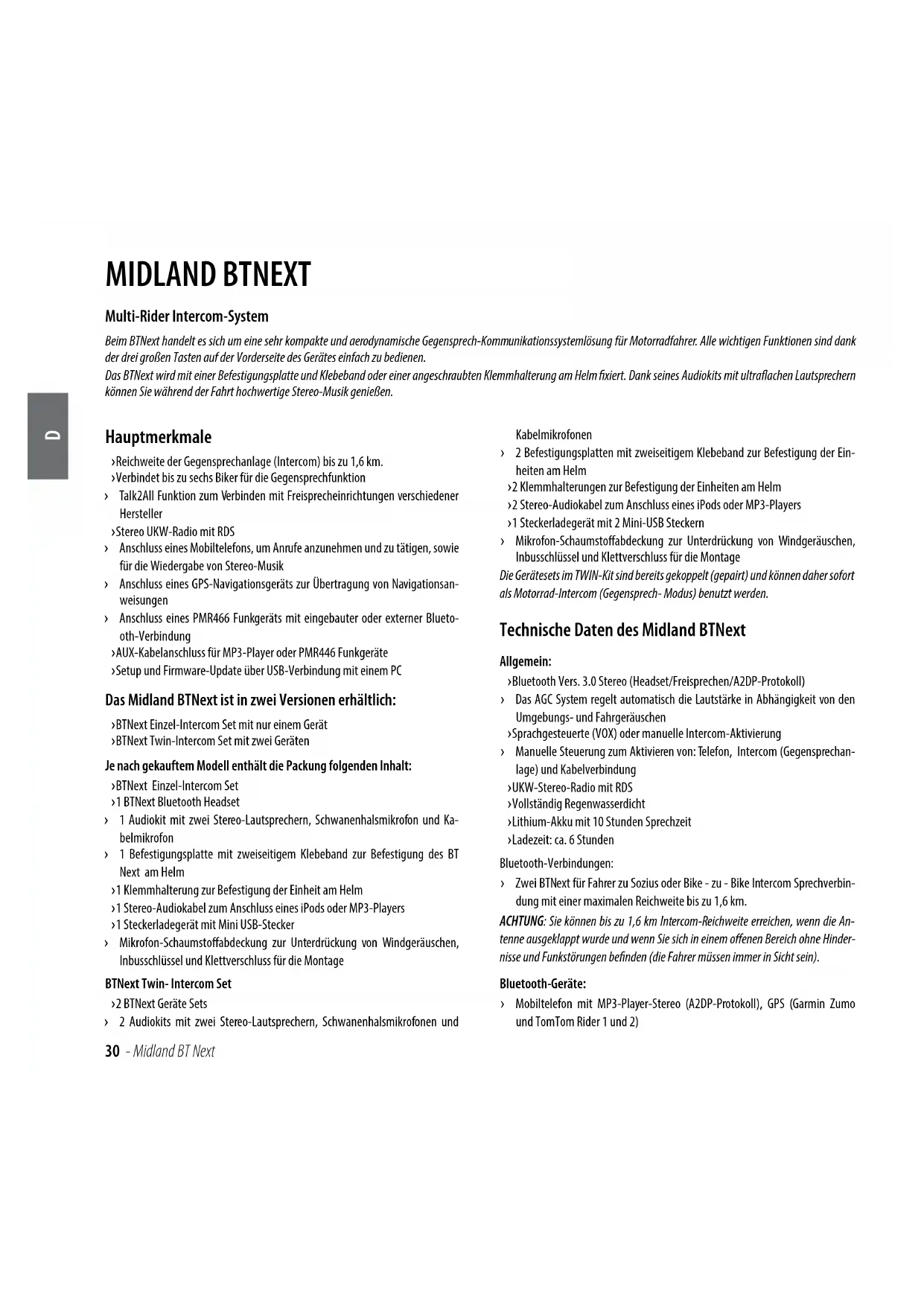 MIDLAND BTNEXT Multi-Rider Intercom-System Beim BTNext handelt es sich um eine sehr kompakte und aerodynamische Gegensprech-Kommunikationssystemlösung für Motorradfahrer. Alle wichtigen Funktionen sind dank der drei großen Tasten auf der Vorderseite des Gerätes einfach zu bedienen. Das BTNext wird mit einer Befestigungsplatte und Klebeband oder einer angeschraubten Klemmhalterung am Helm xiert. Dank seines Audiokits mit ultraachen Lautsprechern können Sie während der Fahrt hochwertige Stereo-Musik genießen. Hauptmerkmale › Reichweite der Gegensprechanlage (Intercom) bis zu 1,6 km. › Verbindet bis zu sechs Biker für die Gegensprechfunktion › Talk2All Funktion zum Verbinden mit Freisprecheinrichtungen verschiedener Hersteller › Stereo UKW-Radio mit RDS › Anschluss eines Mobiltelefons, um Anrufe anzunehmen und zu tätigen, sowie für die Wiedergabe von Stereo-Musik › Anschluss eines GPS-Navigationsgeräts zur Übertragung von Navigationsan- weisungen › Anschluss eines PMR466 Funkgeräts mit eingebauter oder externer Blueto- oth-Verbindung › AUX-Kabelanschluss für MP3-Player oder PMR446 Funkgeräte › Setup und Firmware-Update über USB-Verbindung mit einem PC Das Midland BTNext ist in zwei Versionen erhältlich: › BTNext Einzel-Intercom Set mit nur einem Gerät › BTNext Twin-Intercom Set mit zwei GerätenJe nach gekauftem Modell enthält die Packung folgenden Inhalt: › BTNext Einzel-Intercom Set › 1 BTNext Bluetooth Headset › 1 Audiokit mit zwei Stereo-Lautsprechern, Schwanenhalsmikrofon und Ka- belmikrofon › 1 Befestigungsplatte mit zweiseitigem Klebeband zur Befestigung des BT Next am Helm › 1 Klemmhalterung zur Befestigung der Einheit am Helm › 1 Stereo-Audiokabel zum Anschluss eines iPods oder MP3-Players › 1 Steckerladegerät mit Mini USB-Stecker › Mikrofon-Schaumstoabdeckung zur Unterdrückung von Windgeräuschen, Inbusschlüssel und Klettverschluss für die MontageBTNext Twin- Intercom Set › 2 BTNext Geräte Sets › 2 Audiokits mit zwei Stereo-Lautsprechern, Schwanenhalsmikrofonen und Kabelmikrofonen › 2 Befestigungsplatten mit zweiseitigem Klebeband zur Befestigung der Ein- heiten am Helm › 2 Klemmhalterungen zur Befestigung der Einheiten am Helm › 2 Stereo-Audiokabel zum Anschluss eines iPods oder MP3-Players › 1 Steckerladegerät mit 2 Mini-USB Steckern › Mikrofon-Schaumstoabdeckung zur Unterdrückung von Windgeräuschen, Inbusschlüssel und Klettverschluss für die MontageDie Gerätesets im TWIN-Kit sind bereits gekoppelt (gepairt) und können daher sofort als Motorrad-Intercom (Gegensprech- Modus) benutzt werden. Technische Daten des Midland BTNext Allgemein: › Bluetooth Vers. 3.0 Stereo (Headset/Freisprechen/A2DP-Protokoll) › Das AGC System regelt automatisch die Lautstärke in Abhängigkeit von den Umgebungs- und Fahrgeräuschen › Sprachgesteuerte (VOX) oder manuelle Intercom-Aktivierung › Manuelle Steuerung zum Aktivieren von: Telefon, Intercom (Gegensprechan- lage) und Kabelverbindung › UKW-Stereo-Radio mit RDS › Vollständig Regenwasserdicht › Lithium-Akku mit 10 Stunden Sprechzeit › Ladezeit: ca. 6 StundenBluetooth-Verbindungen: › Zwei BTNext für Fahrer zu Sozius oder Bike - zu - Bike Intercom Sprechverbin- dung mit einer maximalen Reichweite bis zu 1,6 km. ACHTUNG: Sie können bis zu 1,6 km Intercom-Reichweite erreichen, wenn die An- tenne ausgeklappt wurde und wenn Sie sich in einem oenen Bereich ohne Hinder-nisse und Funkstörungen benden (die Fahrer müssen immer in Sicht sein).Bluetooth-Geräte: › Mobiltelefon mit MP3-Player-Stereo (A2DP-Protokoll), GPS (Garmin Zumo und TomTom Rider 1 und 2)D Midland BT Next - 31 › PMR446-Funkgerät (mit eingebauter oder externer Bluetooth-Verbindung) für Motorrad zu Motorrad-Gruppenkommunikation Kabelverbindungen: › Für Stereo-Audioeingang (iPod/MP3-Player) › Für PMR446-Funkgerät (mit optionalem Kabel) Achtung: Das Midland BTNext ist regen- und wasserfest konzipiert. Stellen Sie aber dennoch sicher, dass bei Regen die Gummischutzkappen die Anschlüsse vollständig abdecken. Aufladen des Akkus Achtung: Vergewissern Sie sich, dass das Gerät voll aufgeladen wurde. Bitte laden Sie das Gerät vor der ersten Benutzung für mindestens 8 Stunden auf. Zum Laden das Steckerladegerät in die Ladebuchse stecken (nehmen Sie die Gummischutzkappe ab, um der Stecker einzustecken). Die rote LED am Gerät fängt an zu blinken, sobald der Ladevorgang startet. Laden Sie das Headset, bis die rote LED aufhört zu blinken oder die blaue LED aueuchtet. Wenn der Ladevorgang abgeschlossen ist (die rote LED blinkt nicht mehr), ziehen Sie den Ladestecker vom Headset ab. Normalerweise dauert beim ersten Mal das volle Auaden 6 Stunden. Achtung: Jedes Mal, wenn der Mini-USB-Ladestecker eingesteckt (oder abgezogen) wurde, wird das Gerät gleichzeitig automatisch ausgeschaltet. Um das Gerät wäh- rend des Ladevorgangs weiter zu benutzen, müssen Sie es daher nach dem Einste- cken des Ladesteckers noch einmal einschalten. Beschreibung des Geräts und Montagehalterung Das BTNext verfügt auf der Vorderseite über fünf Tasten. Die drei großen Haupt- tasten sind Multi-Funktionstasten: „Weiter“ (links), die „mittlere“ Taste und „Zurück“ (rechts). Die beiden kleinen runden Tasten sind die Lautstärkestärketa- sten + und -. Beschreibung der Kabelverbindung › Ladebuchse: hier kann das Gerät mit einem Standard Mini-USBNetzteil ge- laden werden › Audioset Buchse: hier können Sie ein Audioset anschließen (Stereo-Headset und Mikrofon) › Zusatzbuchse für Audiogeräte (AUX) 2,5mm: hier können Sie eine Audio- quelle, wie z. B. einen Stereo iPod/MP3-Player oder PMR446 Funkgerät an- schließen Zusätzlich besitzt das BTNext oben eine ausklappbare Antenne für maximale Reichweite. Drücken Sie die Antenne zum Ausklappen sanft nach hinten. Sie klappt an- schließend automatisch aus. Drücken Sie zum Einklappen der Antenne diese nur nach unten und bewegen Sie sie wied