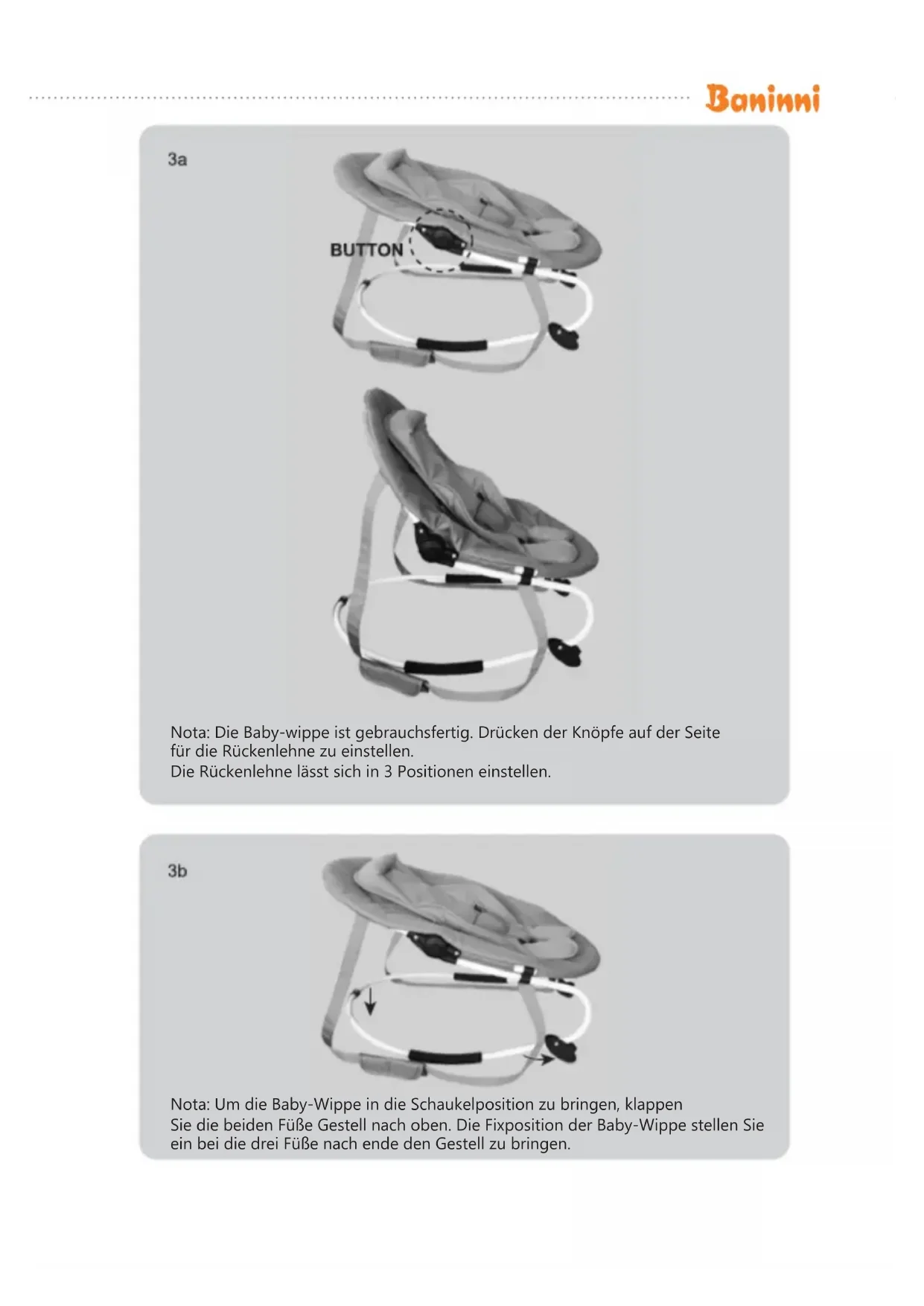 Note: Die Baby-wippe ist gebrauchsfertig. Drücken der Knöpfe auf der Seite für die Ruckenlehne zu einstehen.