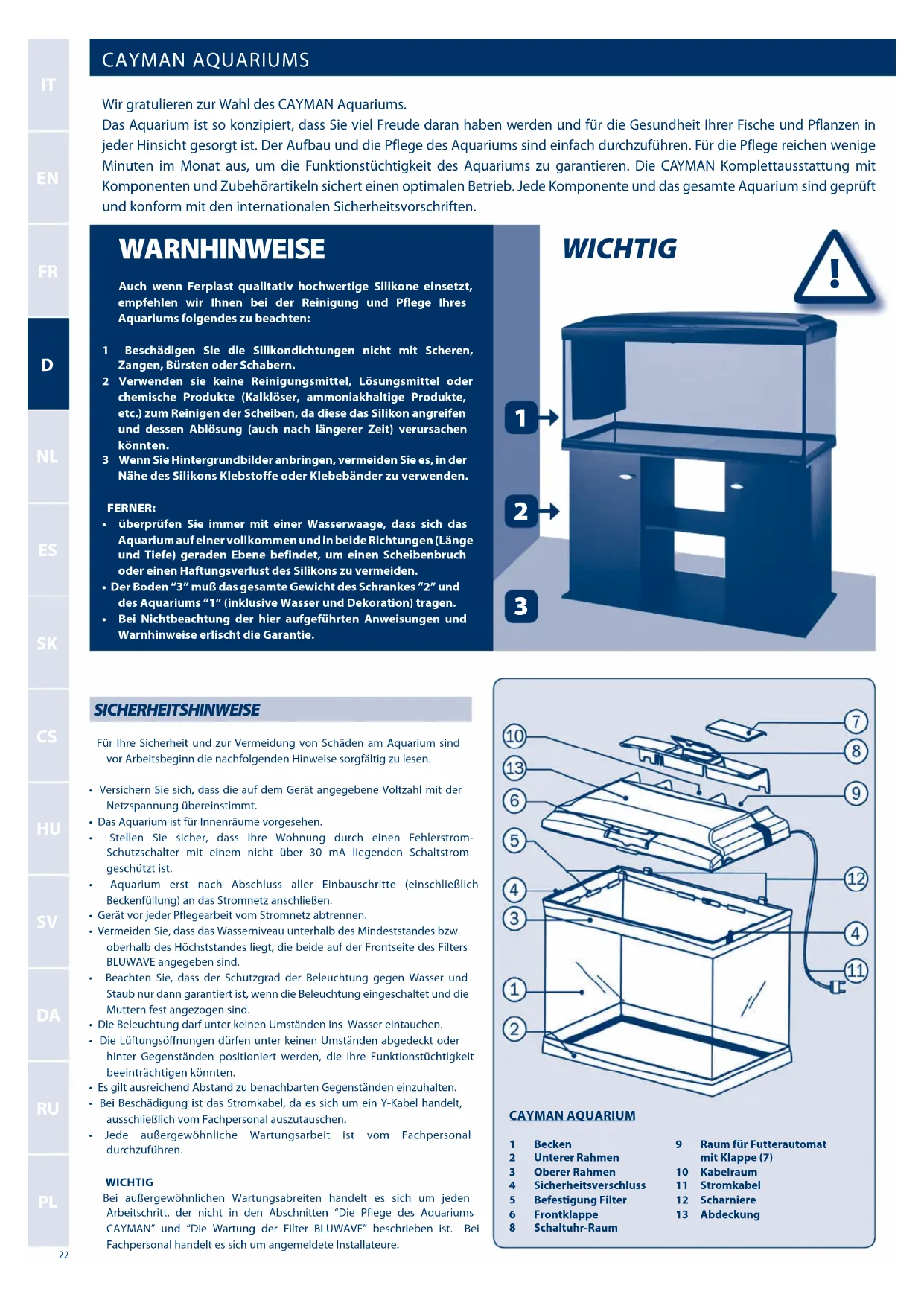 CAYMAN AQUARIUMS SICHERHEITSHINWEISE Für Ihre Sicherheit und zur Vermeidung von Schäden am Aquarium sind vor Arbeitsbeginn die nachfolgenden Hinweise sorgfältig zu lesen.• Versichern Sie sich, dass die auf dem Gerät angegebene Voltzahl mit der Netzspannung übereinstimmt.• Das Aquarium ist für Innenräume vorgesehen.• Stellen Sie sicher, dass Ihre Wohnung durch einen Fehlerstrom-Schutzschalter mit einem nicht über 30 mA liegenden Schaltstrom geschützt ist.• Aquarium erst nach Abschluss aller Einbauschritte (einschließlich Beckenfüllung) an das Stromnetz anschließen.• Gerät vor jeder Pflegearbeit vom Stromnetz abtrennen.• Vermeiden Sie, dass das Wasserniveau unterhalb des Mindeststandes bzw. oberhalb des Höchststandes liegt, die beide auf der Frontseite des Filters BLUWAVE angegeben sind.• Beachten Sie, dass der Schutzgrad der Beleuchtung gegen Wasser und Staub nur dann garantiert ist, wenn die Beleuchtung eingeschaltet und die Muttern fest angezogen sind. • Die Beleuchtung darf unter keinen Umständen ins Wasser eintauchen.• Die Lüftungsöffnungen dürfen unter keinen Umständen abgedeckt oder hinter Gegenständen positioniert werden, die ihre Funktionstüchtigkeit beeinträchtigen könnten.• Es gilt ausreichend Abstand zu benachbarten Gegenständen einzuhalten.• Bei Beschädigung ist das Stromkabel, da es sich um ein Y-Kabel handelt, ausschließlich vom Fachpersonal auszutauschen.• Jede außergewöhnliche Wartungsarbeit ist vom Fachpersonal durchzuführen. WICHTIG Bei außergewöhnlichen Wartungsabreiten handelt es sich um jeden Arbeitschritt, der nicht in den Abschnitten “Die Pflege des Aquariums CAYMAN” und “Die Wartung der Filter BLUWAVE” beschrieben ist. Bei Fachpersonal handelt es sich um angemeldete Installateure.Wir gratulieren zur Wahl des CAYMAN Aquariums. Das Aquarium ist so konzipiert, dass Sie viel Freude daran haben werden und für die Gesundheit Ihrer Fische und Pflanzen in jeder Hinsicht gesorgt ist. Der Aufbau und die Pflege des Aquariums sind einfach durchzuführen. Für die Pflege reichen wenige Minuten im Monat aus, um die Funktionstüchtigkeit des Aquariums zu garantieren. Die CAYMAN Komplettausstattung mit Komponenten und Zubehörartikeln sichert einen optimalen Betrieb. Jede Komponente und das gesamte Aquarium sind geprüft und konform mit den internationalen Sicherheitsvorschriften.CAYMAN AQUARIUM1 Becken2 Unterer Rahmen3 Oberer Rahmen4 Sicherheitsverschluss5 Befestigung Filter6 Frontklappe8 Schaltuhr-Raum9 Raum für Futterautomat mit Klappe (7)10 Kabelraum11 Stromkabel 12 Scharniere13 Abdeckung