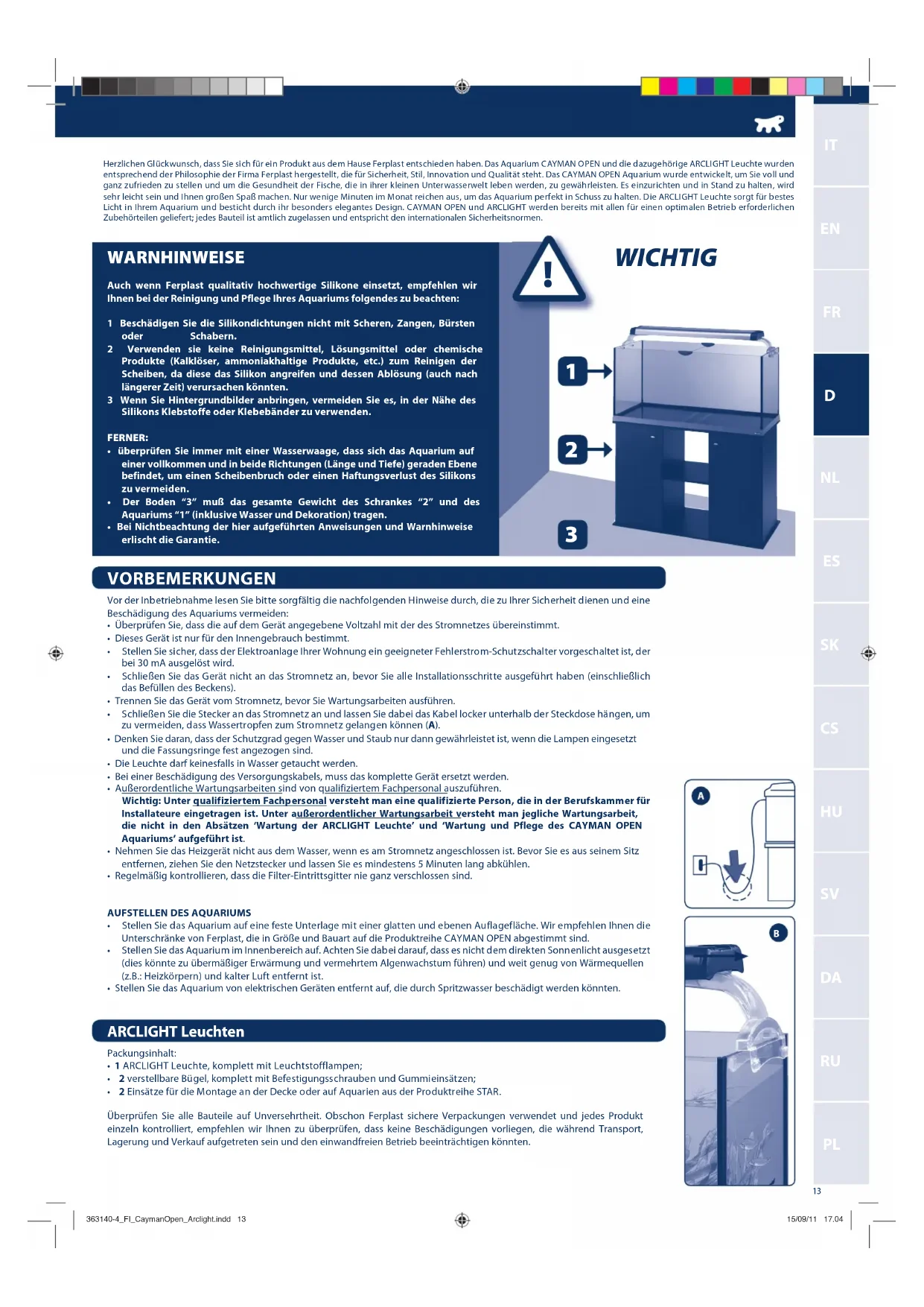 Herzlichen Glückwunsch, dass Sie sich für ein Produkt aus dem Hause Ferplast entschieden haben. Das Aquarium CAYMAN OPEN und die dazugehörige ARCLIGHT Leuchte wurden entsprechend der Philosophie der Firma Ferplast hergestellt, die für Sicherheit, Stil, Innovation und Qualität steht. Das CAYMAN OPEN Aquarium wurde entwickelt, um Sie voll und ganz zufrieden zu stellen und um die Gesundheit der Fische, die in ihrer kleinen Unterwasserwelt leben werden, zu gewährleisten. Es einzurichten und in Stand zu halten, wird sehr leicht sein und Ihnen großen Spaß machen. Nur wenige Minuten im Monat reichen aus, um das Aquarium perfekt in Schuss zu halten. Die ARCLIGHT Leuchte sorgt für bestes Licht in Ihrem Aquarium und besticht durch ihr besonders elegantes Design. CAYMAN OPEN und ARCLIGHT werden bereits mit allen für einen optimalen Betrieb erforderlichen Zubehörteilen geliefert; jedes Bauteil ist amtlich zugelassen und entspricht den internationalen Sicherheitsnormen.
