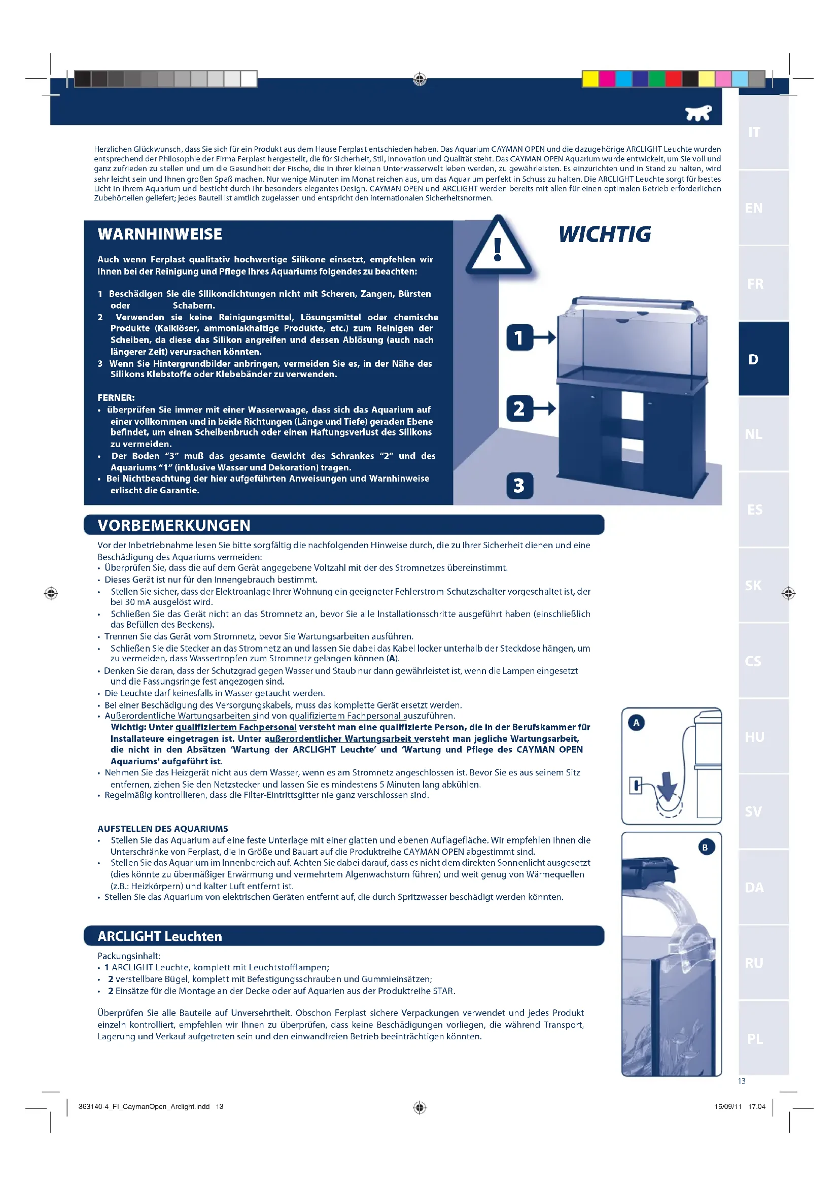 Herzlichen Glückwunsch, dass sie sich für ein Produkt aus dem Hause Ferplast entschieden haben. Das Aquarium CAYMAN OPEN und die dazugehörige ARCLIGHT Leuche wurden inspechend der Philosophie der Firma Ferplast hergestellt, die für Sicherheit, Stil, Innovation und Qualität besteht. Das CAYMAN OPEN Aquarium wurde entwickelten, um sie voll und ganzt zu erfrieden zu stellen und um die Gesundheit der Fische, die in ihrer klinsten Unterwasserwelt留学 werden, zu gewährleisten. Es einzurichten und in Stand zu halten, wird sehr leicht sein und ihren großen Spalmaachen. Nur weniger Minuten im Monat reichen aus, um das Aquarium perfect in Schuss zu halten. Die ARCLIGHT Leuche sorgt für bestes Licht in ihrer Aquarium und besticht durch ihr besonder elegantes Design. CAYMAN OPEN und ARCLIGHT werden bereits mit allen für einen optimalen Betrieb erforderlichen Zubehörheiten geleifert; jegdes Bauteil ist amtlich zugelassen und entspricht den internationellen Sicherheitsnormen.
