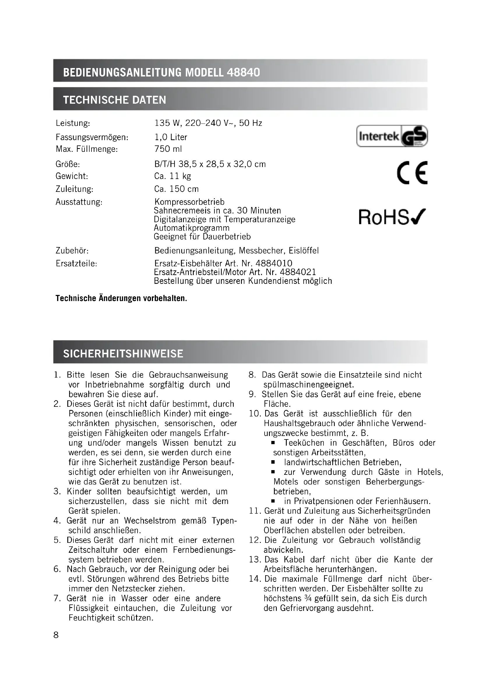 schritten werden. Der Eisbehälter sollte zu höchstens ¾ gefüllt sein, da sich Eis durch den Gefriervorgang ausdehnt. Leistung: 135 W, 220–240 V~, 50 Hz Fassungsvermögen: 1,0 Liter Max. Füllmenge: 750 ml Größe: B/T/H 38,5 x 28,5 x 32,0 cm Gewicht: Ca. 11 kg Zuleitung: Ca. 150 cm Ausstattung: Kompressorbetrieb Sahnecremeeis in ca. 30 Minuten Digitalanzeige mit Temperaturanzeige Automatikprogramm Geeignet für Dauerbetrieb Zubehör: Bedienungsanleitung, Messbecher, Eislöffel Ersatzteile: Ersatz-Eisbehälter Art. Nr. 4884010 Ersatz-Antriebsteil/Motor Art. Nr. 4884021 Bestellung über unseren Kundendienst möglich Technische Änderungen vorbehalten.9 Vor Dem ersten Benutzen
