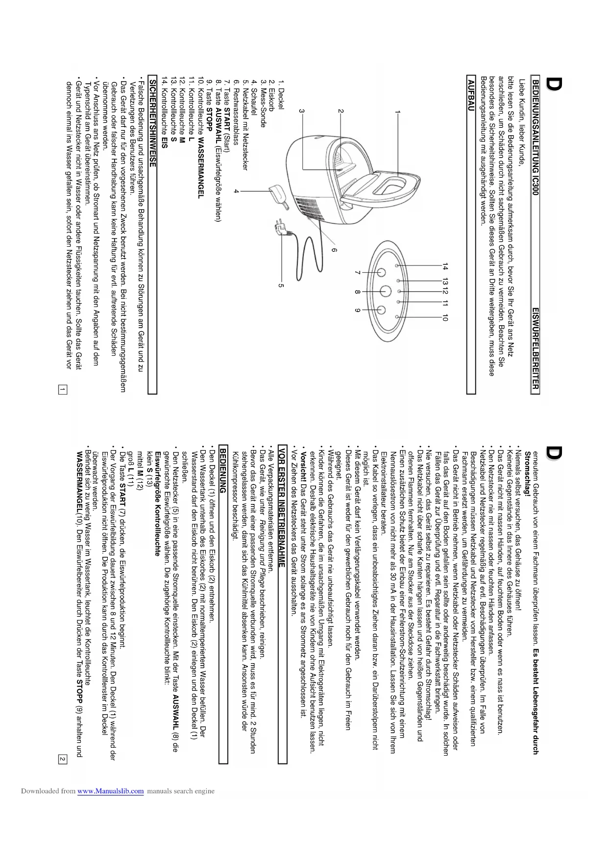 Downloaded from www.Manualslib.com manuals search engineBEDIENUNGSANLEITUNG IC300 EISWÜRFELBEREITER Liebe Kundin, lieber Kunde,bitte lesen Sie die Bedienungsanleitung aufmerksam durch, bevor Sie Ihr Gerät ans Netzanschließen, um Schäden durch nicht sachgemäßen Gebrauch zu vermeiden. Beachten Siebesonders die Sicherheitshinweise. Sollten Sie dieses Gerät an Dritte weitergeben, muss dieseBedienungsanleitung mit ausgehändigt werden. AUFBAU 1. Deckel2. Eiskorb3. Mess-Sonde4. Schaufel 5. Netzkabel mit Netzstecker6. Restwasserablass7. Taste START (Start)8. Taste AUSWAHL (Eiswürfelgröße wählen)9. Taste STOPP10. Kontrollleuchte WASSERMANGEL11. Kontrollleuchte L12. Kontrollleuchte M13. Kontrollleuchte S14. Kontrollleuchte EIS SICHERHEITSHINWEISE