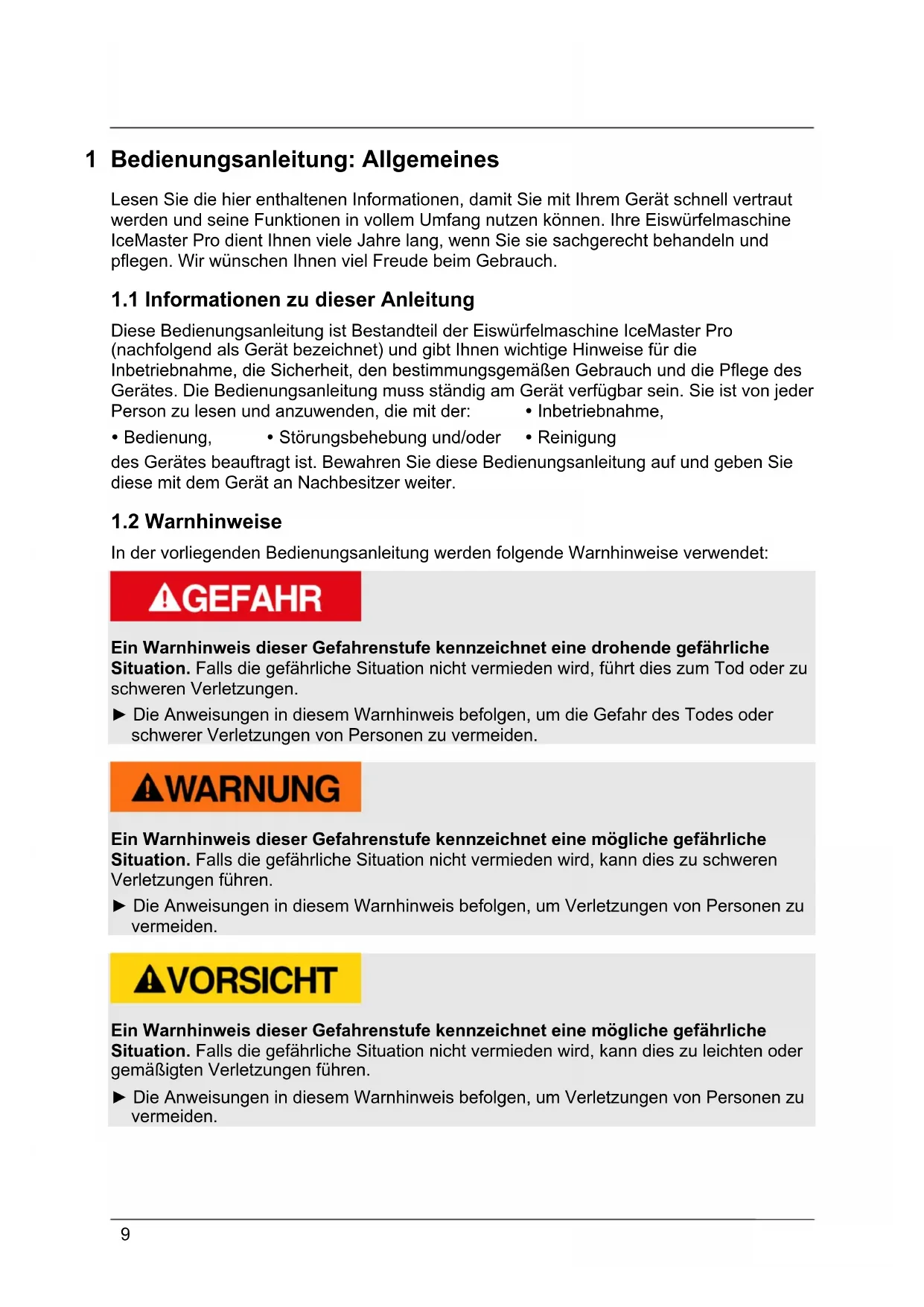 Diese Bedienungsanleitung ist Bestandteil der Eiswürfelmaschine IceMaster Pro (nachfolgend als Gerät bezeichnet) und gibt Ihnen wichtige Hinweise für die Inbetriebnahme, die Sicherheit, den bestimmungsgemäßen Gebrauch und die Pflege des Gerätes. Die Bedienungsanleitung muss ständig am Gerät verfügbar sein. Sie ist von jeder Person zu lesen und anzuwenden, die mit der: Inbetriebnahme, Bedienung, Störungsbehebung und/oder Reinigung des Gerätes beauftragt ist. Bewahren Sie diese Bedienungsanleitung auf und geben Sie diese mit dem Gerät an Nachbesitzer weiter.
