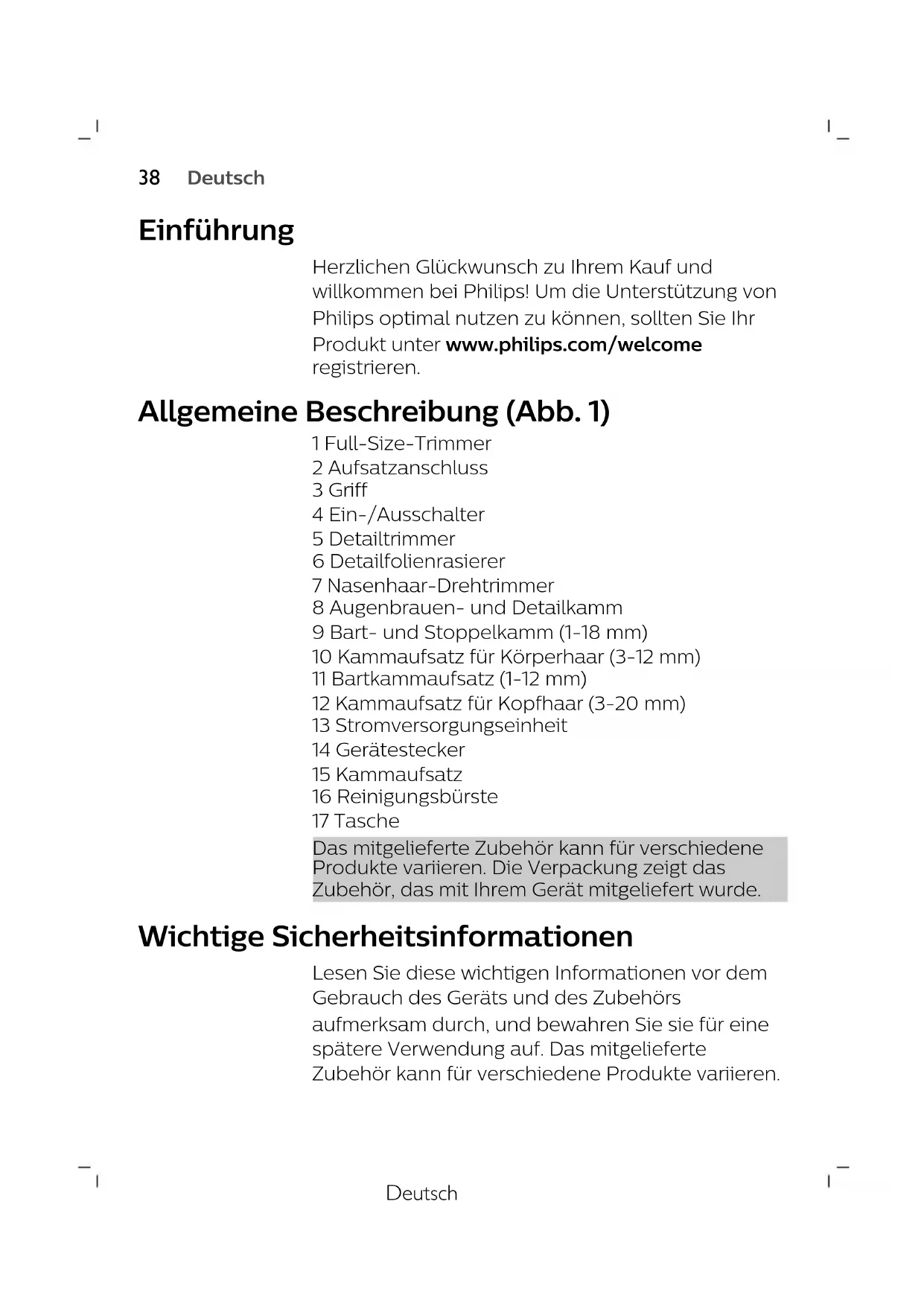 DanskDeutsch Einführung Herzlichen Glückwunsch zu Ihrem Kauf und willkommen bei Philips! Um die Unterstützung von Philips optimal nutzen zu können, sollten Sie Ihr Produkt unter www.philips.com/welcome registrieren. Allgemeine Beschreibung (Abb. 1) 1 Full-Size-Trimmer 2 Aufsatzanschluss 3 Griff 4 Ein-/Ausschalter 5 Detailtrimmer 6 Detailfolienrasierer 7 Nasenhaar-Drehtrimmer 8 Augenbrauen- und Detailkamm 9 Bart- und Stoppelkamm (1-18mm) 10 Kammaufsatz für Körperhaar (3-12mm) 11 Bartkammaufsatz (1-12mm) 12 Kammaufsatz für Kopfhaar (3-20mm) 13 Stromversorgungseinheit 14 Gerätestecker 15 Kammaufsatz 16 Reinigungsbürste 17 Tasche Das mitgelieferte Zubehör kann für verschiedene Produkte variieren. Die Verpackung zeigt das Zubehör, das mit Ihrem Gerät mitgeliefert wurde. Wichtige Sicherheitsinformationen Lesen Sie diese wichtigen Informationen vor dem Gebrauch des Geräts und des Zubehörs aufmerksam durch, und bewahren Sie sie für eine spätere Verwendung auf. Das mitgelieferte Zubehör kann für verschiedene Produkte variieren.