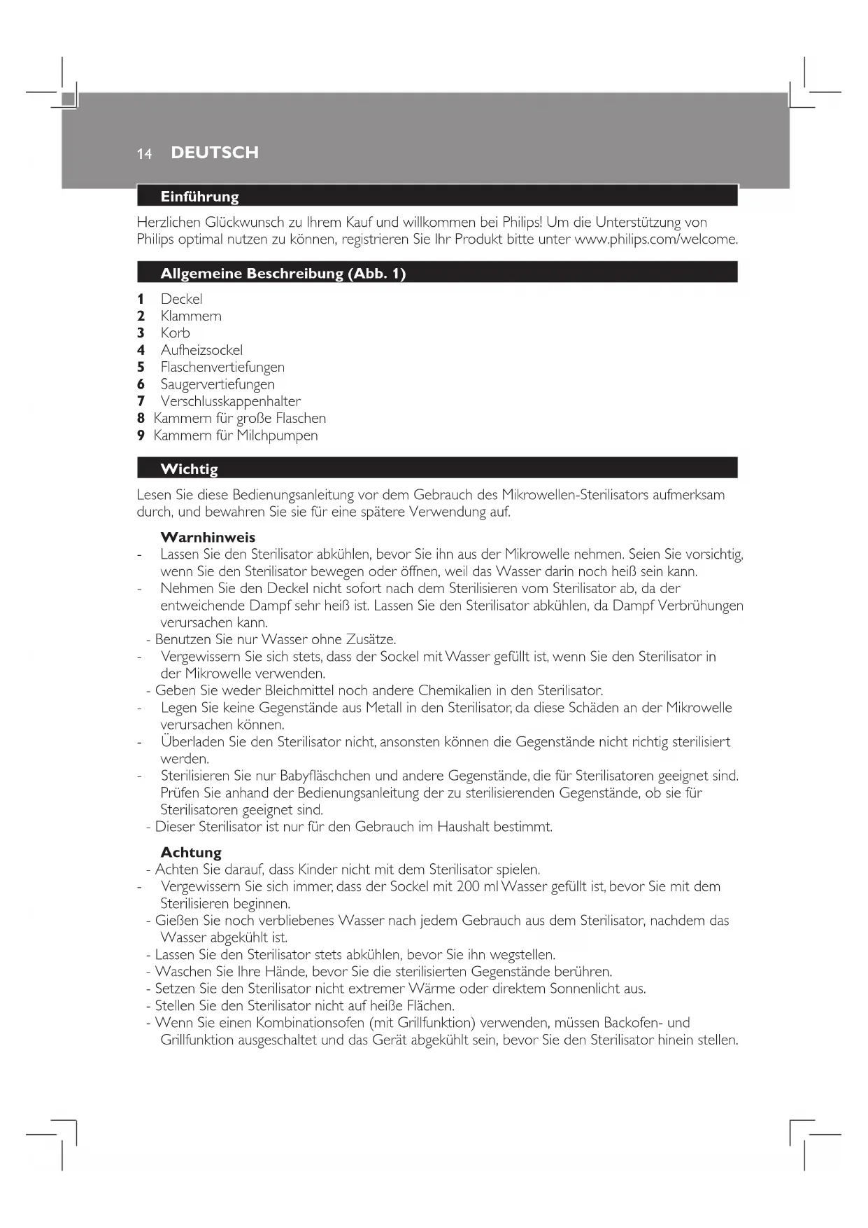 Nehmen Sie den Deckel nicht sofort nach dem Sterilisieren vom Sterilisator ab, da der entweichende Dampf sehr heiß ist. Lassen Sie den Sterilisator abkühlen, da Dampf Verbrühungen verursachen kann. - Benutzen Sie nur Wasser ohne Zusätze. - Vergewissern Sie sich stets, dass der Sockel mit Wasser gefüllt ist, wenn Sie den Sterilisator in der Mikrowelle verwenden. - Geben Sie weder Bleichmittel noch andere Chemikalien in den Sterilisator. - Legen Sie keine Gegenstände aus Metall in den Sterilisator, da diese Schäden an der Mikrowelle verursachen können. - Überladen Sie den Sterilisator nicht, ansonsten können die Gegenstände nicht richtig sterilisiert werden. - Sterilisieren Sie nur Babyäschchen und andere Gegenstände, die für Sterilisatoren geeignet sind. Prüfen Sie anhand der Bedienungsanleitung der zu sterilisierenden Gegenstände, ob sie für Sterilisatoren geeignet sind. - Dieser Sterilisator ist nur für den Gebrauch im Haushalt bestimmt. Achtung - Achten Sie darauf, dass Kinder nicht mit dem Sterilisator spielen. - Vergewissern Sie sich immer, dass der Sockel mit 200 ml Wasser gefüllt ist, bevor Sie mit dem Sterilisieren beginnen. - Gießen Sie noch verbliebenes Wasser nach jedem Gebrauch aus dem Sterilisator, nachdem das Wasser abgekühlt ist. - Lassen Sie den Sterilisator stets abkühlen, bevor Sie ihn wegstellen. - Waschen Sie Ihre Hände, bevor Sie die sterilisierten Gegenstände berühren. - Setzen Sie den Sterilisator nicht extremer Wärme oder direktem Sonnenlicht aus. - Stellen Sie den Sterilisator nicht auf heiße Flächen. - Wenn Sie einen Kombinationsofen (mit Grillfunktion) verwenden, müssen Backofen- und Grillfunktion ausgeschaltet und das Gerät abgekühlt sein, bevor Sie den Sterilisator hinein stellen. DEUTSCHVor dem ersten Gebrauch Reinigen Sie den Sterilisator vor dem ersten Gebrauch gründlich wie unten beschrieben. 1 HebenSiedenKorbvomGerätesockel. 2 FüllenSieeinBabyäschchenodereinenMessbechermitgenau200mlLeitungswasserund gießen Sie dies in den Sockel (Abb. 2). DieWassermengemussexakt200mlbetragen.WennderSockelzuvielWasserenthält,werden dieGegenständenichtrichtigsterilisiert.WennderSockelnichtgenügendWasserenthält,kann dieszuSchädenamSterilisatoroderderMikrowelleführen. 3 SetzenSiedenKorbindenGerätesockel(Abb.3). 4 SetzenSiedenDeckelaufdenSterilisator(1),unddrückenSiedieKlammernnachunten,um denDeckel(2)zuverriegeln.(Abb.4) 5 StellenSiedenSterilisatorindieMikrowelle.(Abb.5) Hinweis: Vergewissern Sie sich, dass die Mikrowelle sauber und trocken ist, bevor Sie mit dem Sterilisationsvorgang beginnen. Hinweis: Wenn Sie einen Kombinationsofen verwenden, müssen Backofen- und Grillfunktion ausgeschaltet und das Gerät abgekühlt sein, bevor Sie den Sterilisator hinein stellen. 6 StellenSiediepassendeWattleistungundZeitein(siehedieTabelleimKapitel“Den Mikrowellensterilisatorverwenden”),undlassenSiedieMikrowellelaufen. 7 NachdemsichdieMikrowelleausgeschaltethat,öffnenSiesie,undlassenSiedenSterilisator abkühlen,bevorSieihnausderMikrowellenehmen. 8 ÖffnenSiedieKlammern(1),undnehmenSiedenDeckel(2)ab(Abb.6). 9 GießenSiedasrestlicheWasseraus,undspülenSiedenSockelunddenKorbgründlichab. Für den Gebrauch vorbereiten Den Korb füllen Bevor Sie die Gegenstände zum Sterilisieren in den Sterilisator legen, reinigen Sie sie gründlich in der Spülmaschine oder per Hand mit heißem Wasser und etwas Spülmittel. Achten Sie darauf, alle Milchrückstände zu beseitigen. Hinweis: Vergewissern Sie sich, dass alle zu sterilisierenden Gegenstände vollständig zerlegt sind, und legen Sie sie mit den Öffnungen nach unten in den Korb, damit kein Wasser hinein läuft. Hinweis: Legen Sie die Gegenstände nicht zu eng aneinander. Der Dampf muss um die Gegenstände herum zirkulieren können, um eine effektive Sterilisation sicherzustellen. Es gibt mehrere Möglichkeiten, den Korb zu füllen: Vier Philips AVENT Flaschen 1 Stellen Sie die Flaschen mit der Öffnung nach unten in die Flaschenvertiefungen. (Abb. 7) 2 LegenSiedieSaugerindieSaugervertiefungen(Abb.8). 3 LegenSiedieSchraubringeloseaufdieSauger(Abb.9). Hinweis: Größere Schraubringe passen nur hinein, wenn sie schräg über die Sauger gelegt werden. 4 LegenSiedieVerschlusskappenindieVerschlusskappenhalter(Abb.10). DEUTSCH 15Zwei große Philips AVENT Flaschen (330 ml) 1 SetzenSiedenRandderFlaschenindieKammernfürgroßeFlaschenein(Abb.11). 2 LegenSiedieSaugerindieSaugervertiefungen(Abb.12). 3 LegenSiedieSchraubringeloseaufdieSauger(Abb.13). Hinweis: Größere Schraubringe passen nur hinein, wenn sie schräg über die Sauger gelegt werden. 4 LegenSiedieVerschlusskappenindieVerschlusskappenhalter(Abb.14). Vier Philips AVENT Mehrwegbecher und Schraubdeckel 1 SetzenSiedieMehrwegbechermitderÖffnungnachuntenindenKorb(Abb.15). 2 Stellen Sie die Deckel senkrecht um die Flaschen herum. (Abb. 16) Zwei Philips AVENT Milchpumpen und zwei Philips AVENT Flaschen LegenSiedieelektrischenTeilenichtindenSterilisator. 1 NehmenSiedieMilchpumpevollständigauseinander. 2 SetzenSiedenRanddesPumpengehäusesindieKammernfürMilchpumpenimBodendes Korbsein(Abb.17). 3 Stellen Sie die Flaschen mit der Öffnung nach unten in die Flaschenvertiefungen (Abb. 18). 4 VerteilenSiedieverbleibendennichtelektrischenTeilederMilchpumpeanfreienStellenim Korb(Abb.19). Hinweis: Vergewissern Sie sich, dass Dampf um diese Teile zirkulieren kann. Den Mikrowellensterilisator verwenden LegenSienurGegenständeindenSterilisator,diezumSterilisierengeeignetsind.Die FlaschenbürsteoderGegenstände,diemitFlüssigkeitgefülltsind,z.B.mitKühlüssigkeitgefüllte Beißringe, dürfen nicht sterilisiert werden. Hinweis: Reinigen Sie Flaschen und andere Teile vor dem Sterilisieren. 1 HebenSiedenKorbvomGerätesockel. 2 FüllenSieeinBabyäschchenodereinenMessbechermitgenau200mlLeitungswasserund gießen Sie dies in den Sockel (Abb. 2). DieWassermengemussexakt200mlbetragen.WennderSockelzuvielWasserenthält,werden dieGegenständenichtrichtigsterilisiert.WennderSocke