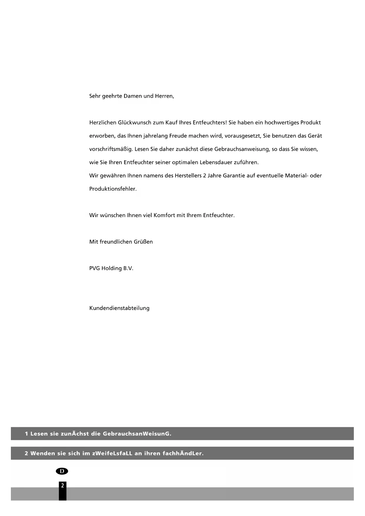 Sehr geehrte Damen und Herren, Herzlichen Glückwunsch zum Kauf Ihres Entfeuchters! Sie haben ein hochwertiges Produkt erworben, das Ihnen jahrelang Freude machen wird, vorausgesetzt, Sie benutzen das Gerät vorschriftsmäßig. Lesen Sie daher zunächst diese Gebrauchsanweisung, so dass Sie wissen, wie Sie Ihren Entfeuchter seiner optimalen Lebensdauer zuführen. Wir gewähren Ihnen namens des Herstellers 2 Jahre Garantie auf eventuelle Material- oder Produktionsfehler. Wir wünschen Ihnen viel Komfort mit Ihrem Entfeuchter. Mit freundlichen Grüßen PVG Holding B.V. KundendienstabteilungBELANGRIJKE ONDERDELEN Bedieningspaneel Uitlaat van droge lucht Uitneembaar waterreservoir Inlaat van vochtige lucht Luchtfilter Afvoertuit (ø 13 mm) met dop Zwenkwieltje Stekker en snoer Handvat