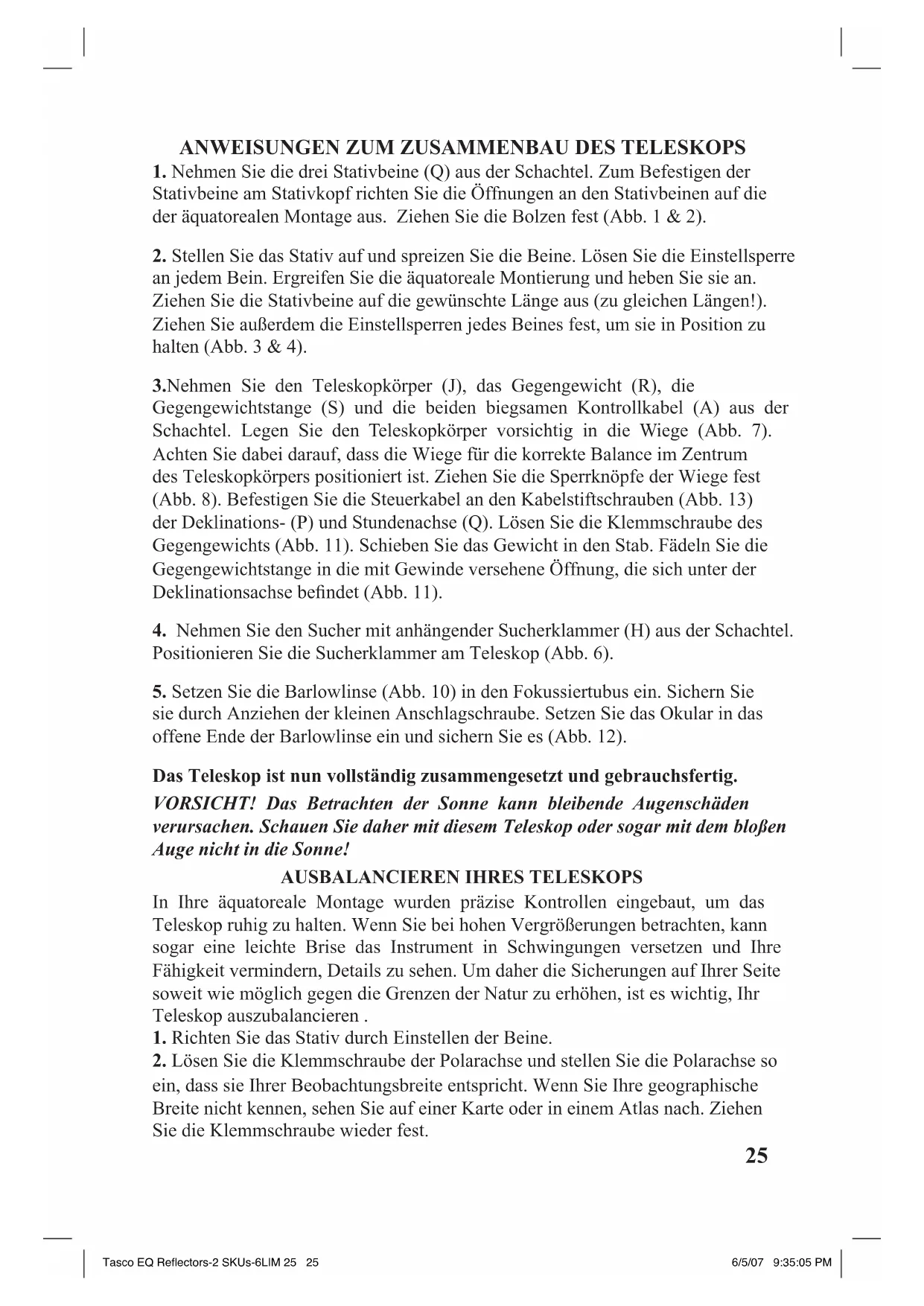 Zum Zentrieren des Objektes mit dem roten Punkt im StarPointer verwenden Sie bitte den Feineinstellungsring an der Stange für die langsame Bewegung der Höhe. Tasco EQ Reflectors-2 SKUs-6LIM 26 26 6/5/07 9:35:05 PM27 VORSICHT! Das Betrachten der Sonne kann bleibende Augenschäden verursachen. Schauen Sie daher mit diesem Produkt oder sogar mit dem bloßen Auge nicht in die Sonne! Lassen Sie ein Teleskop tagsüber nie unbeaufsichtigt, denn ein Kind könnte mit ihm in die Sonne blicken und bleibende Sehschäden erleiden. DER MONDFILTER Ein Mondlter wurde Ihrem Teleskop beigelegt, um Blendlicht zu entfernen und den Kontrast beim Betrachten des Mondes zu erhöhen. Um ihn am Okular des Teleskops zu befestigen, schrauben Sie den Filter auf das mit Gewinde versehene Ende des Okulars. VORSICHT! Der Mondlter sollte nur zum Betrachten des Mondes verwendet werden. Er ist nicht zum Betrachten der Sonne bestimmt. Die Betrachtung der Sonne durch dieses Teleskop (mit oder ohne den Filter), oder sogar mit dem bloßen Auge, kann bleibende Augenschäden verursachen.