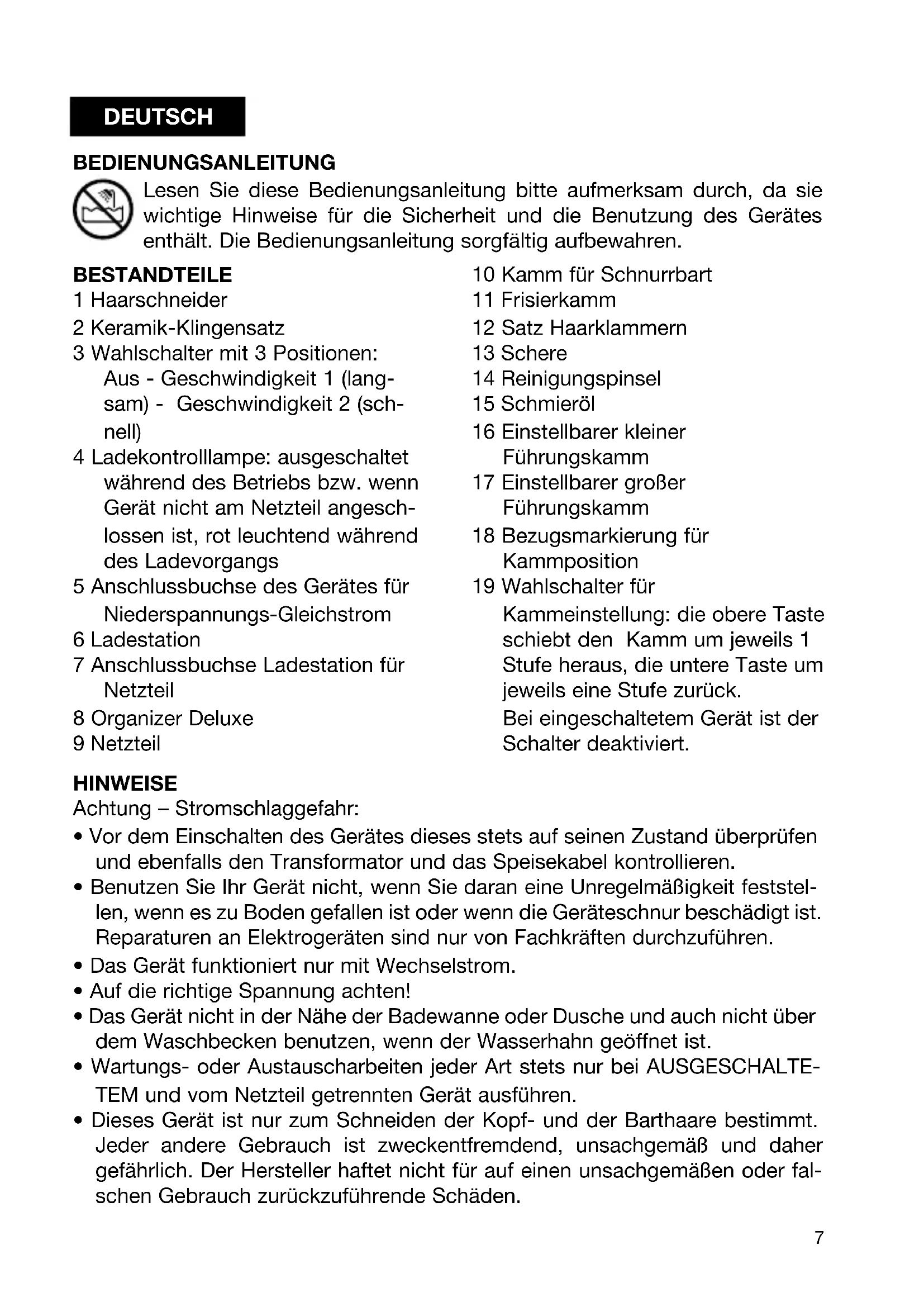- Dieses Gerät ist nur zum Schneiden der Kopf- und der Barthaare bestimmt. Jeder andere Gebrauch ist zweckentfremdend, unsachgemäß und daher gefährlich. Der Hersteller haftet nicht für auf einen unsachgemäßen oder fal- schen Gebrauch zurückzuführende Schäden. BESTANDTEILE 1 Haarschneider 2 Keramik-Klingensatz 3 Wahlschalter mit 3 Positionen: Aus - Geschwindigkeit 1 (lang- sam) - Geschwindigkeit 2 (sch- nell) 4 Ladekontrolllampe: ausgeschaltet während des Betriebs bzw. wenn Gerät nicht am Netzteil angesch- lossen ist, rot leuchtend während des Ladevorgangs 5 Anschlussbuchse des Gerätes für Niederspannungs-Gleichstrom 6 Ladestation 7 Anschlussbuchse Ladestation für Netzteil 8 Organizer Deluxe 9 Netzteil 10 Kamm für Schnurrbart 11 Frisierkamm 12 Satz Haarklammern 13 Schere 14 Reinigungspinsel 15 Schmieröl 16 Einstellbarer kleiner Führungskamm 17 Einstellbarer großer Führungskamm 18 Bezugsmarkierung für Kammposition 19 Wahlschalter für Kammeinstellung: die obere Taste schiebt den Kamm um jeweils 1 Stufe heraus, die untere Taste um jeweils eine Stufe zurück. Bei eingeschaltetem Gerät ist der Schalter deaktiviert. DEUTSCH 00060452 INTERNO 7-11-2005 14:43 Pagina 78
