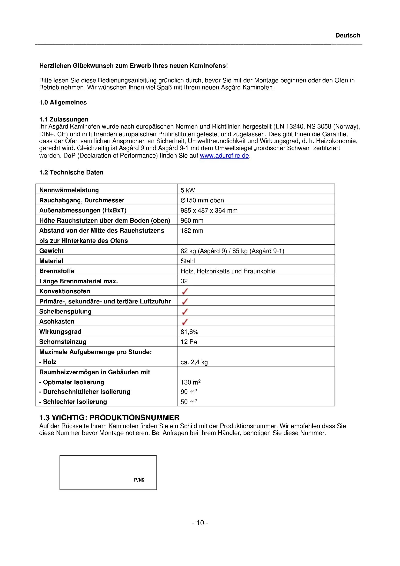 Auf der Rückseite Ihrem Kaminofen finden Sie ein Schild mit der Produktionsnummer. Wir empfehlen dass Sie diese Nummer bevor Montage notieren. Bei Anfragen bei Ihrem Händler, benötigen Sie diese Nummer. Deutsch P/Nr._______________________________________________________________________________________________________________________________