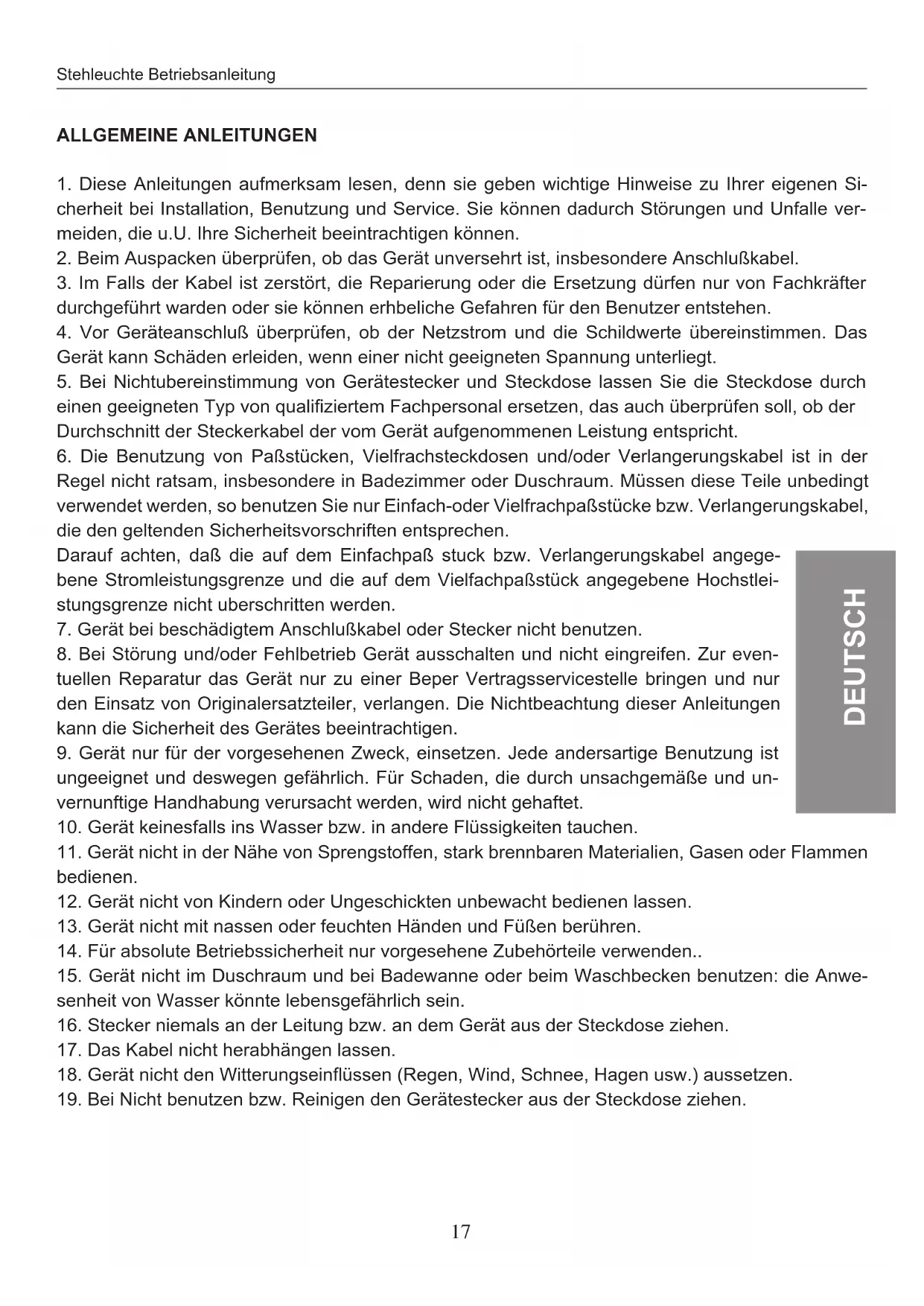 8. Bei Störung und/oder Fehlbetrieb Gerät ausschalten und nicht eingreifen. Zur eventuellen Reparatur das Gerät nur zu einer Beper Vertragservicestelle bringen und nur den Einsatz von Originalersatzteiler, verlangen. Die Nichtbeachtung dieser Anleitungen kann die Sicherheit des Gerätes beeintrachtigen.