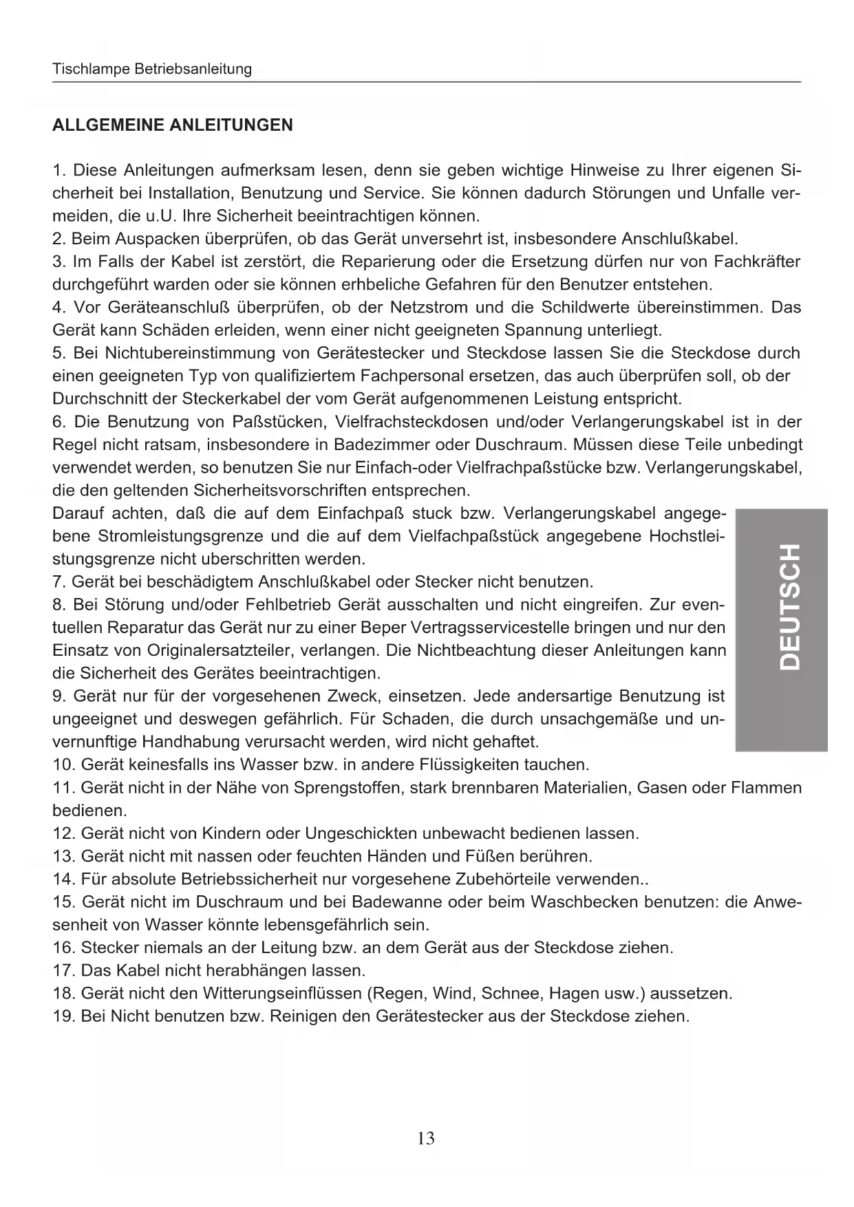 TISCHLAMPE - BETRIEBSANLEITUNG