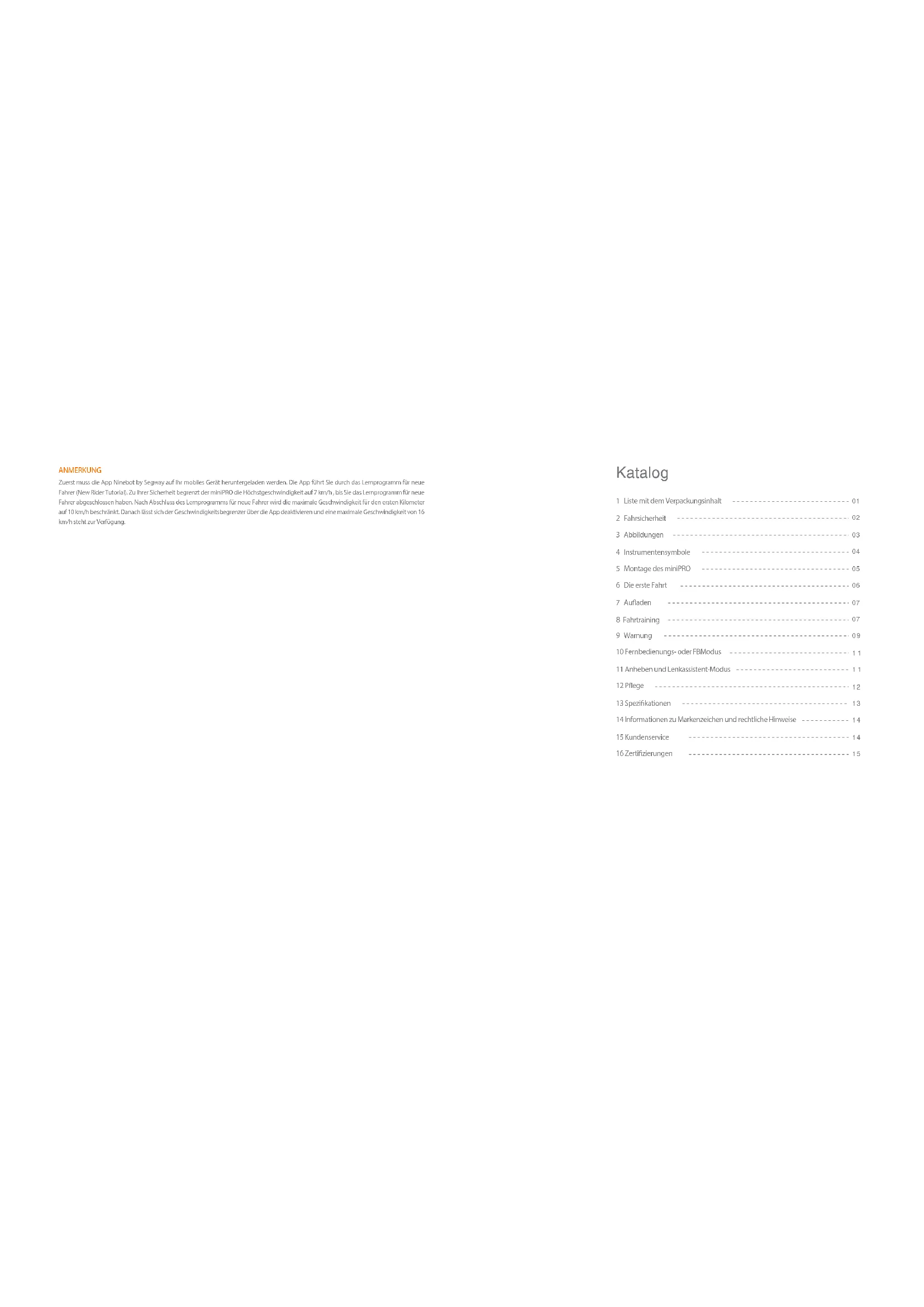 Der Hersteller behält sich jederzeit das Recht auf Änderungen am miniPRO, die Veröffentlichung von Firmware-Updates und die Akquisitionierung des Handbuchs vor. Unler www.sogway.com konn Sie die neueson Berufznormalien herunterladen und Videos über die sichere Verwendung sein. Die App Nineoot by Segway must installiert werden, damit sie dem Lernprogramm für neue Fahrer folgen. Ihr miniPRO aktivieren und die neuesten Updates und Sicherheitsinweis erhalten konnen. www.sogway.com EU201607-V1.0