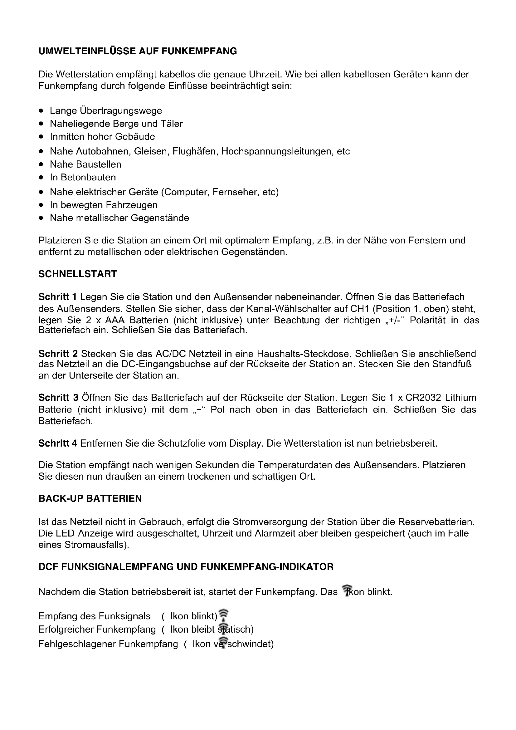 AUßENTEMPERATUR-SENDER LED LED RESET RESET (NEUSTART) STAND STANDFUß CHANNEL 1 CHANNEL 2 CHANNEL 3 KANAL 1 KANAL 2 KANAL 3 INSERT 2 x AAA BATTERIES 2 x AAA BATTERIEN EINLEGENUMWELTEINFLÜSSE AUF FUNKEMPFANG Die Wetterstation empfängt kabellos die genaue Uhrzeit. Wie bei allen kabellosen Geräten kann der Funkempfang durch folgende Einflüsse beeinträchtigt sein: x Lange Übertragungswege x Naheliegende Berge und Täler x Inmitten hoher Gebäude x Nahe Autobahnen, Gleisen, Flughäfen, Hochspannungsleitungen, etc x Nahe Baustellen x In Betonbauten x Nahe elektrischer Geräte (Computer, Fernseher, etc) x In bewegten Fahrzeugen x Nahe metallischer Gegenstände Platzieren Sie die Station an einem Ort mit optimalem Empfang, z.B. in der Nähe von Fenstern und entfernt zu metallischen oder elektrischen Gegenständen. SCHNELLSTART Schritt 1 Legen Sie die Station und den Außensender nebeneinander. Öffnen Sie das Batteriefach des Außensenders. Stellen Sie sicher, dass der Kanal-Wählschalter auf CH1 (Position 1, oben) steht, legen Sie 2 x AAA Batterien (nicht inklusive) unter Beachtung der richtigen „+/-