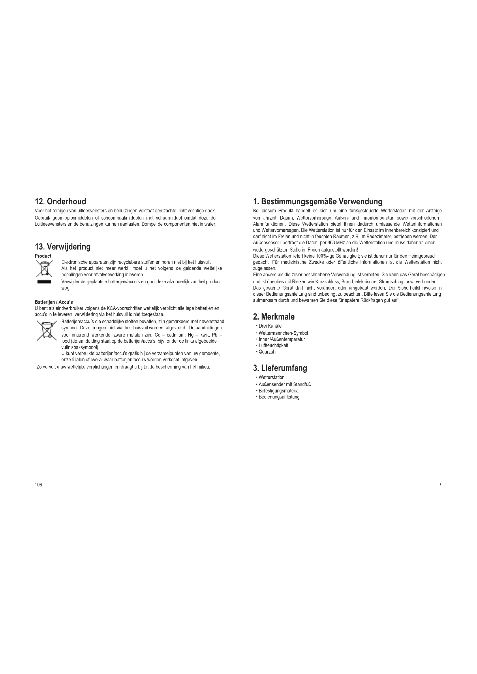 werden, sind die Batterien in den dritten Außensender einzulegen. Innerhalb von 2 Minuten müssen nun die Daten des dritten Außensenders („Kanal 3“) zur Anzeige kommen. Werden die Daten des dritten Außensenders korrekt empfangen, so schaltet das Kanalsymbol auf „1“ zurück. Ist dies nicht der Fall, so muss eine erneute Grundeinstellung ab Schritt 1 vorgenommen werden. Die Batterien sollten spätestens innerhalb von 10 Sekunden nach Empfang der Außenbereichsdaten des zweiten Außensenders in den dritten Außensender eingelegt werden.
