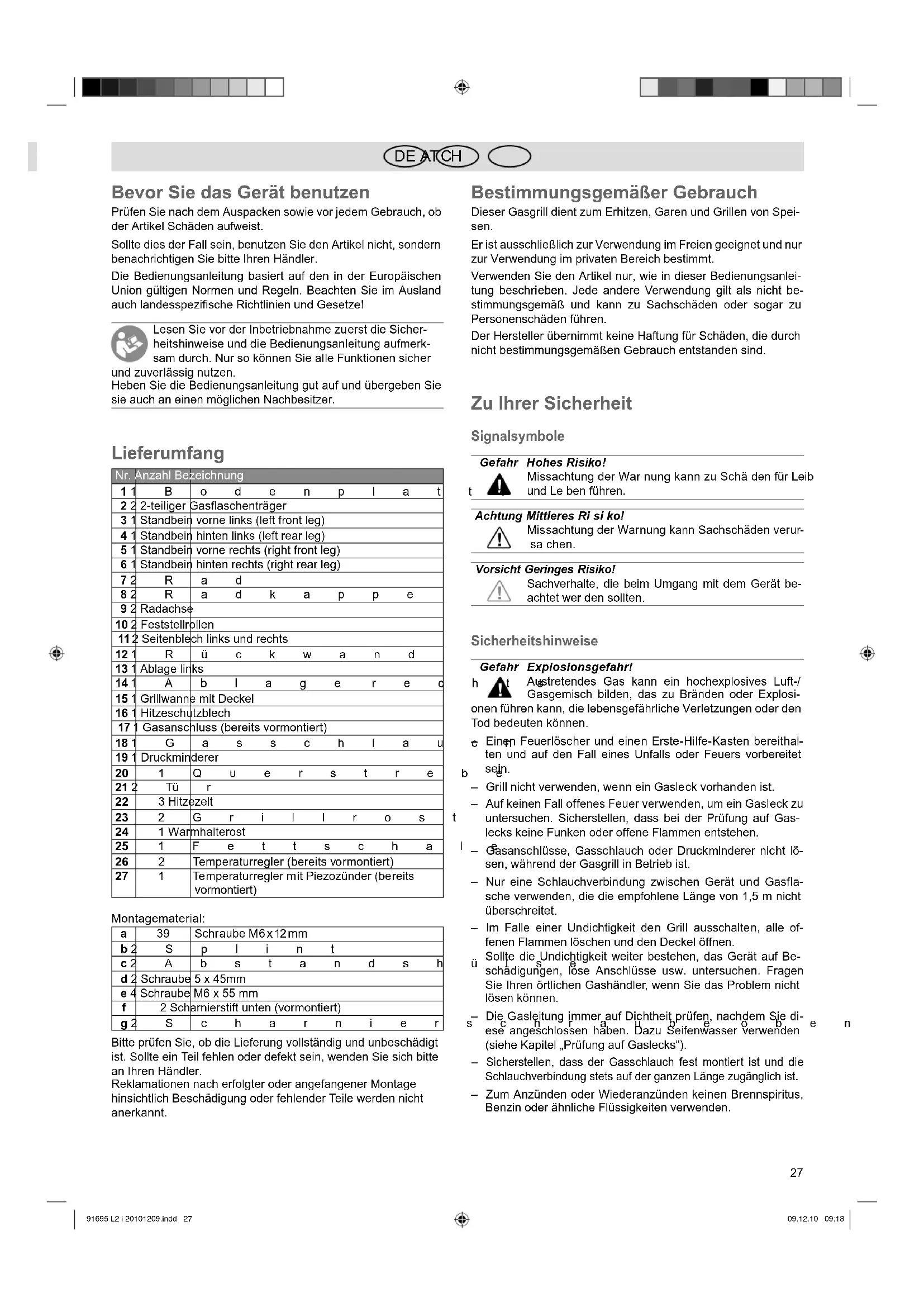 DE AT CH Bevor Sie das Gerät benutzen Prüfen Sie nach dem Auspacken sowie vor jedem Gebrauch, ob der Artikel Schäden aufweist. Sollte dies der Fall sein, benutzen Sie den Artikel nicht, sondern benachrichtigen Sie bitte Ihren Händler. Die Bedienungsanleitung basiert auf den in der Europäischen Union gültigen Normen und Regeln. Beachten Sie im Ausland auch landesspezifische Richtlinien und Gesetze! Le sen Sie vor der Inbetriebnahme zu erst die Si cher- heits hin wei se und die Bedienungsan lei tung aufmerk- sam durch. Nur so können Sie alle Funk tio nen si cher und zu ver läs sig nut zen. Heben Sie die Bedienungsanleitung gut auf und übergeben Sie sie auch an einen möglichen Nachbesitzer. Lieferumfang Nr. Anzahl Bezeichnung 1 1Bodenplatte 2 2 2-teiliger Gasflaschenträger 3 1 Standbein vorne links (left front leg) 4 1 Standbein hinten links (left rear leg) 5 1 Standbein vorne rechts (right front leg) 6 1 Standbein hinten rechts (right rear leg) 7 2Rad 8 2Radkappe 9 2 Radachse 10 2 Feststellrollen 11 2 Seitenblech links und rechts 12 1Rückwand 13 1 Ablage links 14 1Ablage rechts 15 1 Grillwanne mit Deckel 16 1 Hitzeschutzblech 17 1 Gasanschluss (bereits vormontiert) 18 1Gasschlauch 19 1 Druckminderer 20 1Querstrebe 21 2Tür 22 3 Hitzezelt 23 2Grillrost 24 1 Warmhalterost 25 1Fettschale 26 2 Temperaturregler (bereits vormontiert) 27 1 Temperaturregler mit Piezozünder (bereits vormontiert) Montagematerial: a 39 Schraube M6 x 12 mm b 2Splint c 2Abstandshülse d 2 Schraube 5 x 45mm e 4 Schraube M6 x 55 mm f 2 Scharnierstift unten (vormontiert) g 2Scharnierschraube oben Bitte prüfen Sie, ob die Lieferung vollständig und unbeschädigt ist. Sollte ein Teil fehlen oder defekt sein, wenden Sie sich bitte an Ihren Händler. Reklamationen nach erfolgter oder angefangener Montage hinsichtlich Beschädigung oder fehlender Teile werden nicht anerkannt. Bestimmungsgemäßer Gebrauch Dieser Gasgrill dient zum Erhitzen, Garen und Grillen von Spei- sen. Er ist ausschließlich zur Verwendung im Freien geeignet und nur zur Verwendung im privaten Bereich bestimmt. Verwenden Sie den Artikel nur, wie in dieser Bedienungsanlei- tung beschrieben. Jede andere Verwendung gilt als nicht be- stimmungsgemäß und kann zu Sachschäden oder sogar zu Personenschäden führen. Der Hersteller übernimmt keine Haftung für Schäden, die durch nicht bestimmungsgemäßen Gebrauch entstanden sind. Zu Ihrer Sicherheit Signalsymbole Gefahr Hohes Ri si ko! Missachtung der War nung kann zu Schä den für Leib und Le ben führen. Achtung Mittleres Ri si ko! Missachtung der Warnung kann Sach schä den ver ur- sa chen. Vorsicht Geringes Risiko! Sachverhalte, die beim Umgang mit dem Gerät be- achtet wer den sollten. Sicherheitshinweise Gefahr Explosionsgefahr! Austretendes Gas kann ein hochexplosives Luft-/ Gasgemisch bilden, das zu Bränden oder Explosi- onen führen kann, die lebensgefährliche Verletzungen oder den Tod bedeuten können. – Einen Feuerlöscher und einen Erste-Hilfe-Kasten bereithal- ten und auf den Fall eines Unfalls oder Feuers vorbereitet sein. – Grill nicht verwenden, wenn ein Gasleck vorhanden ist. – Auf keinen Fall offenes Feuer verwenden, um ein Gasleck zu untersuchen. Sicherstellen, dass bei der Prüfung auf Gas- lecks keine Funken oder offene Flammen entstehen. – Gasanschlüsse, Gasschlauch oder Druckminderer nicht lö- sen, während der Gasgrill in Betrieb ist. – Nur eine Schlauchverbindung zwischen Gerät und Gasfla- sche verwenden, die die empfohlene Länge von 1,5 m nicht überschreitet. – Im Falle einer Undichtigkeit den Grill ausschalten, alle of- fenen Flammen löschen und den Deckel öffnen. Sollte die Undichtigkeit weiter bestehen, das Gerät auf Be- schädigungen, lose Anschlüsse usw. untersuchen. Fragen Sie Ihren örtlichen Gashändler, wenn Sie das Problem nicht lösen können. – Die Gasleitung immer auf Dichtheit prüfen, nachdem Sie di- ese angeschlossen haben. Dazu Seifenwasser verwenden (siehe Kapitel „Prüfung auf Gaslecks“). – Sicherstellen, dass der Gasschlauch fest montiert ist und die Schlauchverbindung stets auf der ganzen Länge zugänglich ist. – Zum Anzünden oder Wiederanzünden keinen Brennspiritus, Benzin oder ähnliche Flüssigkeiten verwenden. 91695 L2 i 20101209.indd 27 91695 L2 i 20101209.indd 27