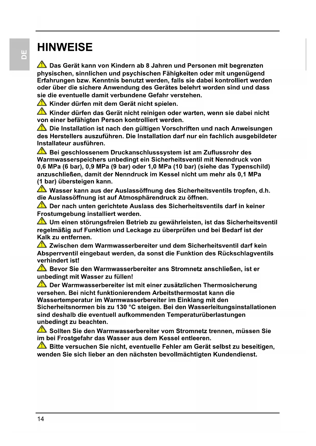 HINWEISE Das Gerät kann von Kindern ab 8 Jahren und Personen mit begrenzten physischen, sinnlichen und psychischen Fähigkeiten oder mit ungenügend Erfahrungen bzw. Kenntnis benutzt werden, falls sie dabei kontrolliert werden oder über die sichere Anwendung des Gerätes belehrt worden sind und dass sie die eventuelle damit verbundene Gefahr verstehen. Kinder dürfen mit dem Gerät nicht spielen. Kinder dürfen das Gerät nicht reinigen oder warten, wenn sie dabei nicht von einer befähigten Person kontrolliert werden. Die Installation ist nach den gültigen Vorschriften und nach Anweisungen des Herstellers auszuführen. Die Installation darf nur ein fachlich ausgebildeter Installateur ausführen. Bei geschlossenem Druckanschlusssystem ist am Zuflussrohr des Warmwasserspeichers unbedingt ein Sicherheitsventil mit Nenndruck von 0,6 MPa (6 bar), 0,9 MPa (9 bar) oder 1,0 MPa (10 bar) (siehe das Typenschild) anzuschließen, damit der Nenndruck im Kessel nicht um mehr als 0,1 MPa (1 bar) übersteigen kann. Wasser kann aus der Auslassöffnung des Sicherheitsventils tropfen, d.h. die Auslassöffnung ist auf Atmosphärendruck zu öffnen. Der nach unten gerichtete Auslass des Sicherheitsventils darf in keiner Frostumgebung installiert werden. Um einen störungsfreien Betrieb zu gewährleisten, ist das Sicherheitsventil regelmäßig auf Funktion und Leckage zu überprüfen und bei Bedarf ist der Kalk zu entfernen. Zwischen dem Warmwasserbereiter und dem Sicherheitsventil darf kein Absperrventil eingebaut werden, da sonst die Funktion des Rückschlagventils verhindert ist! Bevor Sie den Warmwasserbereiter ans Stromnetz anschließen, ist er unbedingt mit Wasser zu füllen! Der Warmwasserbereiter ist mit einer zusätzlichen Thermosicherung versehen. Bei nicht funktionierendem Arbeitsthermostat kann die Wassertemperatur im Warmwasserbereiter im Einklang mit den Sicherheitsnormen bis zu 130 °C steigen. Bei den Wasserleitungsinstallationen sind deshalb die eventuell aufkommenden Temperaturüberlastungen unbedingt zu beachten. Sollten Sie den Warmwasserbereiter vom Stromnetz trennen, müssen Sie im bei Frostgefahr das Wasser aus dem Kessel entleeren. Bitte versuchen Sie nicht, eventuelle Fehler am Gerät selbst zu beseitigen, wenden Sie sich lieber an den nächsten bevollmächtigten Kundendienst.DE