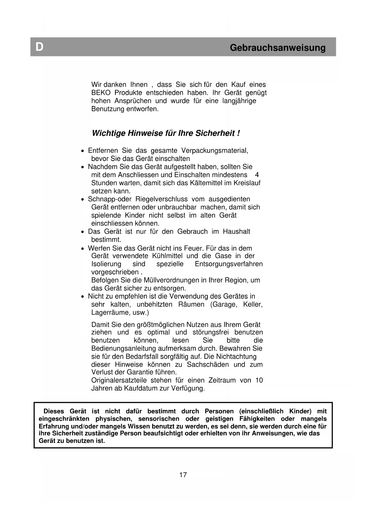 Dieses Gerät ist nicht dafür bestimmt durch Personen (einschließlich Kinder) mit eingeschränkten physischen, sensorischen oder geistigen Fähigkeiten oder mangels Erfahrung und/oder mangels Wissen benutzt zu werden, es sei denn, sie werden durch eine für ihre Sicherheit zuständige Person beaufsichtigt oder erhielten von ihr Anweisungen, wie das Gerät zu benutzen ist.