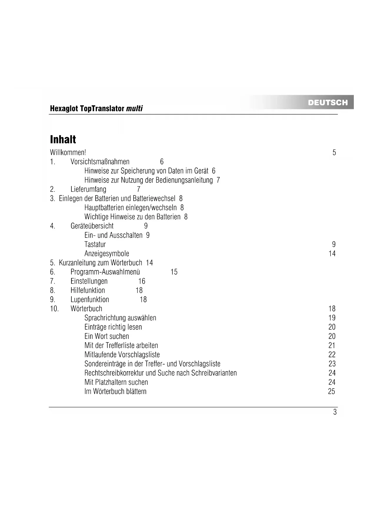 DEUTSCH Willkommen! Vielen Dank, dass Sie sich für den Hexaglot TopTranslator multi entschieden haben. Sie besitzen damit ein modernes und äußerst leistungsfähiges elektronisches Wörterbuch, das Ihnen sicherlich sehr viel Freude machen wird. Der Hexaglot TopTranslator multi ist so handlich, dass Sie ihn überallhin mitnehmen können, und bietet Ihnen sofort und unkompliziert Zugriff auf eine ungeheure Menge Stichwörter, Wendungen, Übersetzun- gen und Wortformen, die mit Erfahrung und Kompetenz ausgewählt und zusammengestellt wurden. Daneben bietet Ihnen der Hexaglot TopTranslator multi noch viele weitere nützliche Funktionen: Das Wörterbuch verfügt zusätzlich über einen umfangreichen gastronomischen Spezialwortschatz; zu den allermeisten Stichwörtern lassen sich Synonyme anzeigen, die auf Wunsch auch bei der Suche berück- sichtigt werden; eine mitlaufende Suche erlaubt schnellsten Zugriff auf das gewünschte Wort; ein Benut- zerwörterbuch erlaubt die zusätzliche Aufnahme eigener Wörterbucheinträge; Sie können individuelle Memos oder Adressen speichern; ein leistungsfähiger Universalumrechner erlaubt Ihnen das bequeme Umrechnen zwischen vielen Einheiten; mit dem integrierten Taschenrechner lassen sich Berechnungen durchführen; und zu guter Letzt sorgen integrierte Spiele für Spaß und Unterhaltung unterwegs. Bitte nehmen Sie sich ein paar Minuten Zeit, um diese Bedienungsanleitung vor dem ersten Benutzen sorgfältig und vollständig durchzulesen, damit Sie auch alle Funktionen dieses Gerätes ausschöpfen können und viele Jahre Freude an unserem Gerät haben. Bitte bewahren Sie diese Bedienungsanleitung zum späteren Nachschlagen gut auf. Hexaglot wünscht Ihnen viel Erfolg beim Einsatz Ihres Hexaglot TopTranslator multi!Hexaglot TopTranslator multi