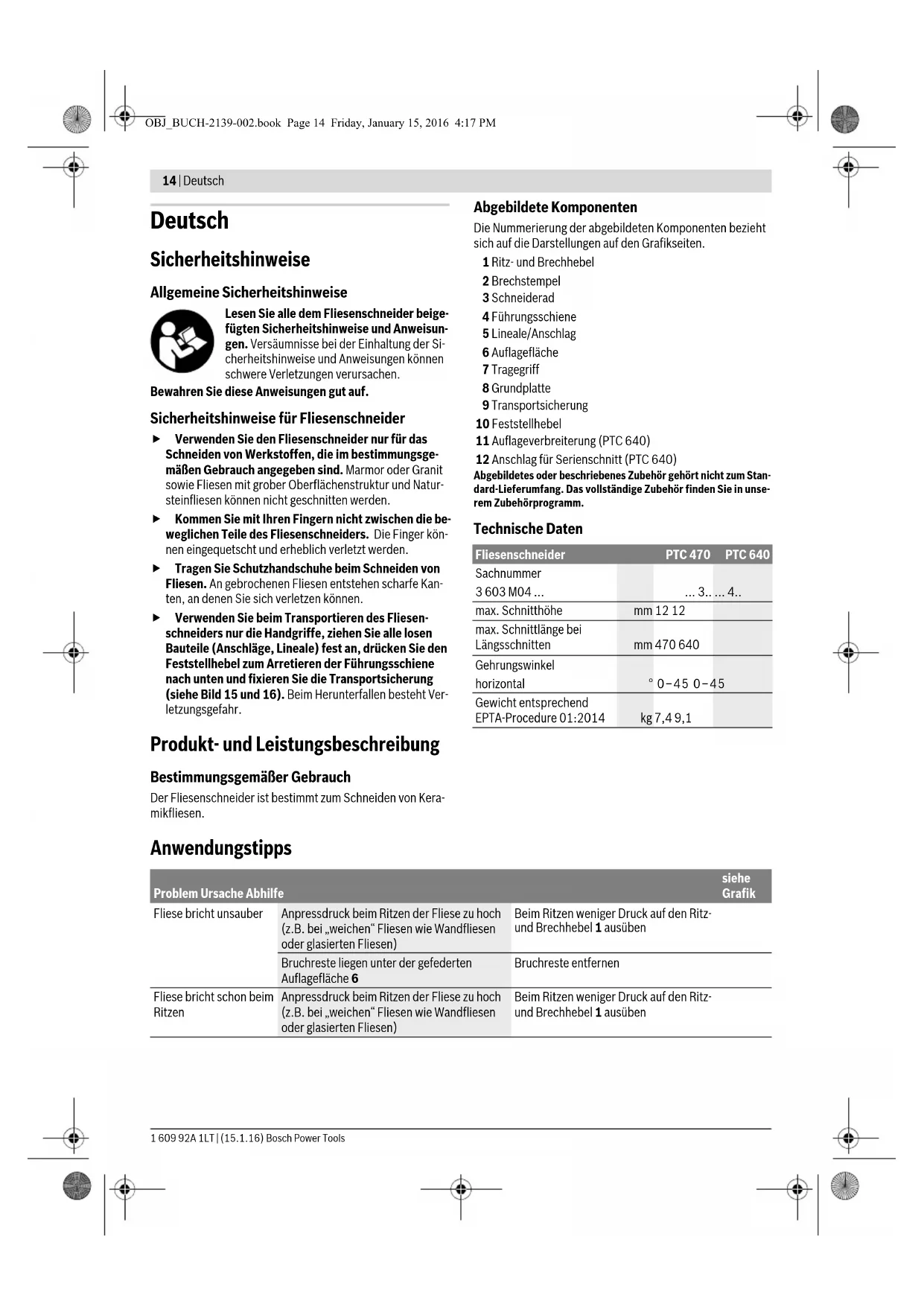 OBJ_BUCH-2139-002.book Page 13 Friday, January 15, 2016 4:17 PM14 | Deutsch 1 609 92A 1LT | (15.1.16) Bosch Power Tools Deutsch Sicherheitshinweise Allgemeine Sicherheitshinweise Lesen Sie alle dem Fliesenschneider beige- fügten Sicherheitshinweise und Anweisun- gen. Versäumnisse bei der Einhaltung der Si- cherheitshinweise und Anweisungen können schwere Verletzungen verursachen. Bewahren Sie diese Anweisungen gut auf. Sicherheitshinweise für Fliesenschneider Verwenden Sie den Fliesenschneider nur für das Schneiden von Werkstoffen, die im bestimmungsge- mäßen Gebrauch angegeben sind. Marmor oder Granit sowie Fliesen mit grober Oberflächenstruktur und Natur- steinfliesen können nicht geschnitten werden. Kommen Sie mit Ihren Fingern nicht zwischen die be- weglichen Teile des Fliesenschneiders. Die Finger kön- nen eingequetscht und erheblich verletzt werden. Tragen Sie Schutzhandschuhe beim Schneiden von Fliesen. An gebrochenen Fliesen entstehen scharfe Kan- ten, an denen Sie sich verletzen können. Verwenden Sie beim Transportieren des Fliesen- schneiders nur die Handgriffe, ziehen Sie alle losen Bauteile (Anschläge, Lineale) fest an, drücken Sie den Feststellhebel zum Arretieren der Führungsschiene nach unten und fixieren Sie die Transportsicherung (siehe Bild 15 und 16). Beim Herunterfallen besteht Ver- letzungsgefahr. Produkt- und Leistungsbeschreibung Bestimmungsgemäßer Gebrauch Der Fliesenschneider ist bestimmt zum Schneiden von Kera- mikfliesen. Abgebildete Komponenten Die Nummerierung der abgebildeten Komponenten bezieht sich auf die Darstellungen auf den Grafikseiten. 1 Ritz- und Brechhebel 2 Brechstempel 3 Schneiderad 4 Führungsschiene 5 Lineale/Anschlag 6 Auflagefläche 7 Tragegriff 8 Grundplatte 9 Transportsicherung 10 Feststellhebel 11 Auflageverbreiterung (PTC 640) 12 Anschlag für Serienschnitt (PTC 640) Abgebildetes oder beschriebenes Zubehör gehört nicht zum Stan-dard-Lieferumfang. Das vollständige Zubehör finden Sie in unse-rem Zubehörprogramm. Technische Daten Anwendungstipps Fliesenschneider PTC 470 PTC 640 Sachnummer 3 603 M04 ...
