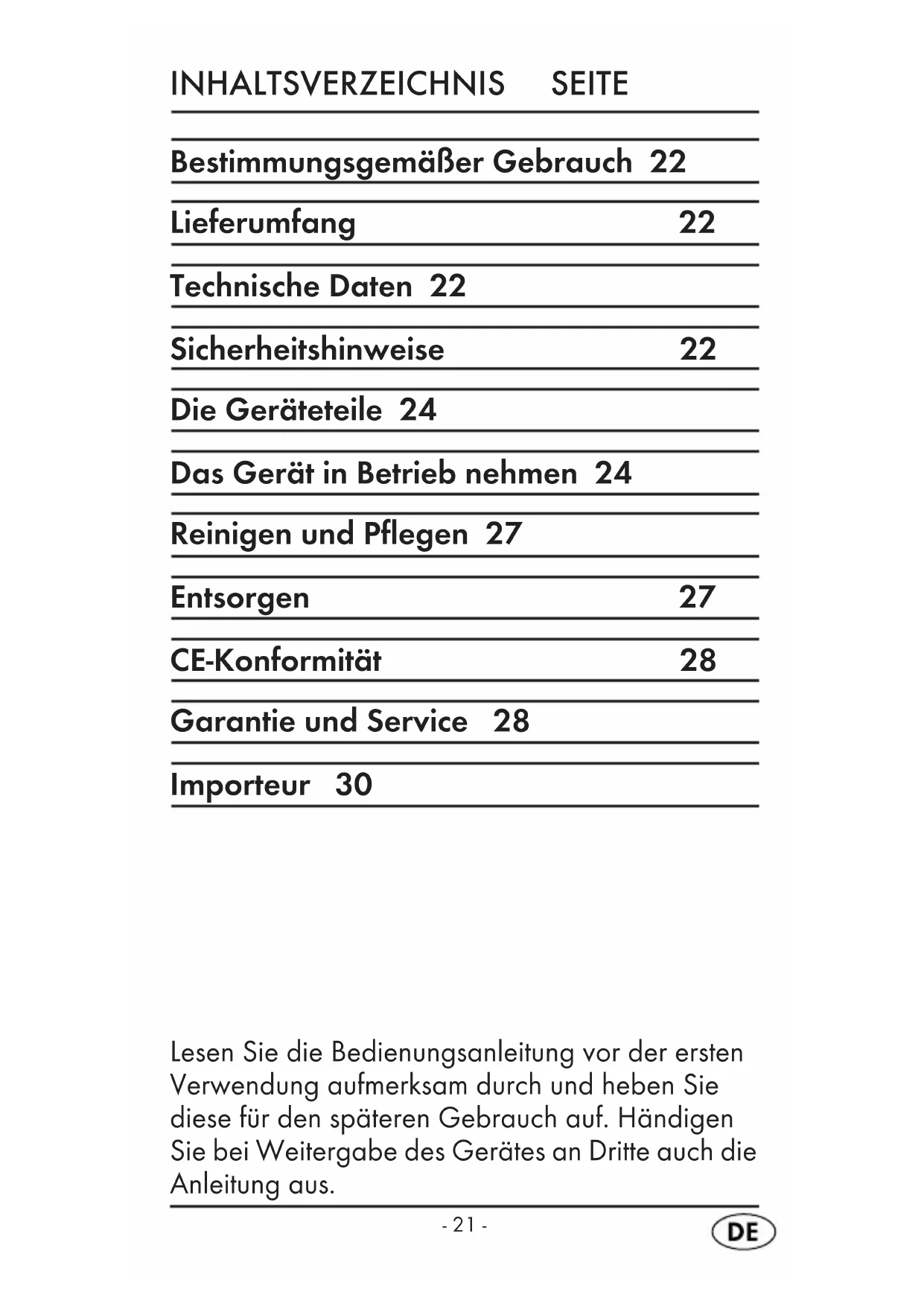 - Bei Verschmutzungen an schwer zugängli- chen Stellen verwenden Sie den Bürstenaufsatz e mit konisch geformten Borsten, z.B. für das Reinigen von Lüftungsschlitzen. Setzen Sie den gewünschten Bürstenaufsatz > e so auf den Flansch q für den Bürstenaufsatz, dass die Nuten des Aufsatzes in die Führungs- schienen am Flansch q gleiten. Dann drehen Sie den Bürstenaufsatz > e um ca. 45° im Uhrzeigersinn, um diesen auf dem Flansch zu verriegeln. Das Pfeilsymbol auf dem Bürstenaufsatz e muss dann auf den blauen Punkt am Flansch q zeigen. Bringen Sie ggf. ein für den Reinigungsvorgang > geeignetes Reinigungsmittel auf die Borsten auf und setzen Sie das Gerät an die zu reinigende Stelle an. Bei hartnäckigen Verschmutzungen, besonders bei Auto und Motorrad ist oft ein Lösungsmittel nötig. Buch_E37677_LB2.indb 25Buch_E37677_LB2.indb 25 08.10.2009 11:05:37 Uhr08.10.2009 11:05:37 Uhr- 26 - Vorsicht! Durch die rotierenden Borsten können Schmutz- partikel oder Reinigungsmittel weggeschleudert werden. Schützen Sie Ihre Augen mit einer Schutz- brille beim Gebrauch dieses Gerätes! Achten Sie darauf, Ihre Kleidung nicht zu verschmutzen. Wenn Sie auf den Ein-/Ausschalter > w drücken, rotieren die Borsten so lange, wie Sie den Ein-/ Ausschalter w gedrückt halten. Schieben Sie den Ein-/Ausschalter > w in Rich- tung des Bürstenaufsatzes e, um die Borsten dauerhaft rotieren zu lassen. Bei schwierigen Anwendungssituationen oder > wenn das Gerät an einen schwer erreichbaren Ort stürzen könnte, sollten Sie mit der Arbeits- hand durch die Handschlaufe u greifen, bevor Sie das Gerät verwenden. Schieben Sie den Ein-/Ausschalter > w in seine Ausgangsstellung zurück, um das Rotieren zu beenden. Um einen Bürstenaufsatz > e abzunehmen, dre- hen Sie ihn zunächst um ca. 45° gegen den Uhrzeigersinn, dann nehmen Sie ihn ab. Sollte die Leistung des Gerätes abnehmen, sind > die Batterien verbraucht. Ersetzen Sie diese dann durch frische Batterien gleichen Typs. Buch_E37677_LB2.indb 26Buch_E37677_LB2.indb 26 08.10.2009 11:05:37 Uhr08.10.2009 11:05:37 Uhr- 27 - Reinigen und Pflegen Tauchen Sie die Geräteteile niemals in Wasser oder andere Flüssigkeiten! Lassen Sie auch keine Flüssigkeiten in das Gehäuse dringen. Dies würde das Gerät beschädigen oder einen Kurzschluss verursachen. Nach Gebrauch reinigen Sie die > Bürstenaufsät- ze e mit Wasser und einem milden Reiniger. Reinigen des Bürstenantriebs/Handteils r: Reinigen Sie die Gehäuseoberfläche mit einem leicht angefeuchteten Tuch. Verwenden Sie niemals Benzin, Lösungsmittel oder Reiniger, die Kunststoff angreifen! Entsorgen Werfen Sie das Gerät keinesfalls in den normalen Hausmüll. Dieses Produkt unterliegt der europäischen Richtlinie 2002/96/EC. Reinigungsbürste Entsorgen Sie das Produkt oder Teile davon • über einen zugelassenen Entsorgungsbetrieb oder über Ihre kommunale Entsorgungseinrich- tung. Beachten Sie die aktuell geltenden Vorschriften. • Setzen Sie sich im Zweifelsfall mit Ihrer Entsor- gungseinrichtung in Verbindung. Batterien/Akkus Batterien/Akkus dürfen nicht im Hausmüll ent-• sorgt werden. Buch_E37677_LB2.indb 27Buch_E37677_LB2.indb 27 08.10.2009 11:05:37 Uhr08.10.2009 11:05:37 Uhr- 28 - Batterien/Akkus können Giftstoffe enthalten, die • die Umwelt schädigen. Entsorgen Sie die Batte- rien/Akkus deshalb unbedingt entsprechend der geltenden gesetzlichen Bestimmungen. Jeder Verbraucher ist gesetzlich verpflichtet, • Batterien/Akkus bei einer Sammelstelle seiner Gemeinde, seines Stadtteils oder im Handel abzugeben. Diese Verpflichtung dient dazu, dass Batterien / Akkus einer umweltschonenden Entsorgung zugeführt werden können. Geben Sie Batterien/Akkus nur im entladenen • Zustand zurück. Führen Sie alle Verpackungsmaterialien einer umweltgerechten Entsorgung zu. CE-Konformität Dieses Gerät wurde hinsichtlich Übereinstimmung mit den grundlegenden Anforderungen und den anderen relevanten Vorschriften der EMV-Richtli- nie 2004/108/EC geprüft und genehmigt. Garantie und Service Sie erhalten auf dieses Gerät 3 Jahre Garantie ab Kaufdatum. Das Gerät wurde sorgfältig pro- duziert und vor Anlieferung gewissenhaft geprüft. Bitte bewahren Sie den Kassenbon als Nachweis für den Kauf auf. Bitte setzen Sie sich im Garan- tiefall mit Ihrer Servicestelle telefonisch in Verbin- dung. Nur so kann eine kostenlose Einsendung Ihrer Ware gewährleistet werden. Die Garantieleistung gilt nur für Material- oder Fabrikationsfehler, nicht aber für Transportschä- den, Verschleißteile oder für Beschädigungen an Buch_E37677_LB2.indb 28Buch_E37677_LB2.indb 28 08.10.2009 11:05:37 Uhr08.10.2009 11:05:37 Uhr- 29 - zerbrechlichen Teilen, z. B. Schalter oder Akkus. Das Produkt ist lediglich für den privaten und nicht für den gewerblichen Gebrauch bestimmt. Bei missbräuchlicher und unsachgemäßer Be- handlung, Gewaltanwendung und bei Eingriffen, die nicht von unserer autorisierten Service-Nie- derlassung vorgenommen wurden, erlischt die Garantie. Ihre gesetzlichen Rechte werden durch diese Garantie nicht eingeschränkt. Die Garantiezeit wird durch die Gewährleistung nicht verlängert. Dies gilt auch für ersetzte und re- parierte Teile. Eventuell schon beim Kauf vorhan- dene Schäden und Mängel müssen sofort nach dem Auspacken gemeldet werden, spätestens aber zwei Tage nach Kaufdatum. Nach Ablauf der Garantiezeit anfallende Reparaturen sind kostenpflichtig. Schraven Service- und Dienstleistungs GmbH Tel.: +49 (0) 180 5 008107 (14 Ct/Min. aus dem dt. Festnetz ggf. abweichende Preise aus den Mobilfunknetzen) Fax: +49 (0) 2832 3532 e-mail: support.de@kompernass.com Kompernaß Service Österreich Tel.: 0820 899 913 (0,20 EUR/Min.) e-mail: support.at@kompernass.com Kompernaß Service Switzerland Tel.: 0848 000 525 (max. 0,0807 CHF/Min.) e-mail: support.ch@kompernass.com Buch_E37677_LB2.indb 29Buch_E37677_LB2.indb 29 08.10.2009 11:05:37 Uhr08.10.2009 11:05:37 Uhr- 30 - Importeur KOMPERNASS GMBH BURGSTRASSE 21 44867 
