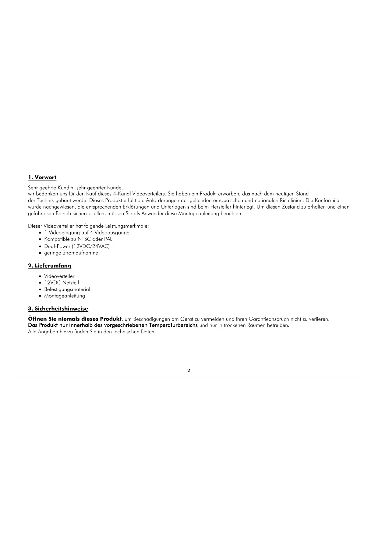 wir bedanken uns für den Kauf these 4-Kanal Videovereilers. Sie haben ein Produkt erworben, das nach dem heutigen Stand der Technik gebaut wurde. Dieses Produkt erfüllt die Anforderungen der geltenden europäischen und nationalen Richtlinien. Die Konformität wurde nachgewiesen, die entsprechenden Erklärungen und Unterlagen sind beim Hersteller hinterlegt. Um diesen Zustand zu erhalten und einen gefahrlosen Betrieb saferzustellen, müssen Sie als Anwender diese Montageanleitung beachten!